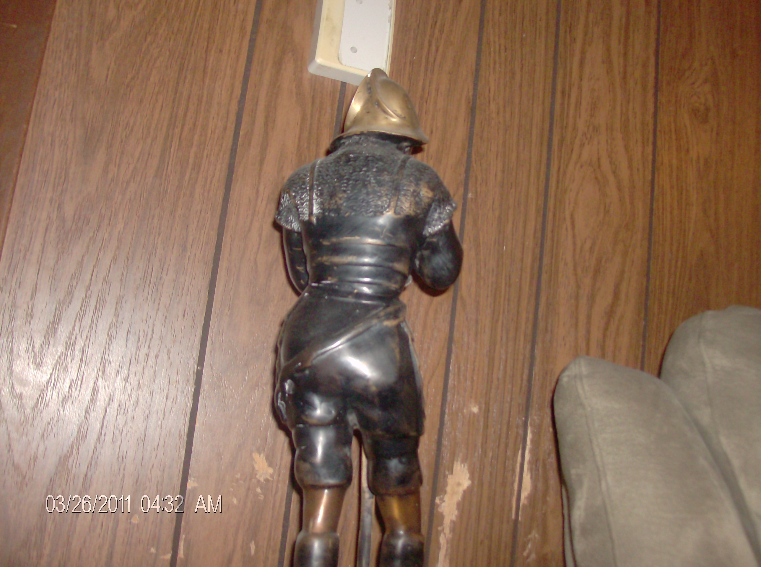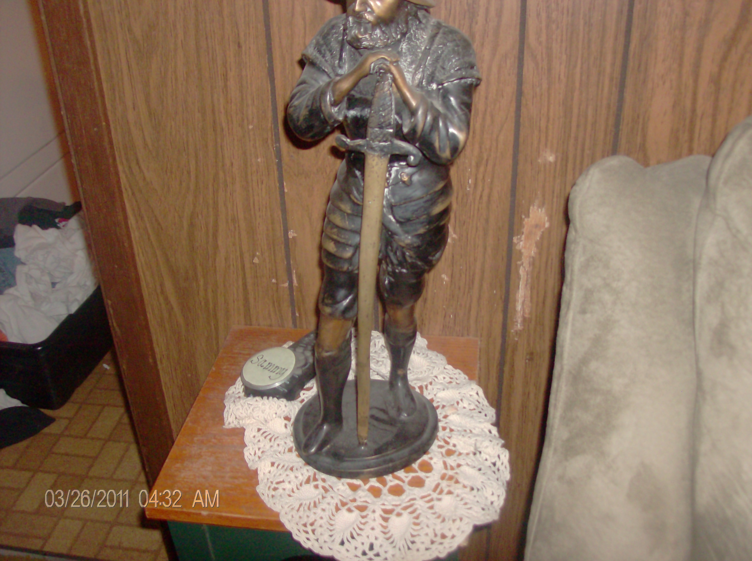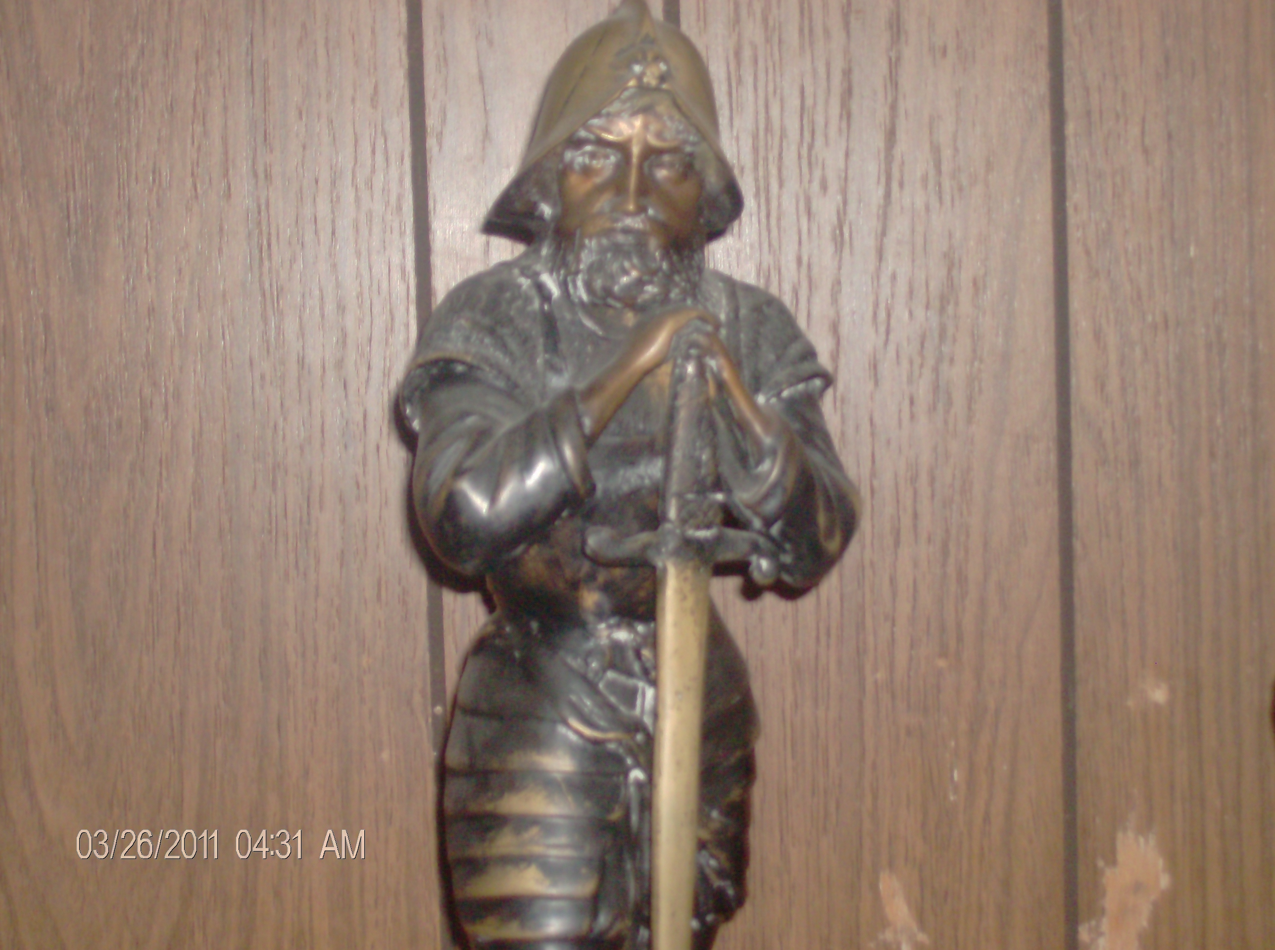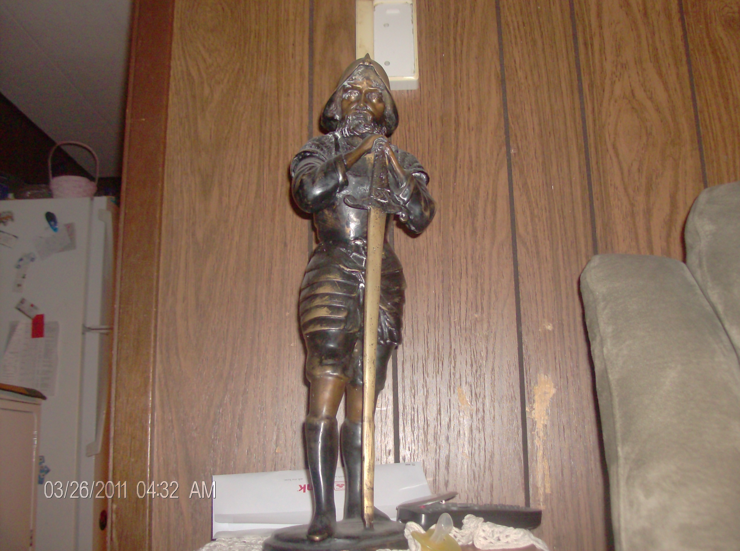 Large heavy brass or bronze statue of conquistador in armor and leaning on sword. About 16 in. tall and about 15 to 18 pounds.