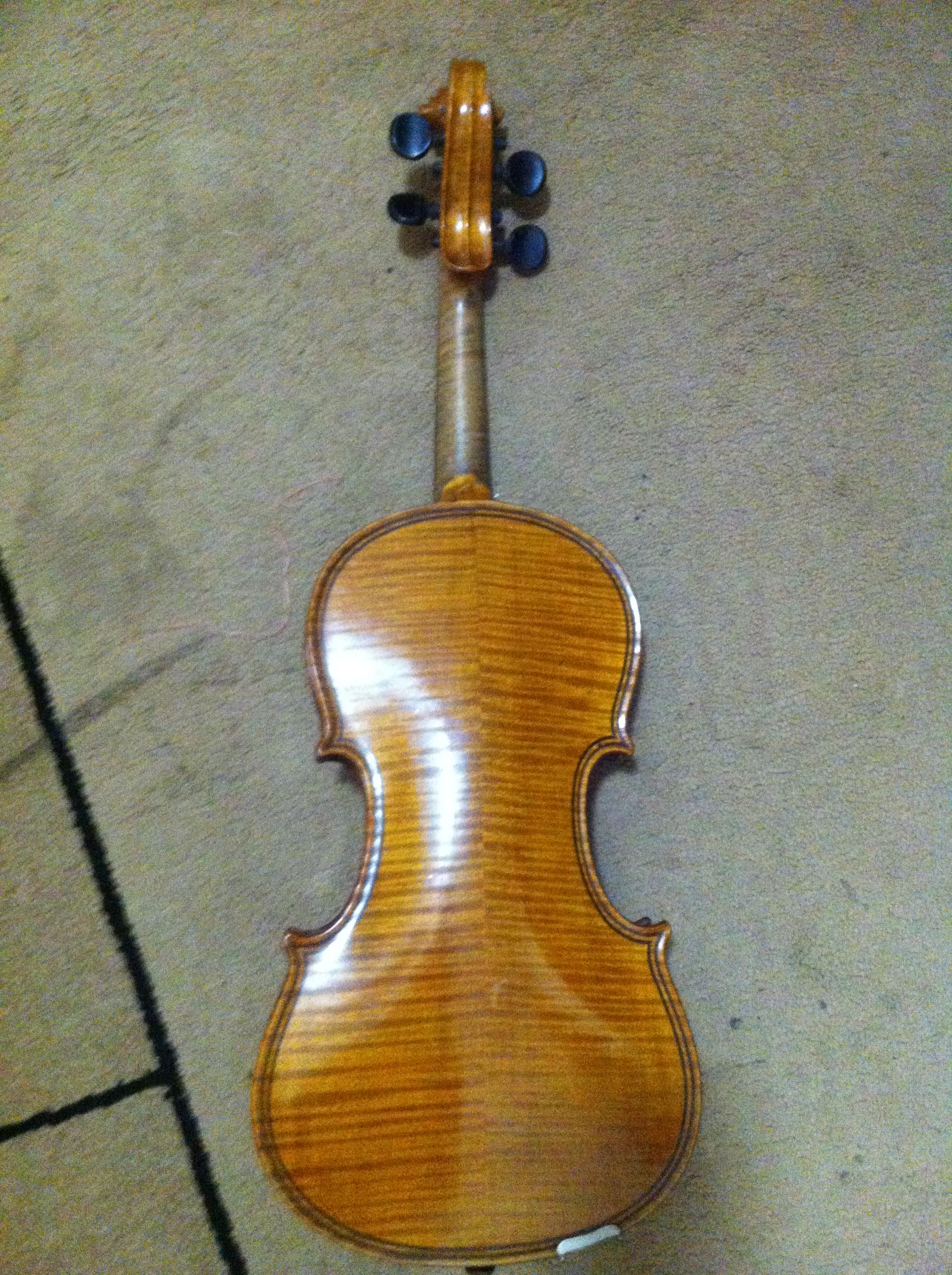 The violin bears the signature scroll on the neck, double purfing, and the back measures 14 1/16th (36 cm). The violin has a two piece back.