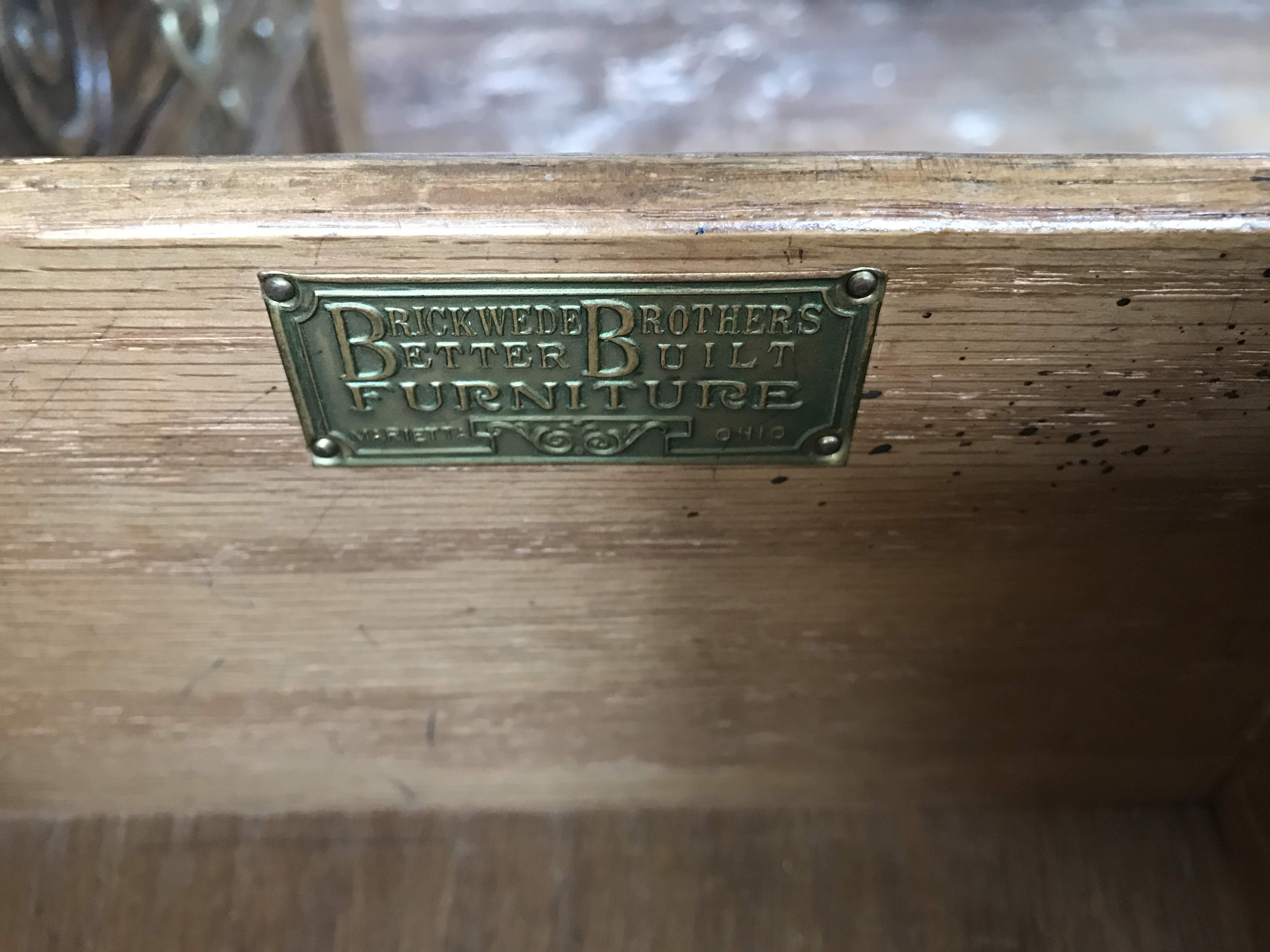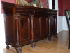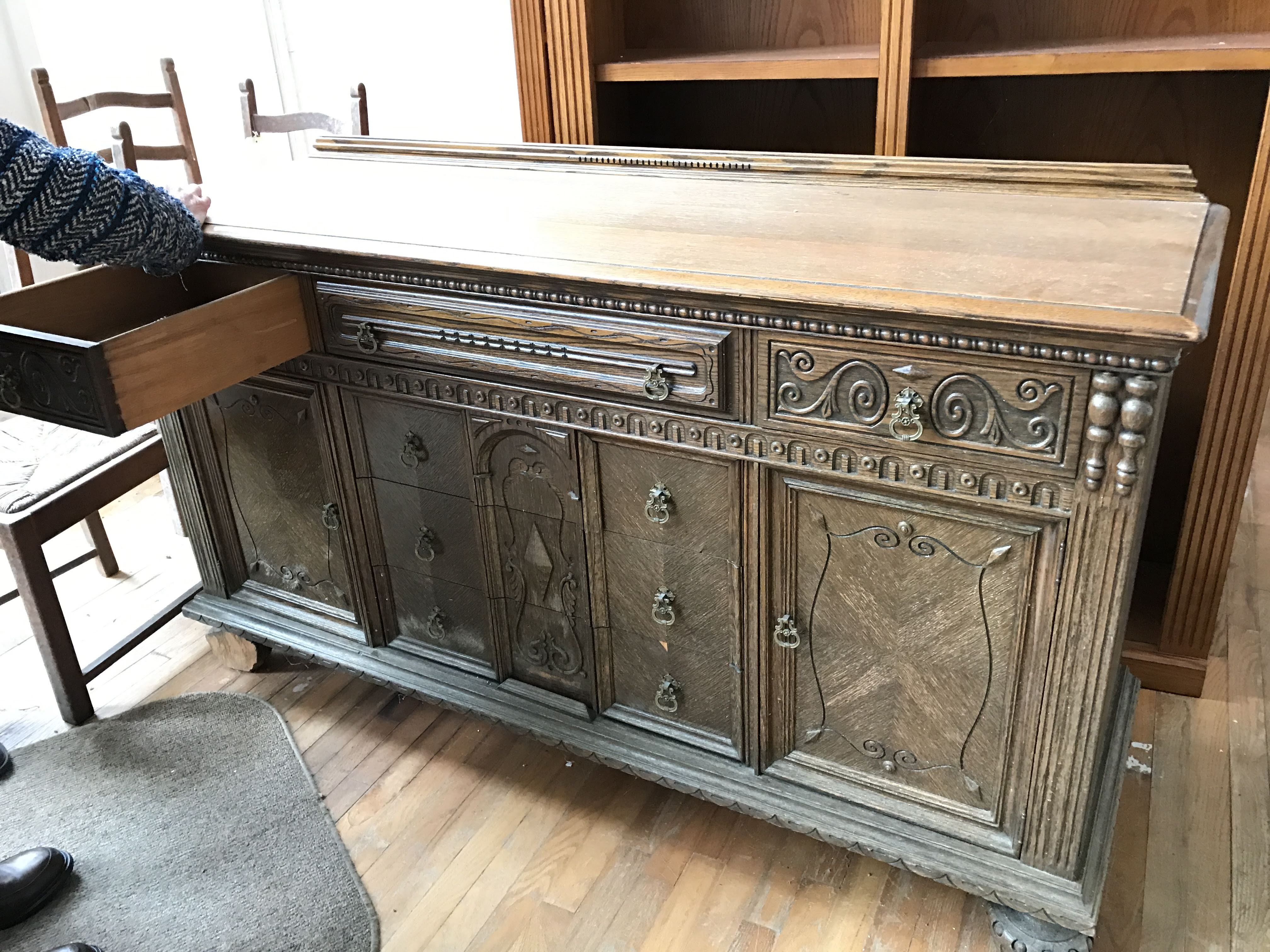 Side board with 6 drawers and 2 cabinet doors. The finish is worn down. Front leg broken.