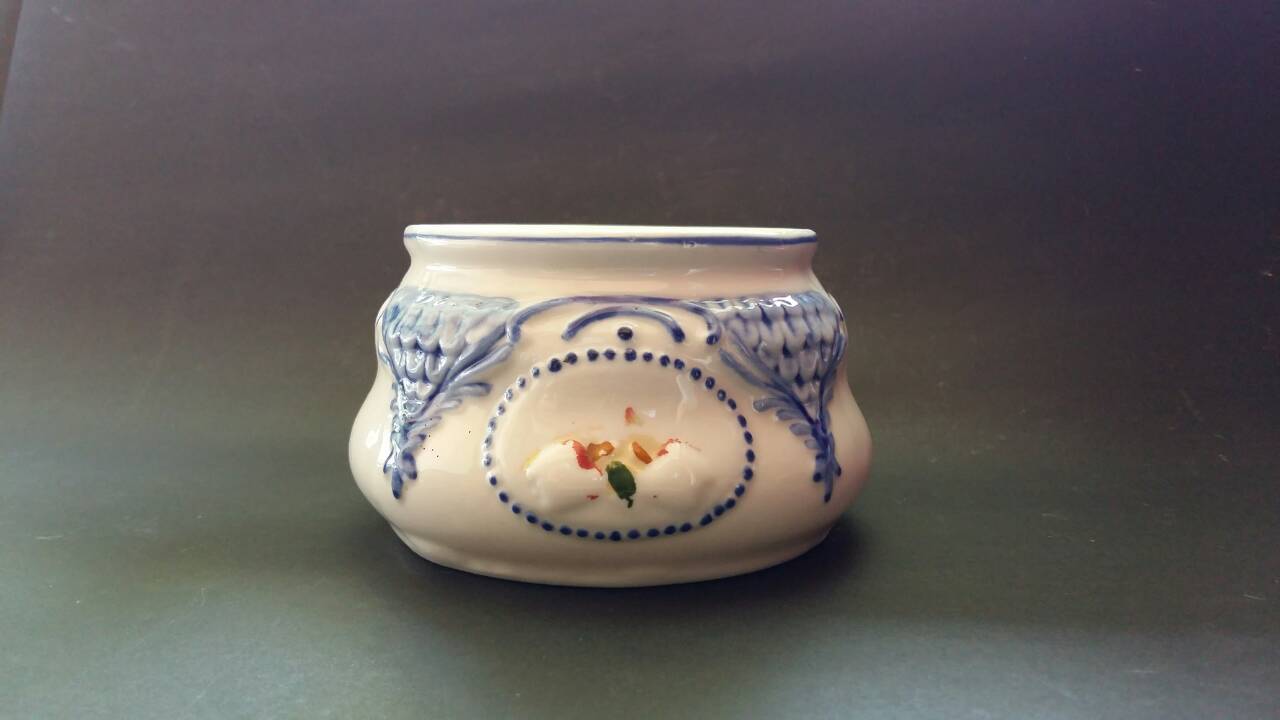 I found this unmarked jam or sugar pot in the Sunday Marked. It has no lid. Most of the few over glaze enamel is already gone. The plain molded, hard and rather havy pot is translucent (porcelain? bone china?). The mold had three parts. Because of the kind of sprigs and also the other deco I thought it could be pre Victorian - or do I have a fake since food rim and top rim aren't glazed? I was told that the piece came from Penang in Malaysia (British export?). In the Internet I couldn't find anything.