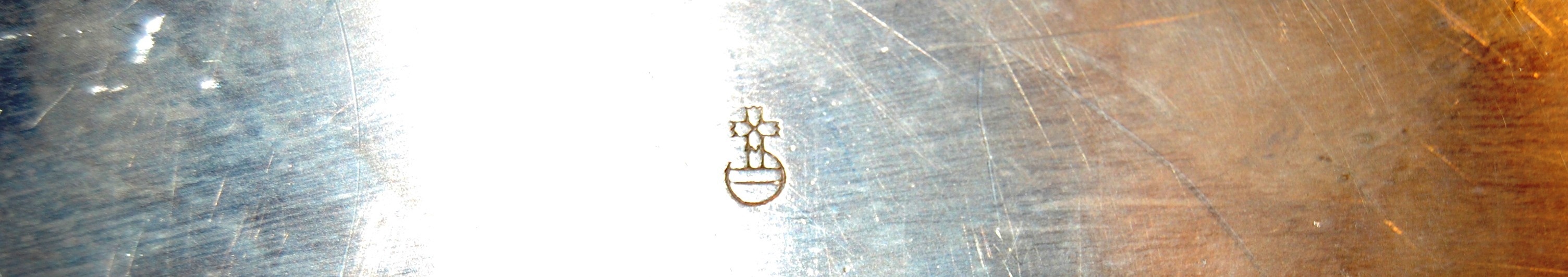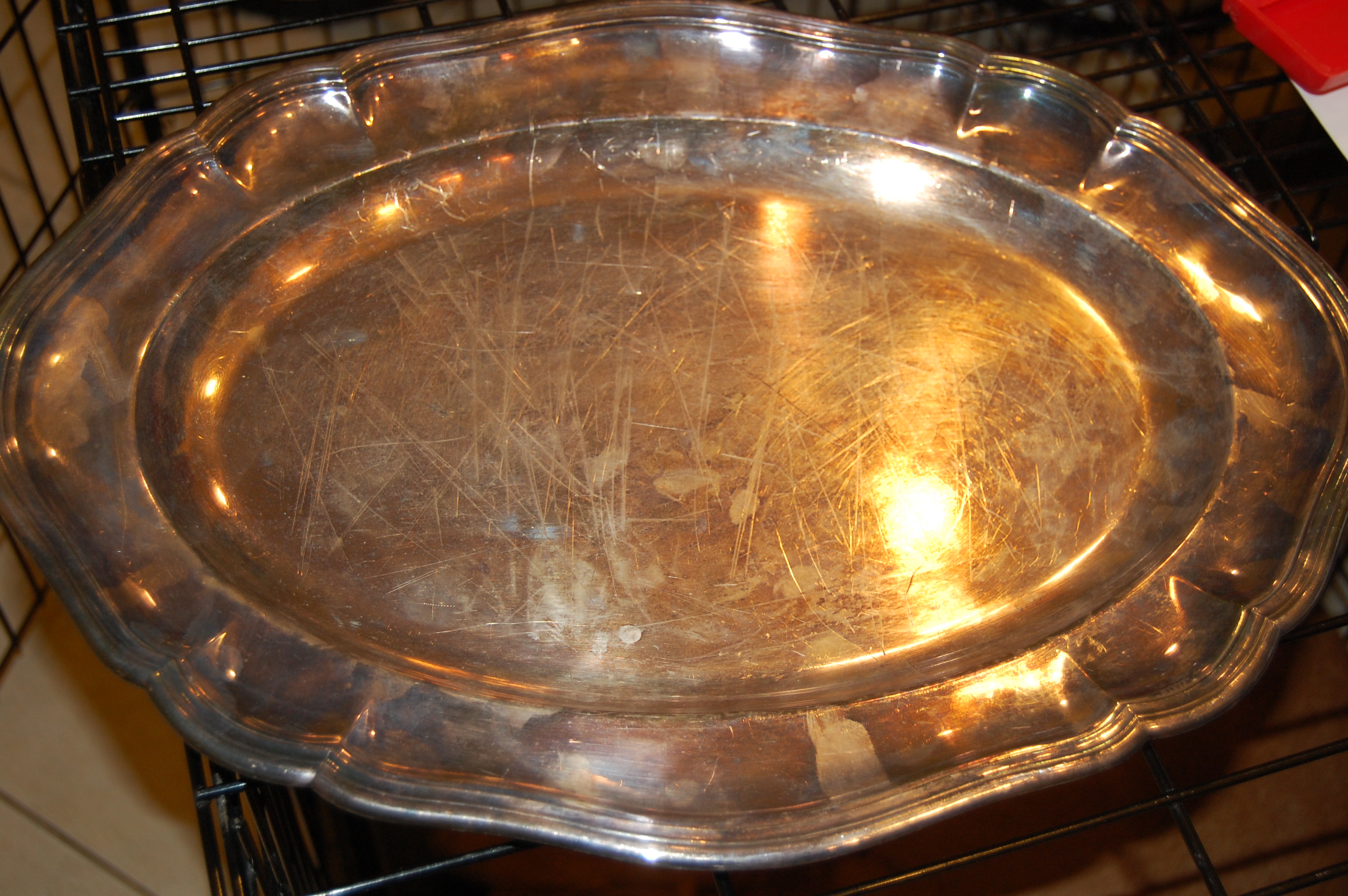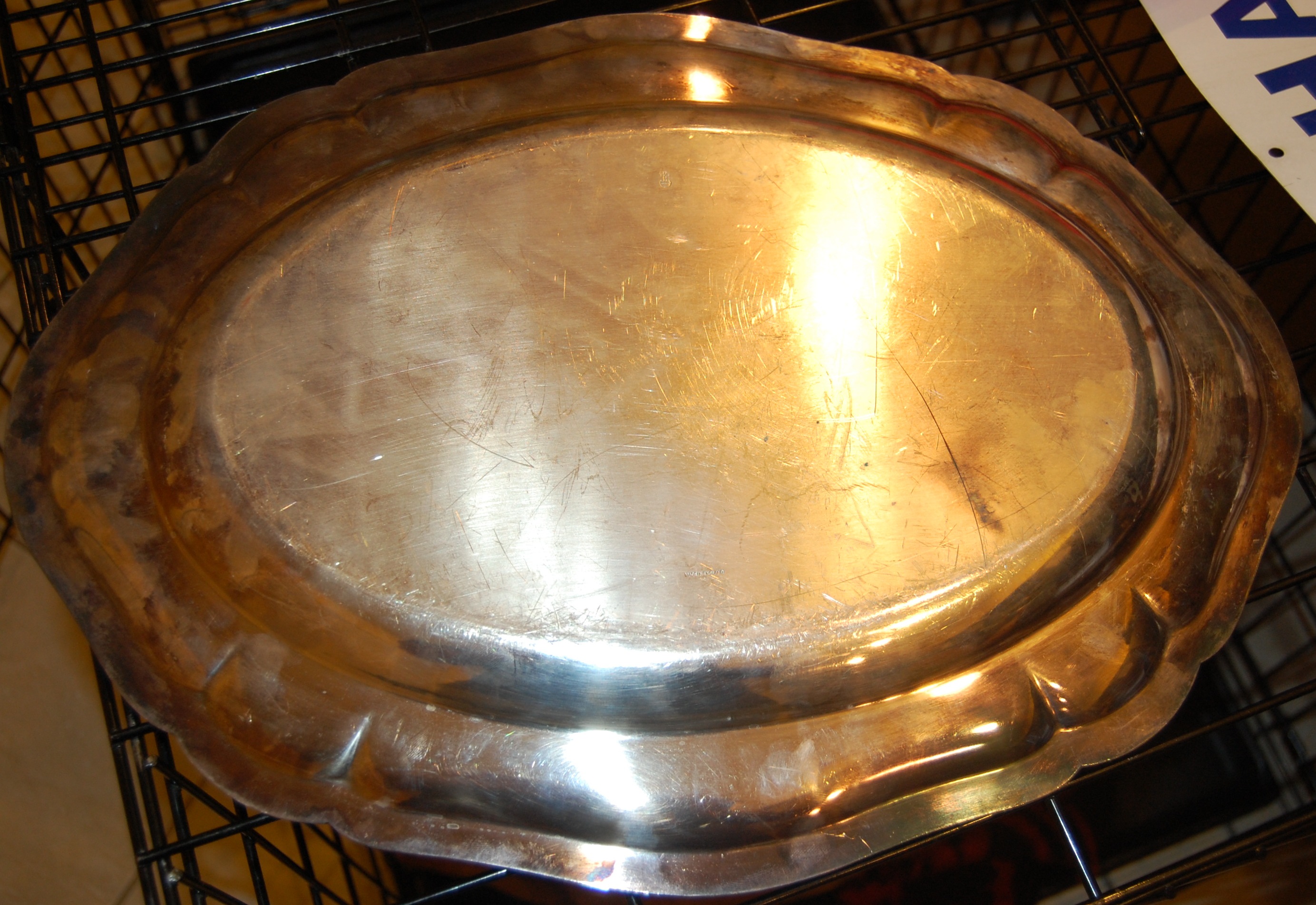 I believe this may be a Barker Brothers silver or sterling silver platter. It is oval shaped with a rimmed scallopped edge. It looks to be tarnished but I was told not to polish it. On the back it is etched with a silver hallmark containing a cross and circle shape, "22" and "Made in England". It looks to have some wear but it is in good, usable shape. Would look much better if polished.