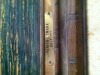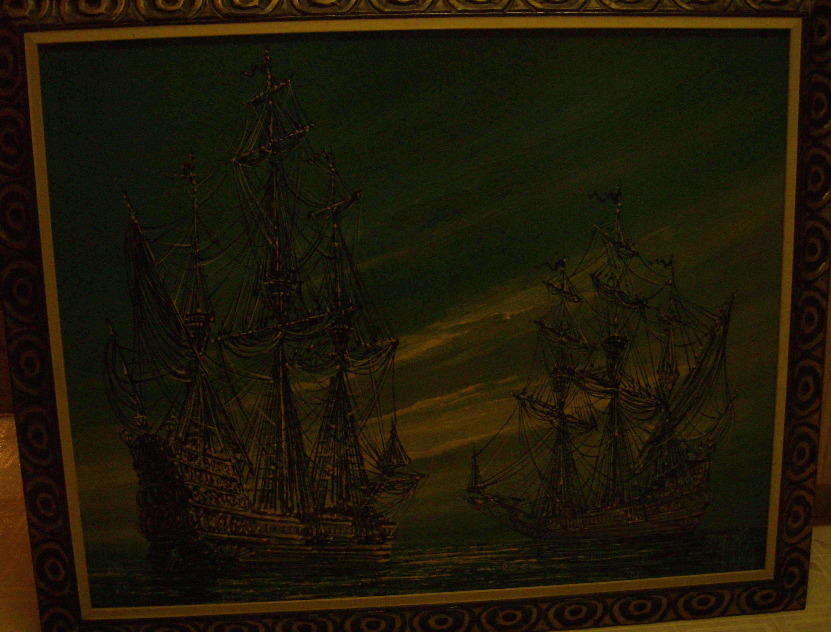 Two boats on the water, painted in green and blue. excellent condition.