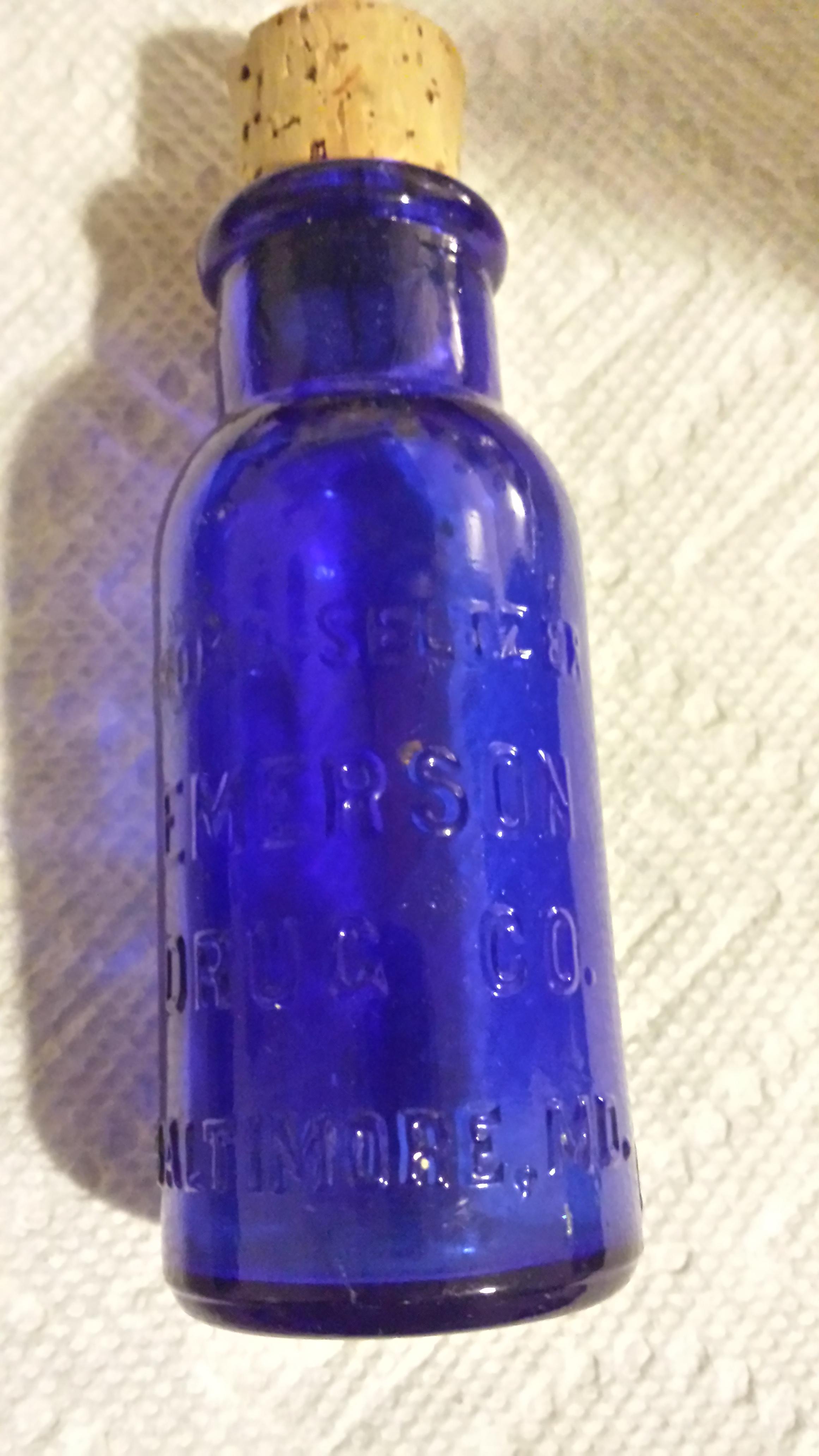 Bromo Seltzer Emerson Drug Co. Baltimore,Mo... Has the number 29 on the bottom, 4 inches tall with cork. Colbalt blue ( color ).
