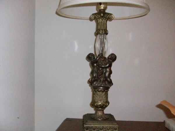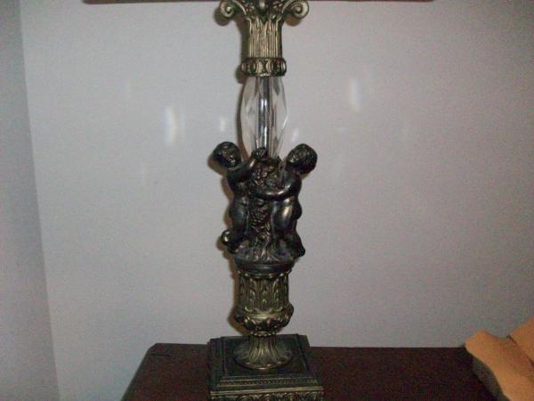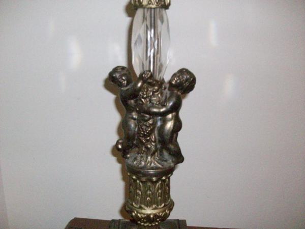 This lamp is either bronze or brass with a crystal prism above the cherubs. I don't really know much about it I did have to replace the cord and the part you put the bulb into. It was really old and was shorting out.