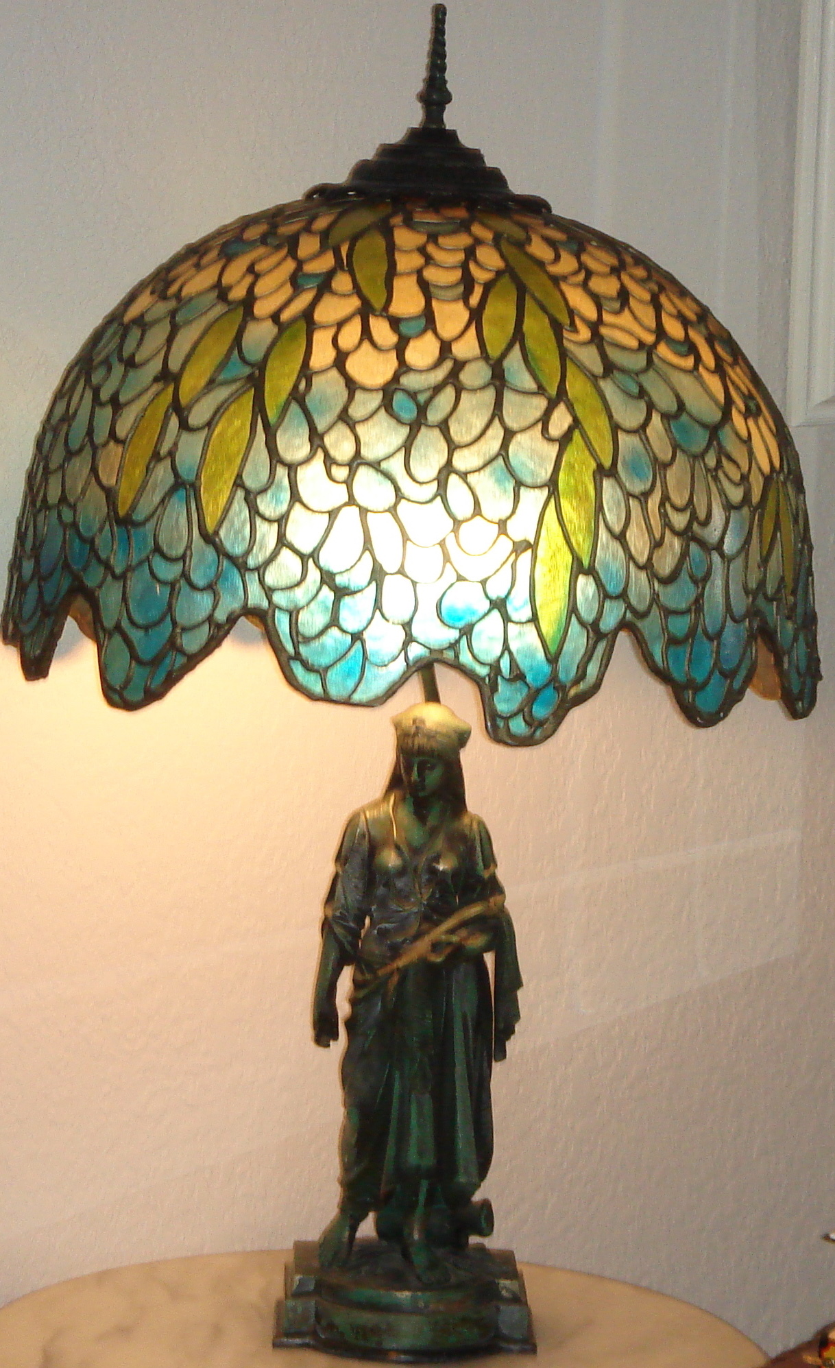The shade is faux stained glass...it's more of a lightweight material...and has had paint and what appears to be lead applied to it.