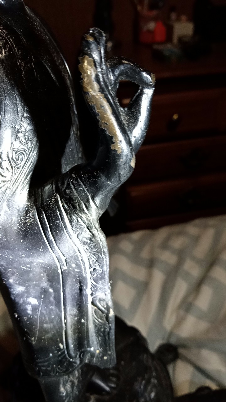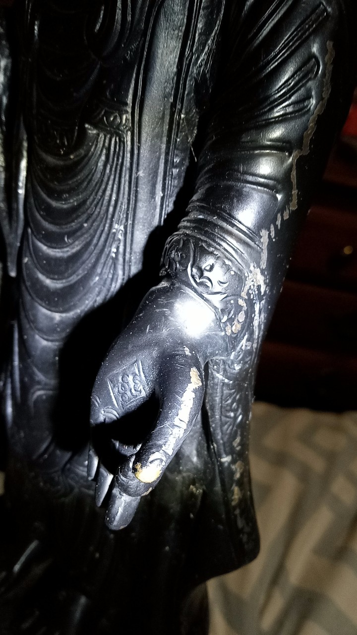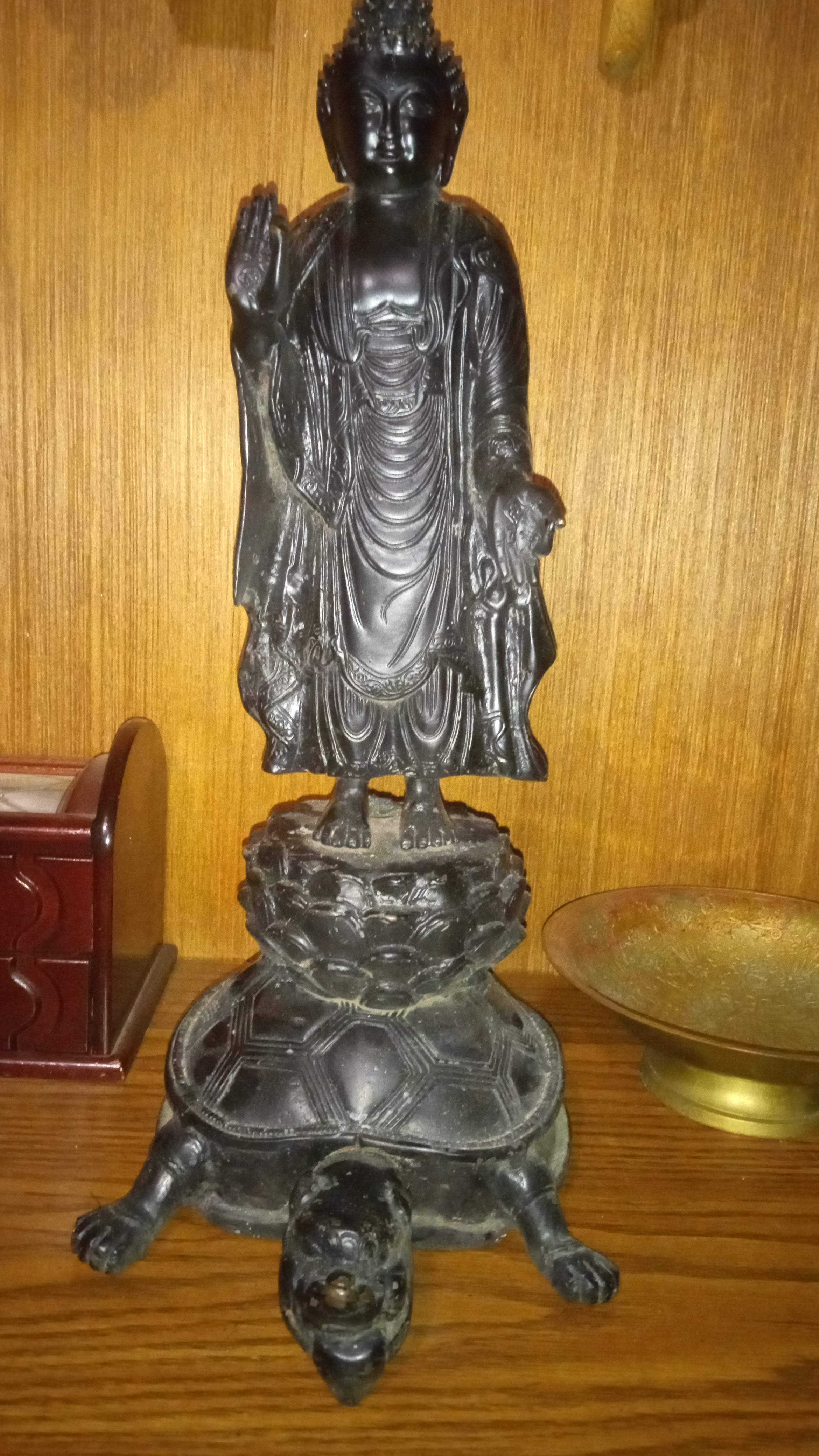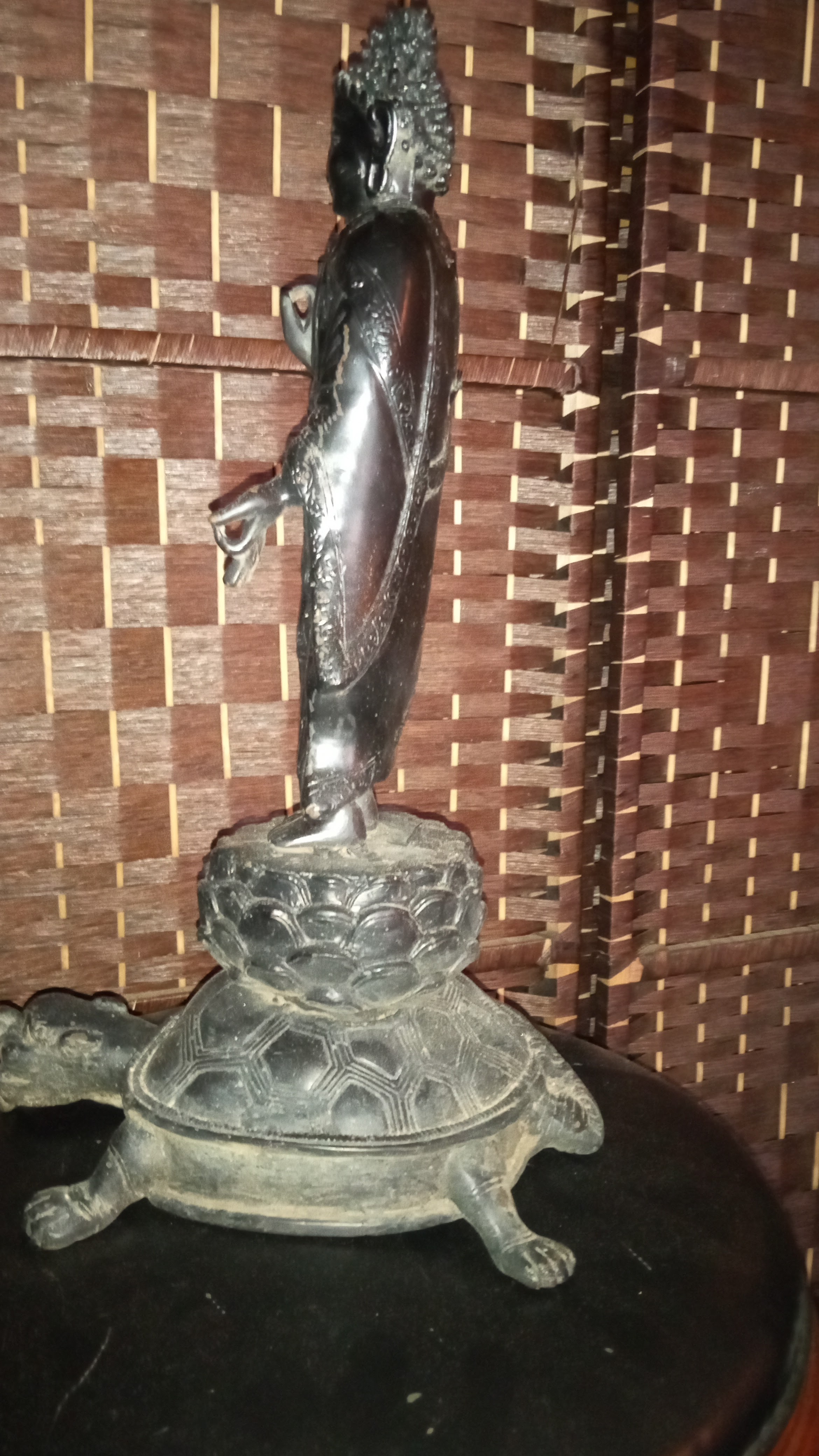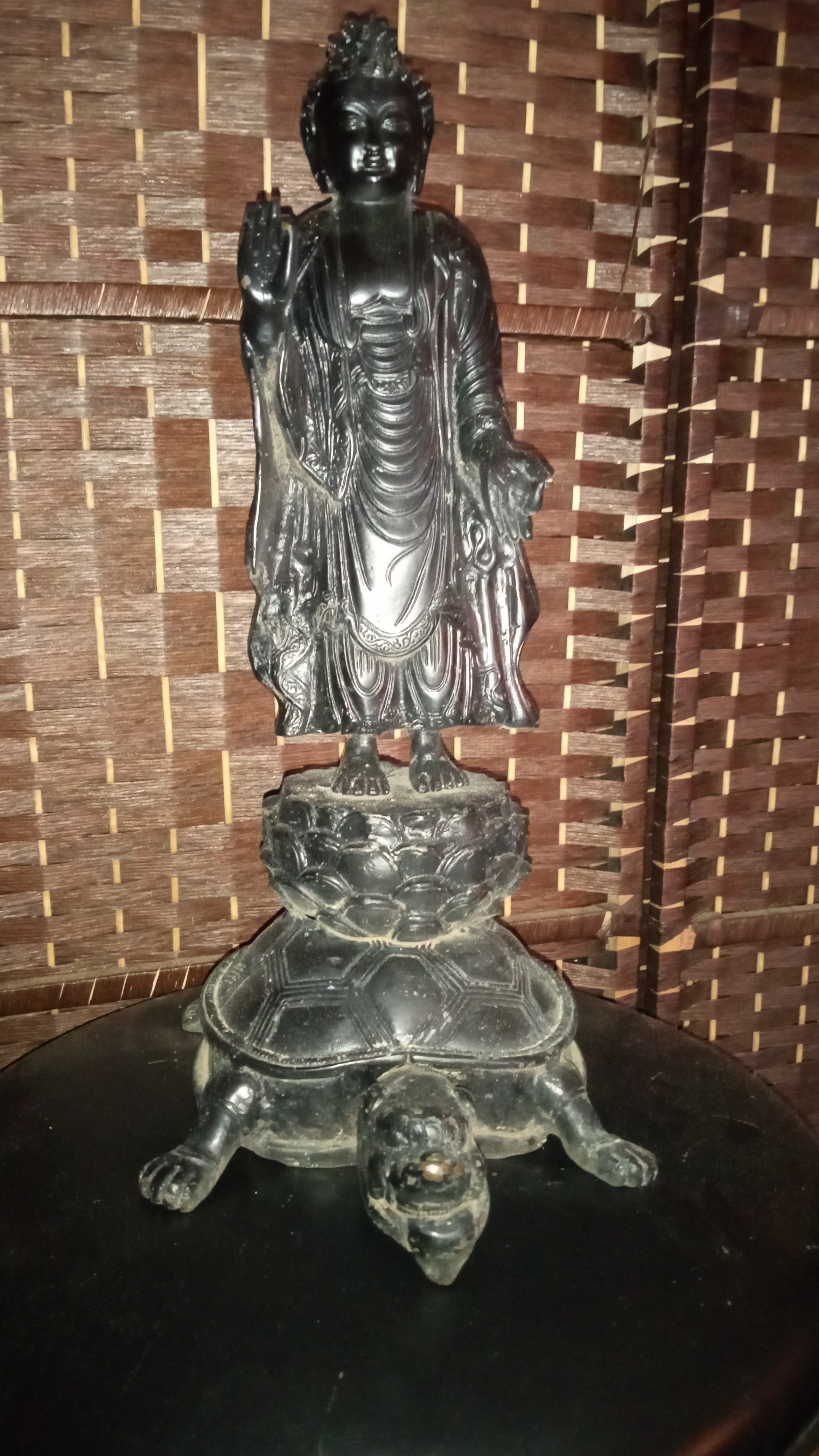 Bronze Buddha statue standing on top of lotus flower on the back of giant turtle. Approximately 14 lbs and 18 inches tall and 7 inches wide. Very little surface damage
