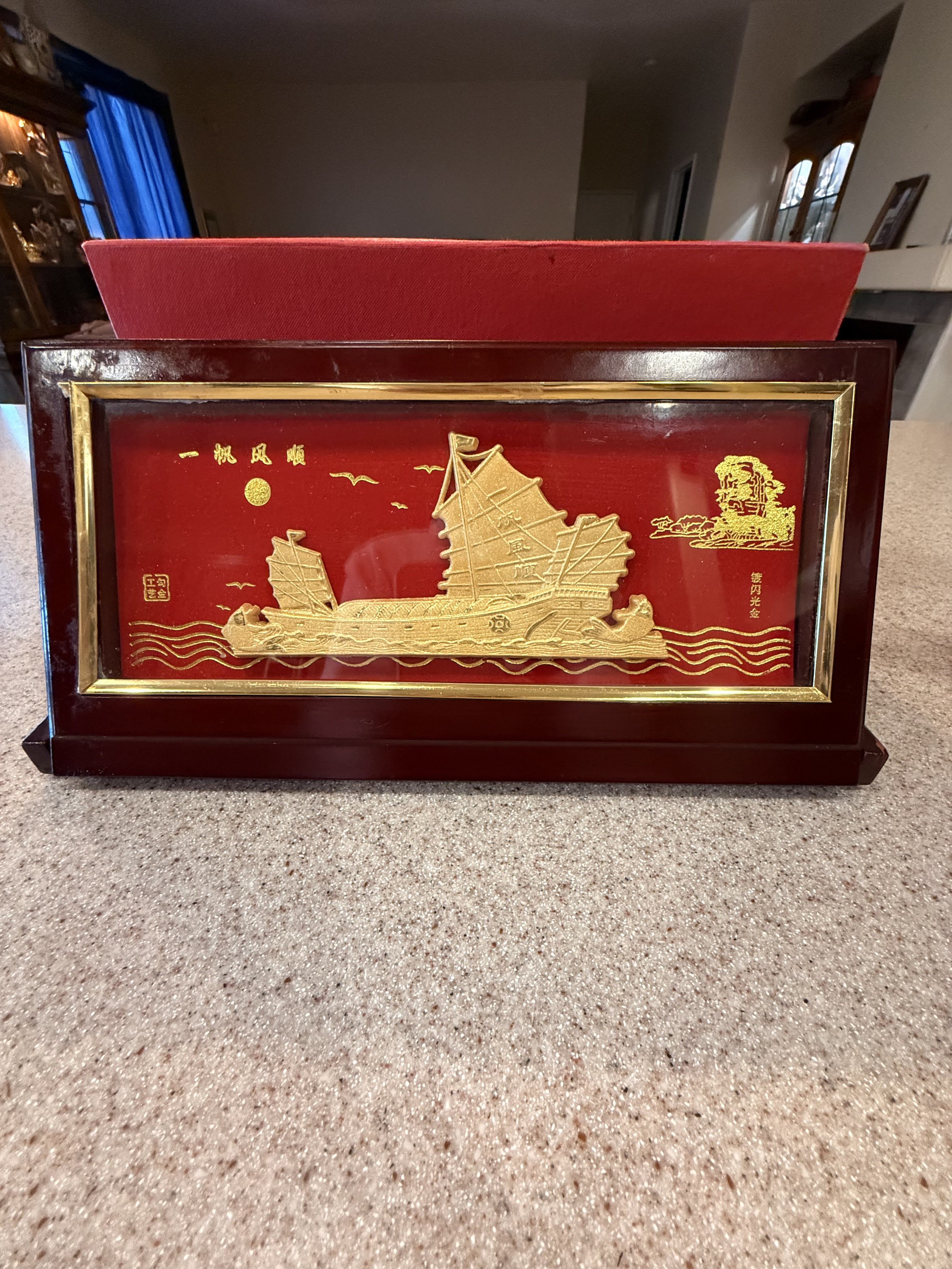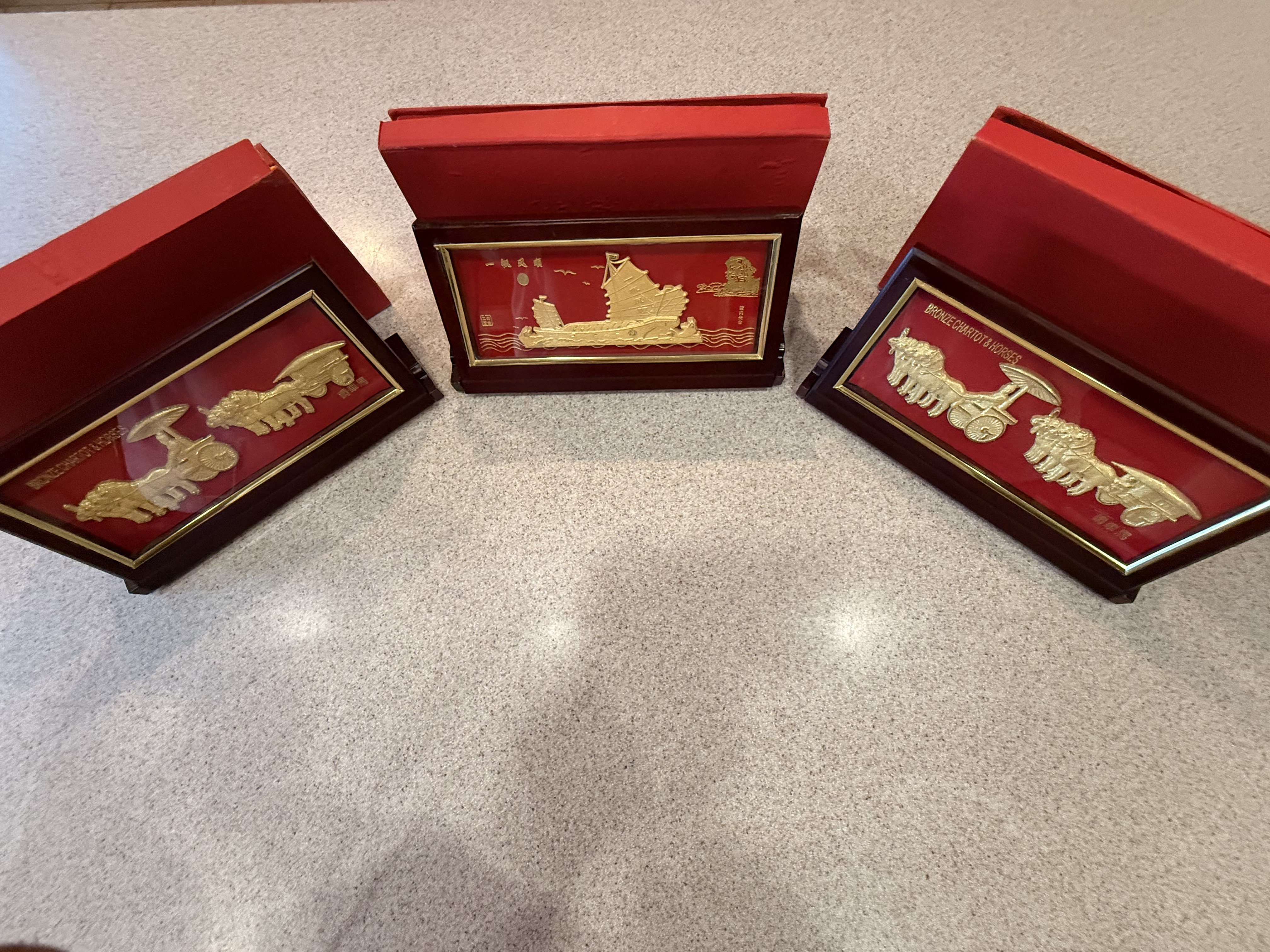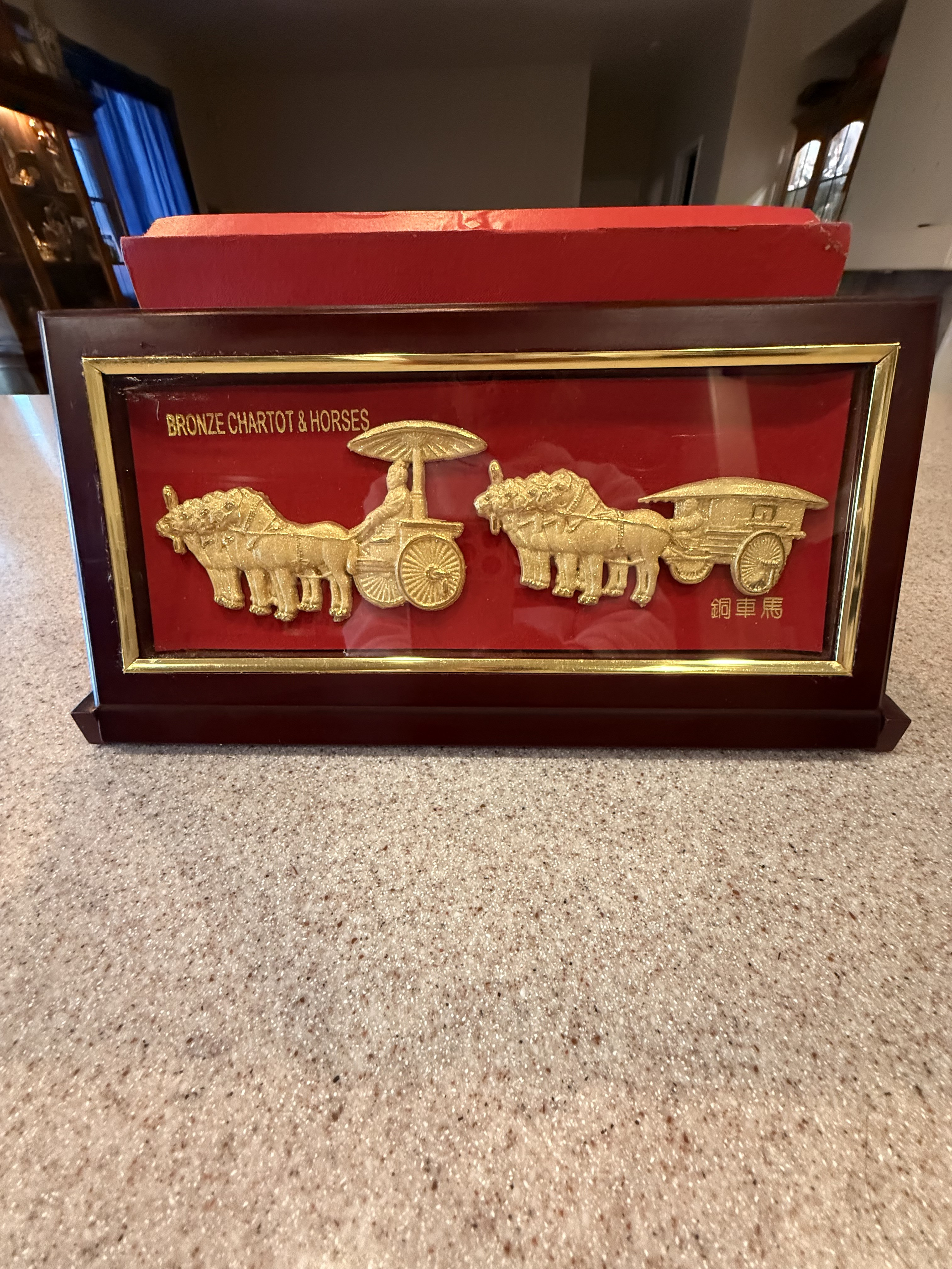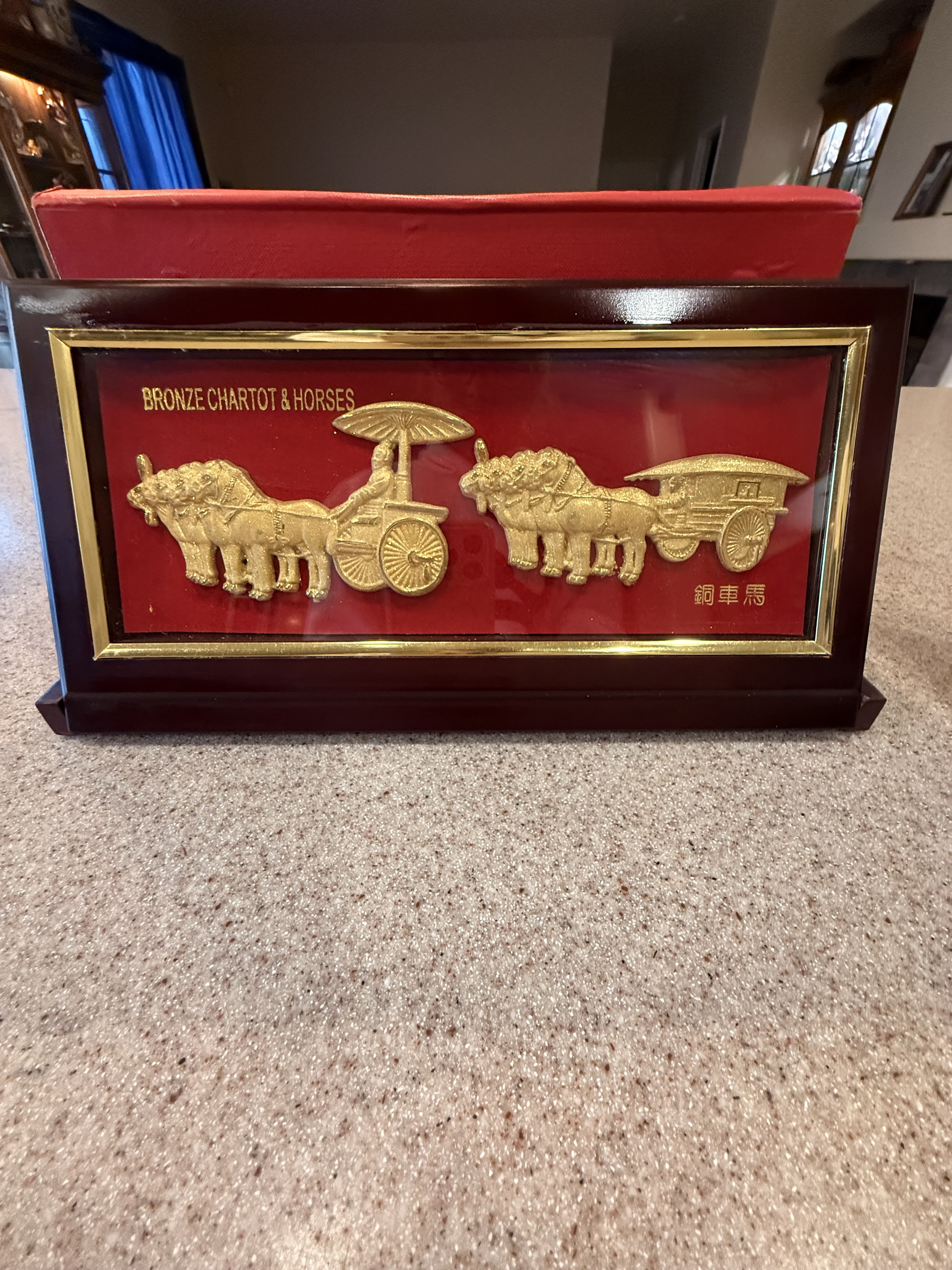 These Bronze Chariot and Horse framed Asian art are internally raised and came as a set while shopping in Nevada. Two of them show a bronze image of a man in a chariot guiding his horses, following suit is another chariot with a wagon like chariot possibly made to carry goods. The last framed art is a bronze shadow box like figure floating in the sea with Chinese characters bordering the work of art.
