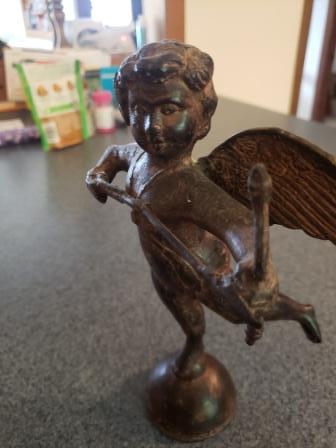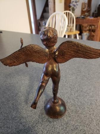 This is a 10" bronze cherub shooting an arrow. It appears to be very old. As you can see, it has no bottom on it? I got this from a dear friend who said her husband paid a lot of $$ for it and gave it to her. She then divorced him and wanted nothing that reminded her of him and she gave it to me so I have no idea where it came from.