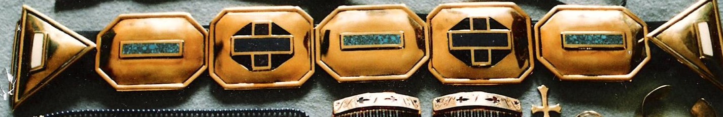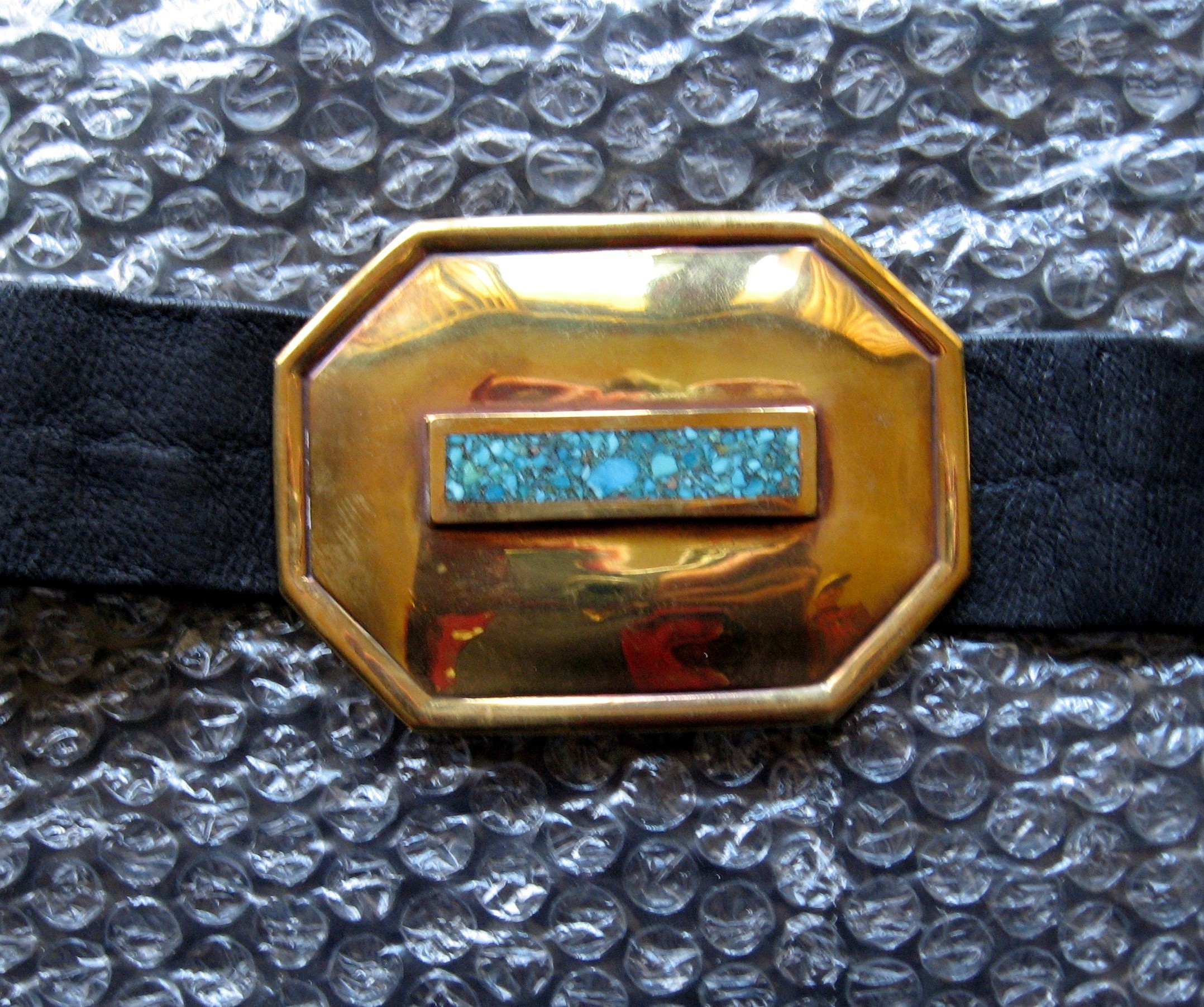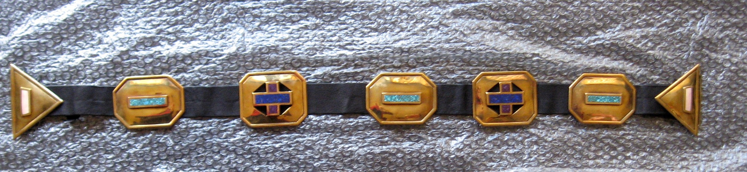 One seven item bronze concho belt with a leather strap. Five of the conchos are octagon shape and two are triangular shape and serve as the buckle. Three of octagon conchos measure approximately 90 x 68mm and are chip inlayed with turquoise. The remaining two octagon shaped are chip inlayed with lapis and sugulite. The two triangular buckle items are inlayed with a bar of ivory.