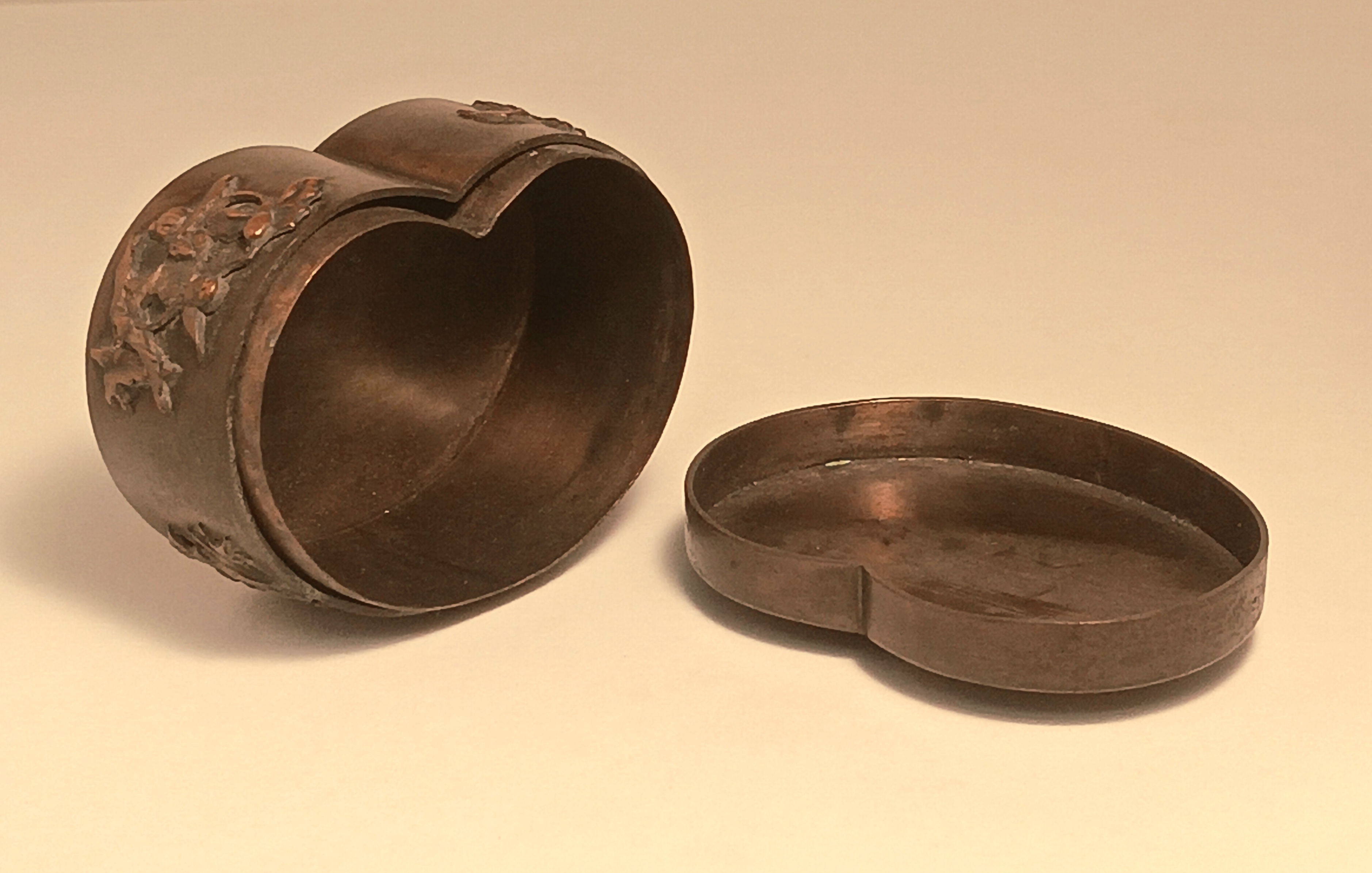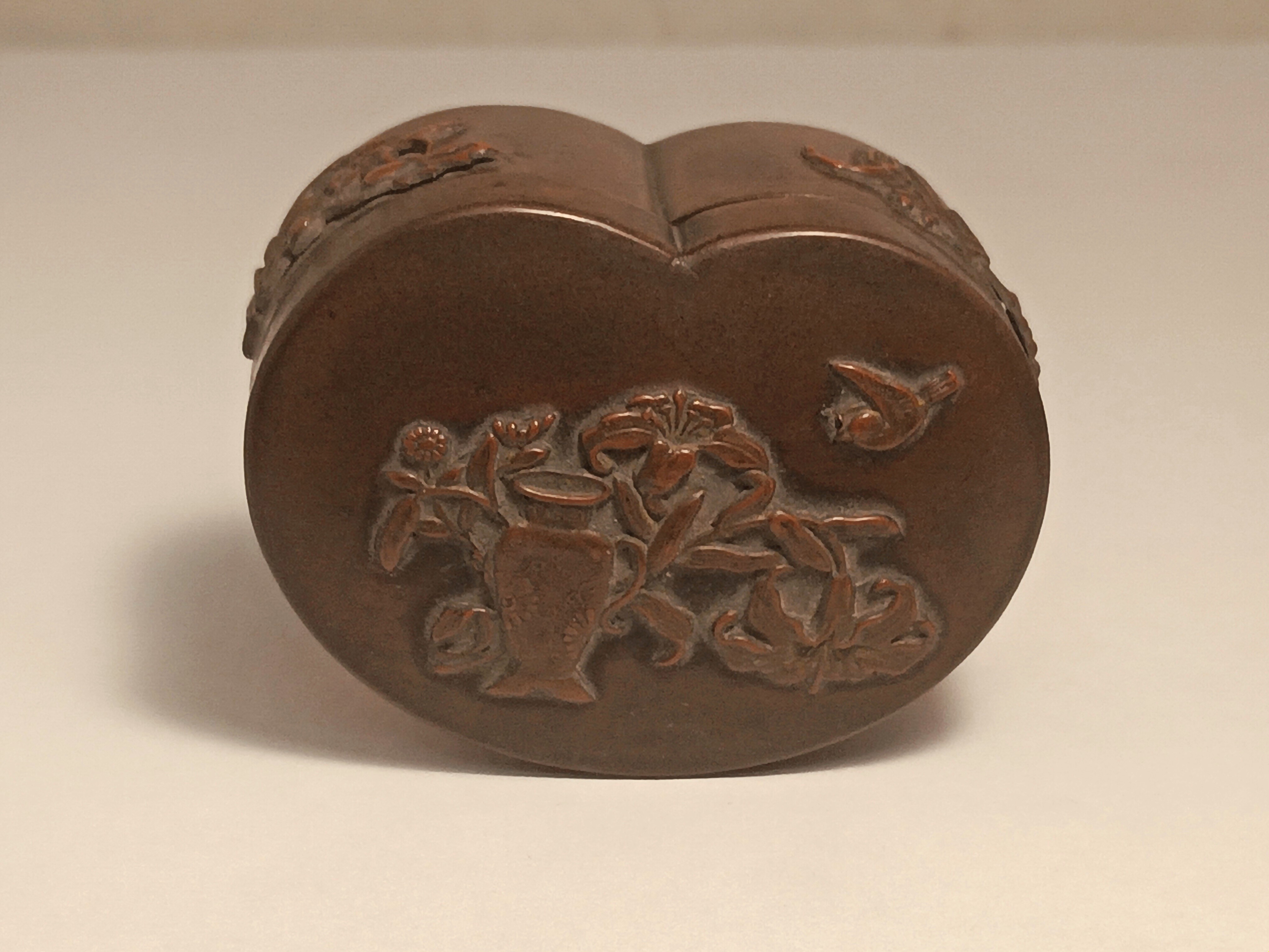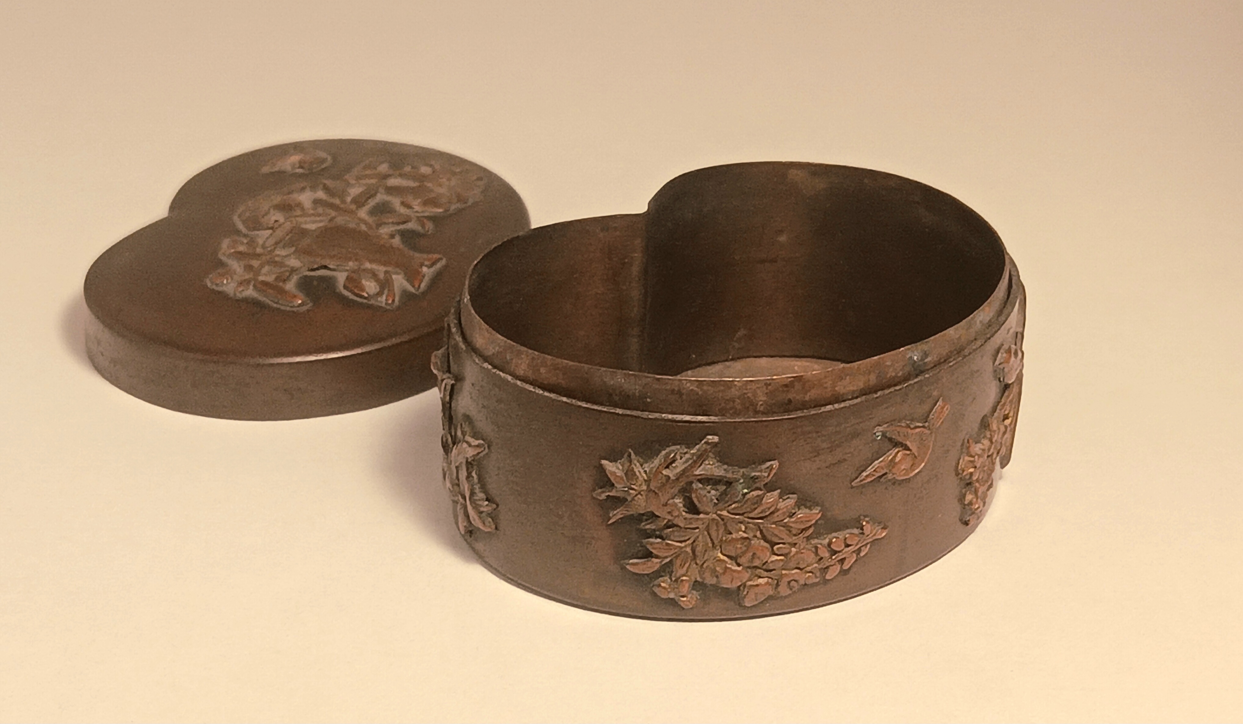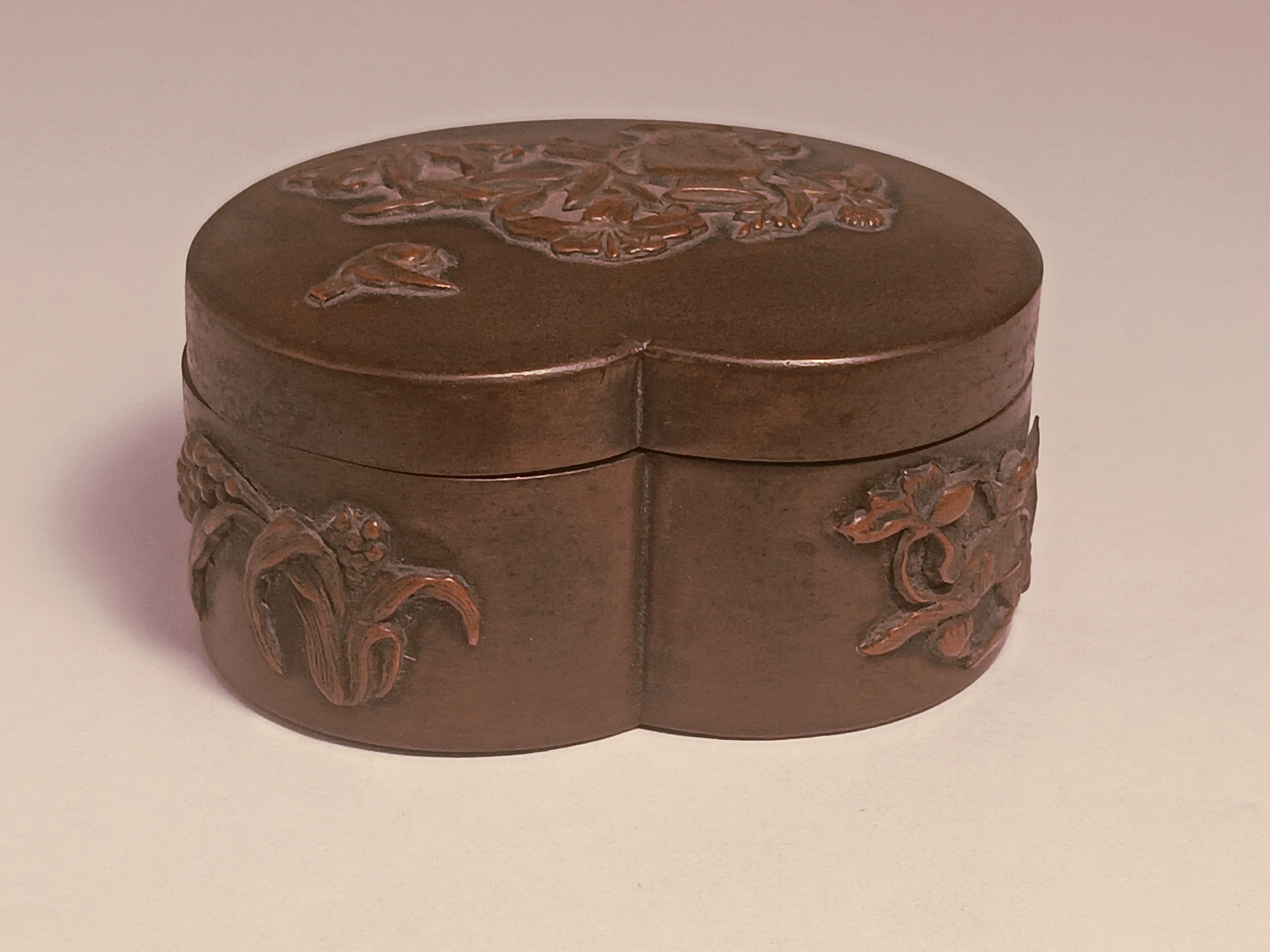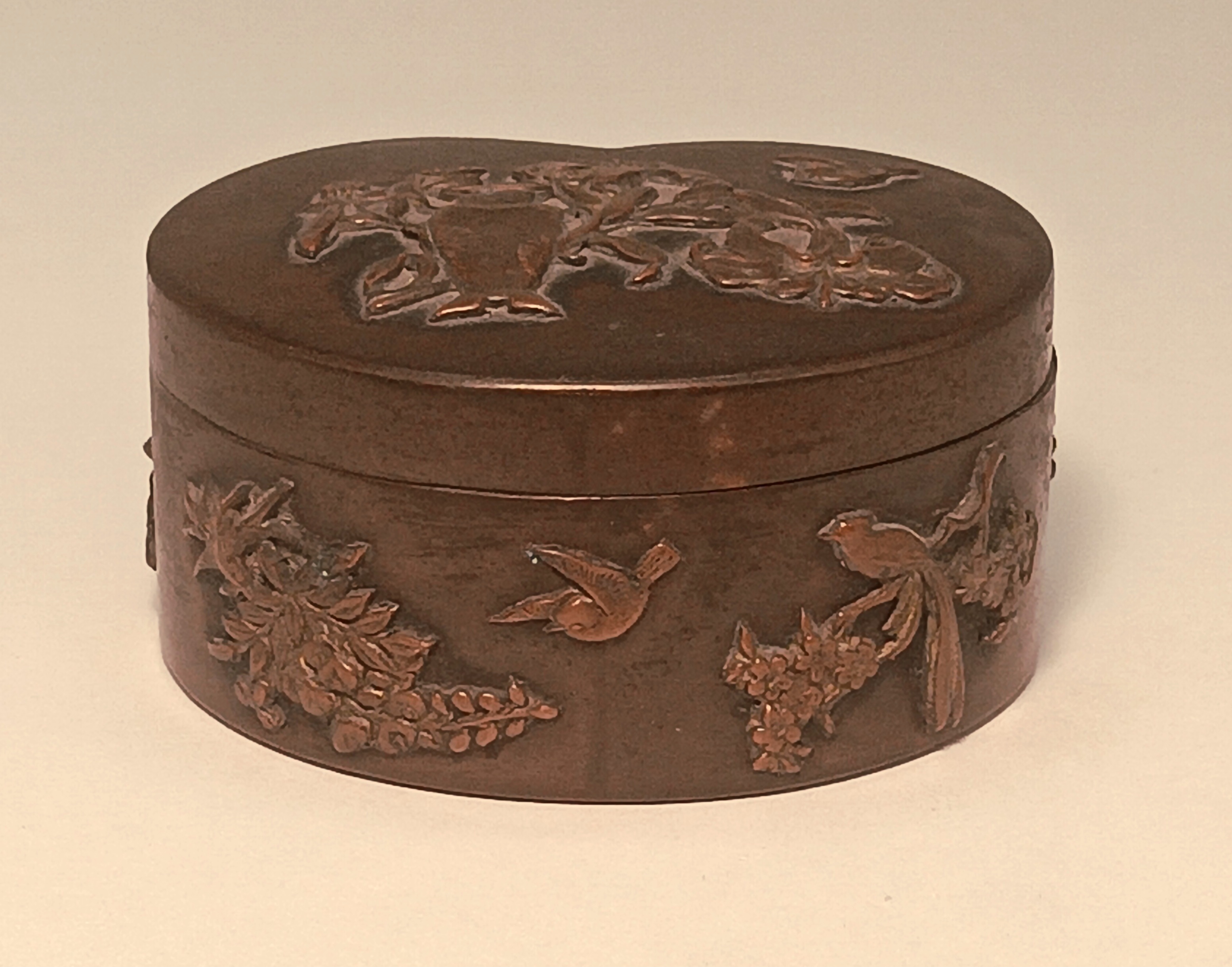 -a bronze kidney shaped trinket box with relief decoration of birds, plants and vases.