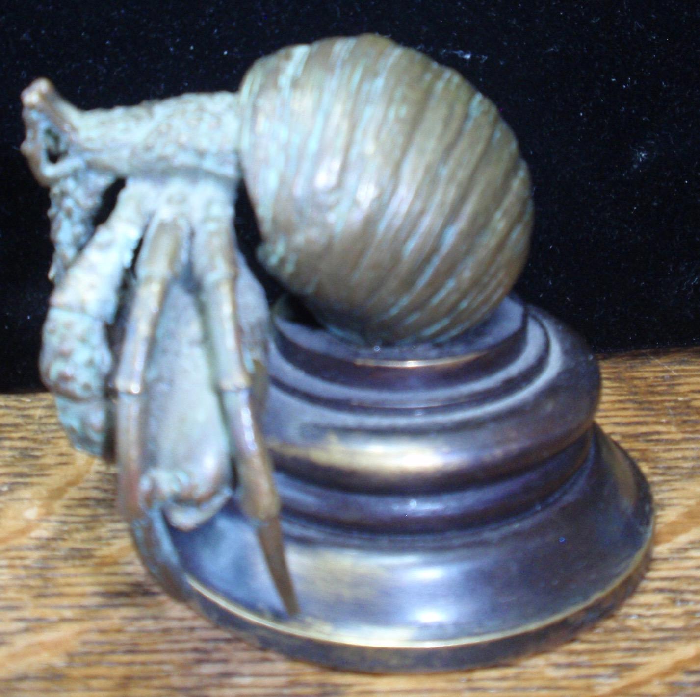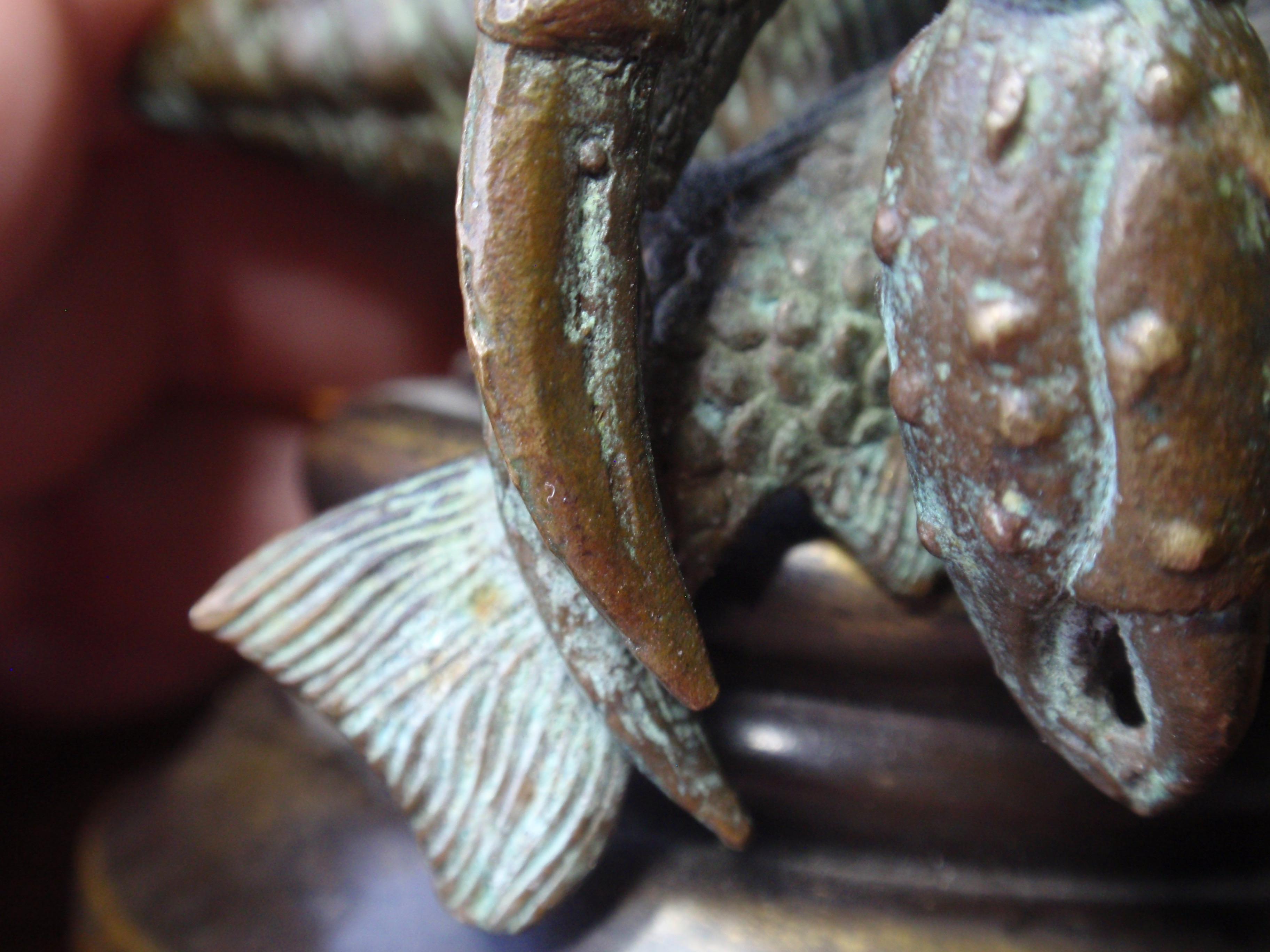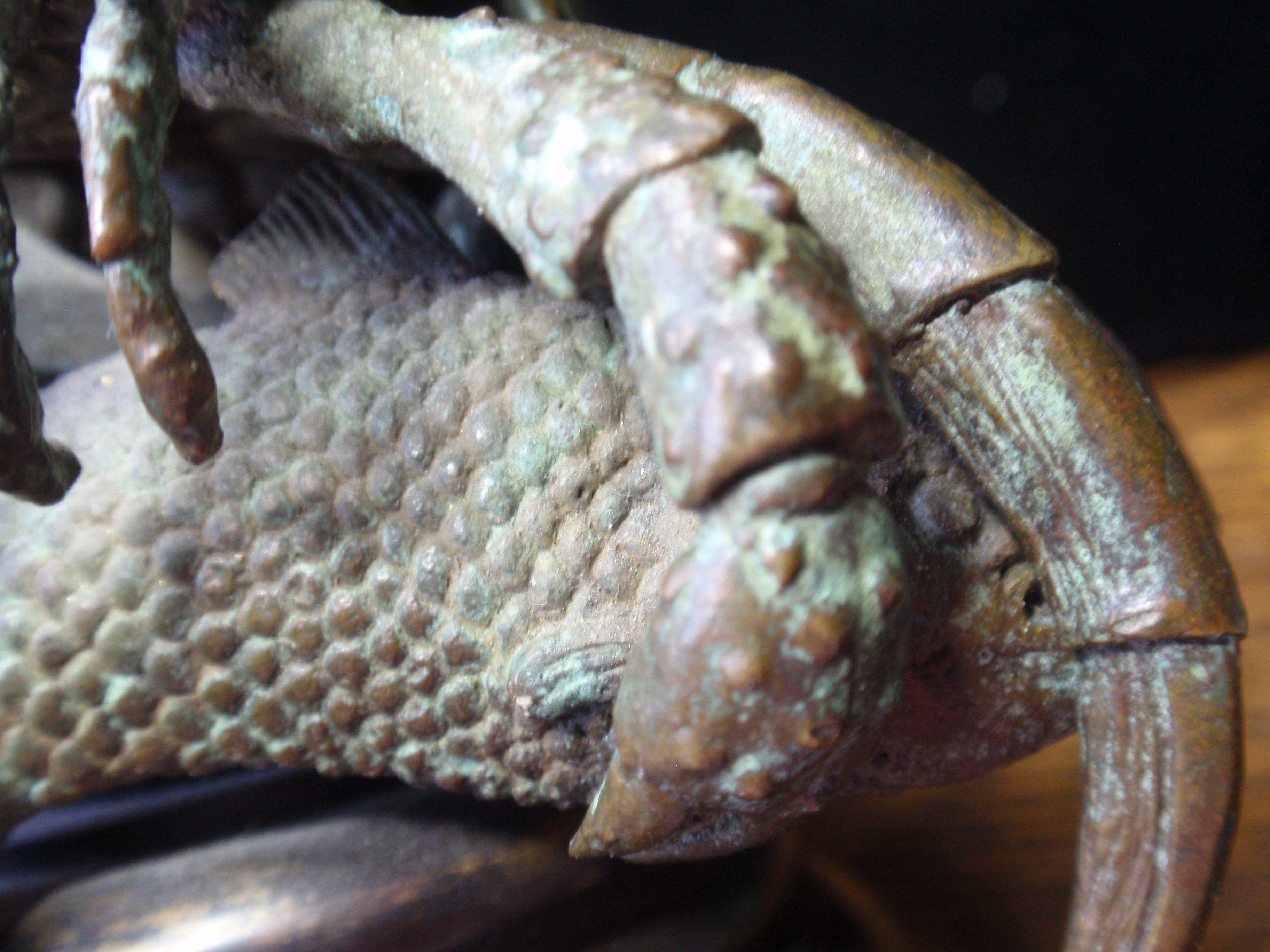 Pictured is a bronze (authenicated as bronze by gemologist) figure of a lobster who has captured a carp or sometype of fish. The piece is 634 grams. The base is 2 3/4" 3 1/4" high and 4" wide.