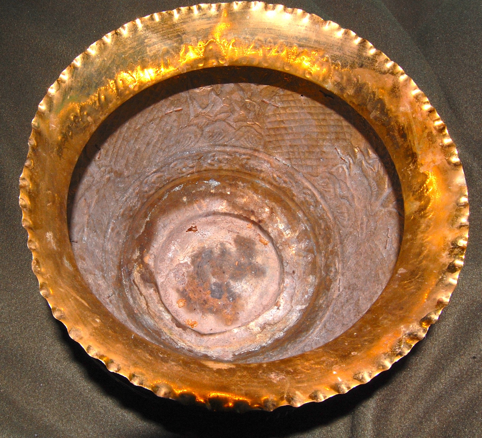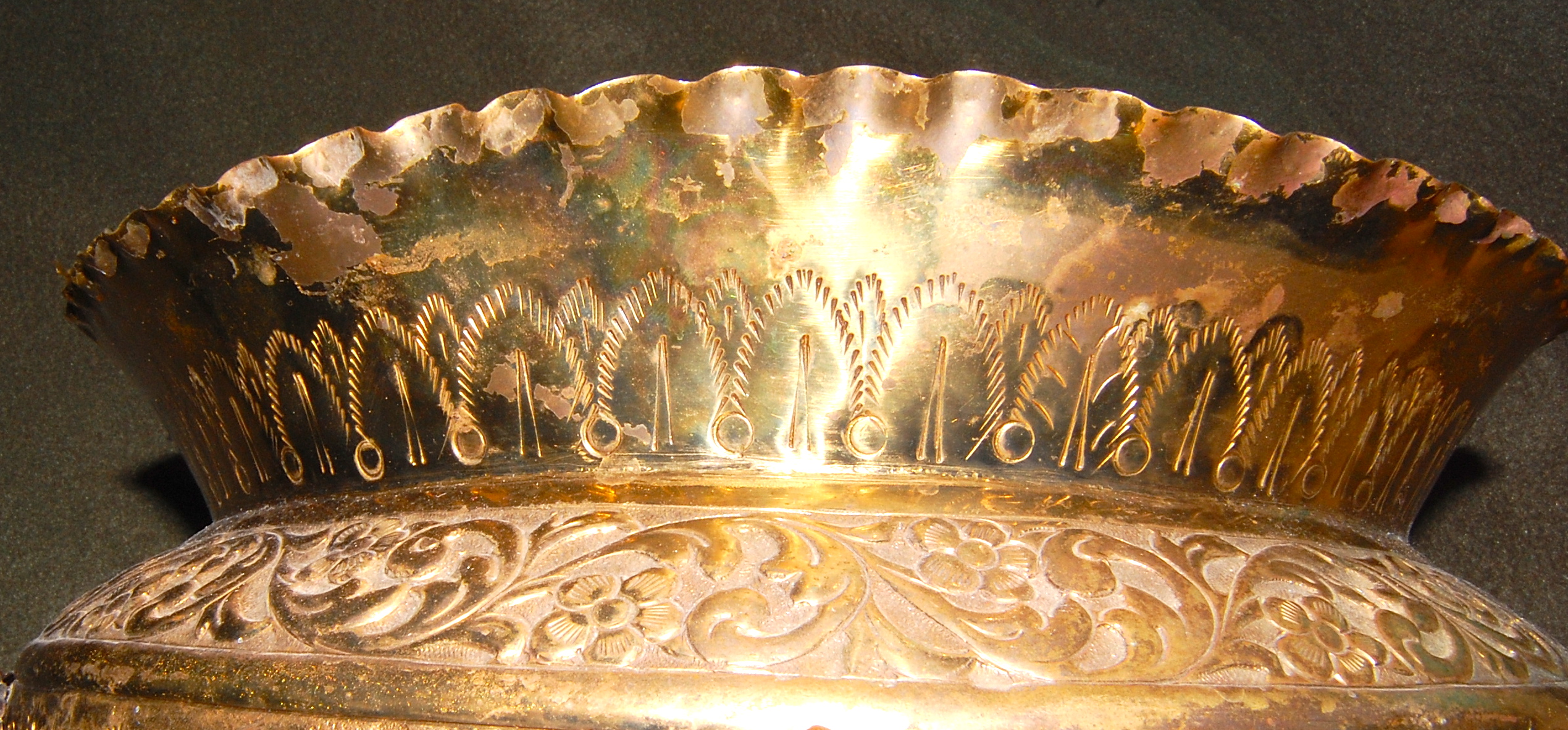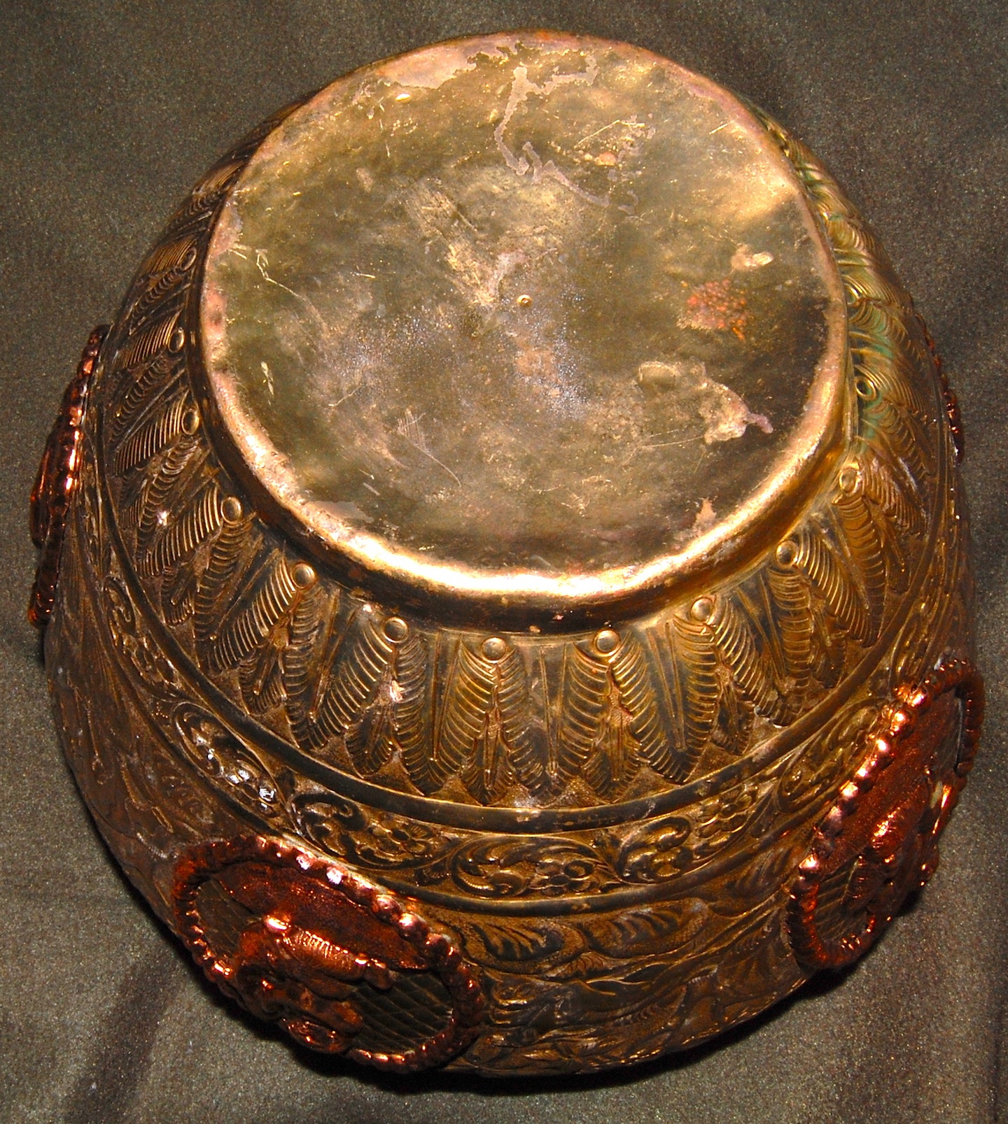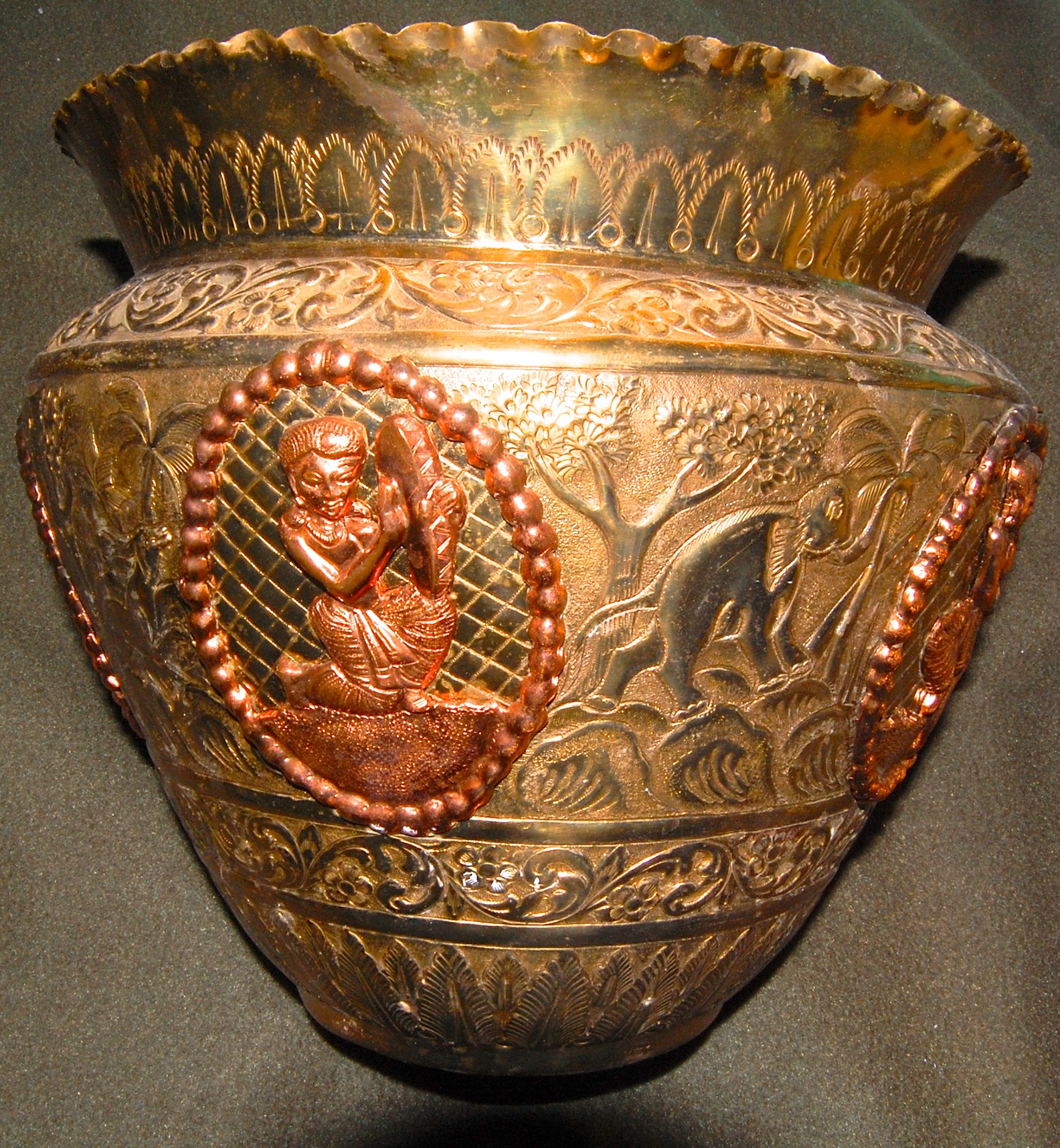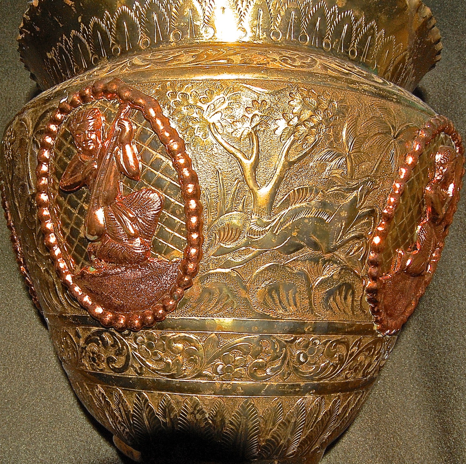 I found this piece in Egypt about twenty years ago. It appears to be hand hammered bronze with an scallop effect at the brim. Just recently uncovered it again and I am curious about its origins. I can't quite identify the period or decor to a specific period. The detailed ornateness of the bronze pot tells me that it may not be as old as I had once assumed. It is a bronze pot/planter with scenes of gazelle and elephants and lions with palms and other trees in the background. Attached to the piece are very ornate copper embelishments of "indigenous" people dancing and playing instruments. These copper embelishments are attached to the piece to the inside with folded tabs. I have taken detailed pictures of the item in hopes that someone may help identify either a period or place of origin for the piece as I have been unable to find anything similar to it as of yet althought some aspects of it remind me of Pakistani or Indian tooling. I am simply unsure. Any help would be appreciated. Thank you!
