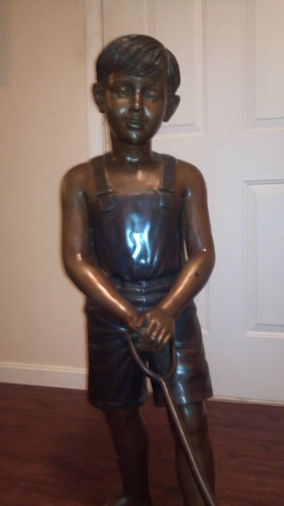 THIS IS A SCULPTURE OR STATUE THAT IS LIKE SIZE OF A YOUNG BOY PULLING HIS WAGON AND IS DONE IN BRONZE. IT WAS PURCHASED AT AN ESTATE AUCTION 6 OR 7 YEARS AGO AND I DID NOT GET ANY INFORMATION ON THE PIECE. THROUGH A LOT OF RESEARCH ONLINE I HAVE FOUND A COUPLE OTHER BRONZE STATUES THAT WERE BEING SOLD ON LINE FROM THE SAME STUDIO. THE PRICES THAT THEY WERE BEING SOLD AT WERE QUITE IMPRESSIVE. I AM READY TO SELL AND DONT KNOW HOW TO MAKE SURE I AM ASKING A FAIR PRICE BOTH FOR MYSELF AND THE BUYER. "LAKE GENEVA STUDIOS'' EXISTS YET I HAVE NOT FOUND A WAY TO CONTACT THEM FOR INFORMATION ON THE PIECE. IT IS MY UNDERSTANDING THAT THESE PIECES CAN RANGE QUITE A BIT IN VALUE AND HOPE THAT THROUGH THE HELP I GET HERE CAN FIND AN APPROPRIATE PRICE. IT IS IN EXCELLENT CONDITION. THE BOY STANDS 40 INCHES TALL. THE WAGON IS 12X12X24IN. ANY HELP OR INFO IS GREATLY APPRECIATED.