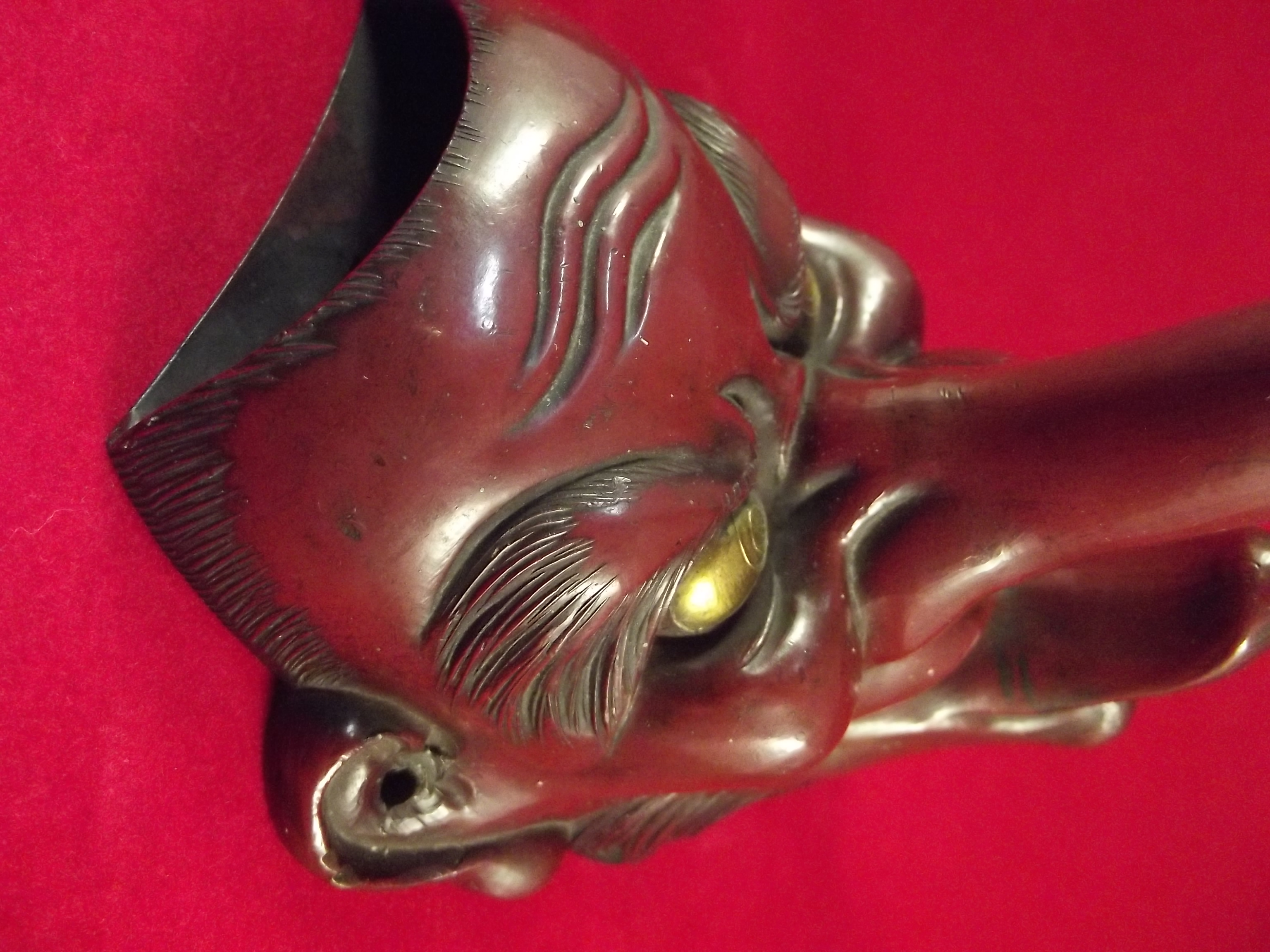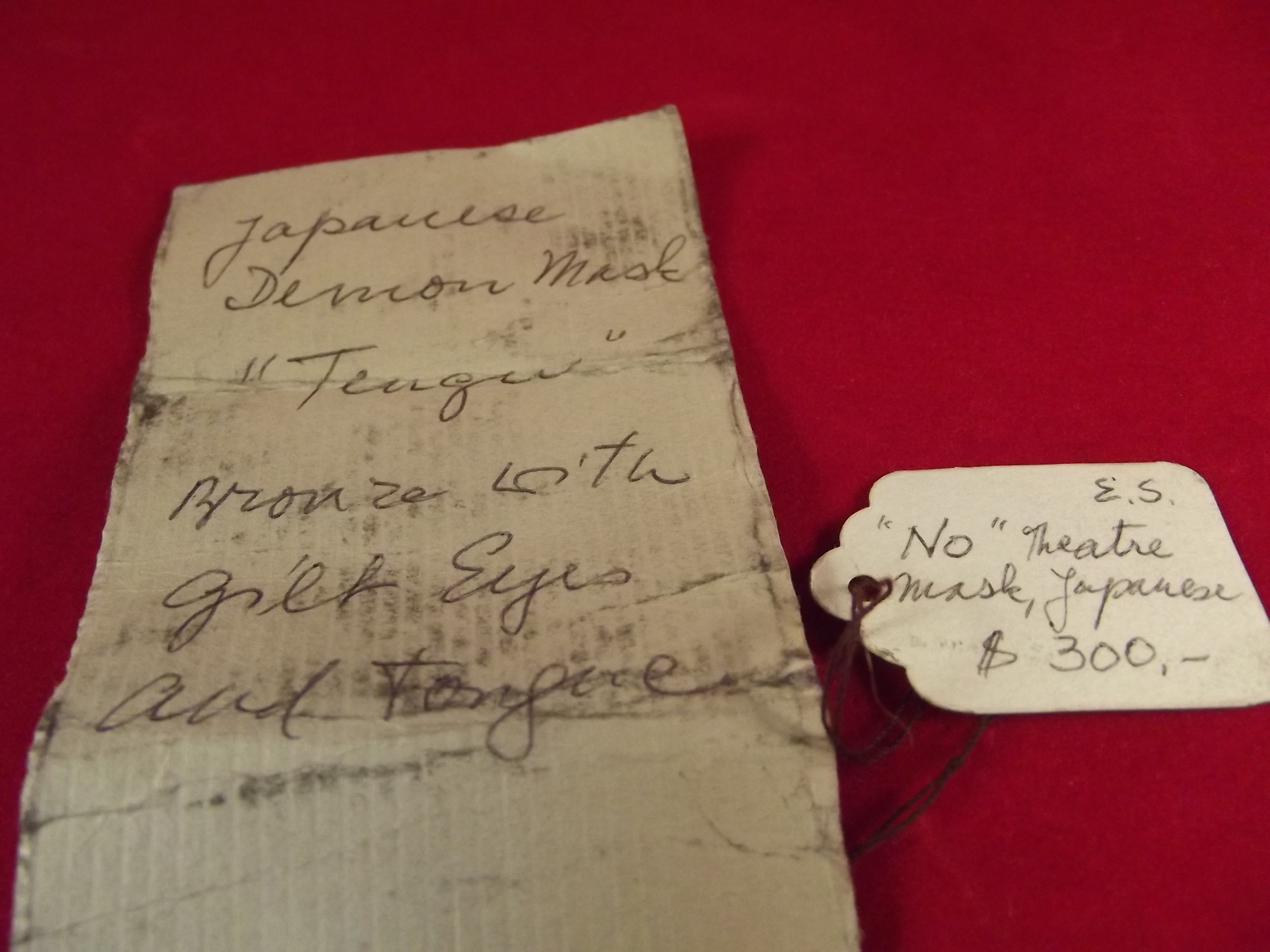 I found a business card and tag inside of it when I got it. (see pictures) The business card is for Granville Antiques out of Granville OH, which hasnt been in business for a long time. On the back of the card it states..."Japanese Demon Mask, Tengu, Bronze with gold eyes and tongue". The tag (also pictured) states "Demon Mask Bronze/gold, "No" theatre mask, Japanese $300.-)
