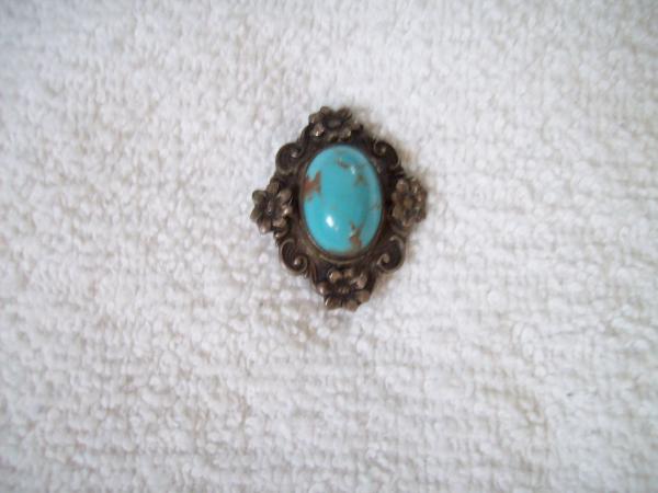 outside is silver colored with small flowers,stone is light green with brown designs,silver clasp on back