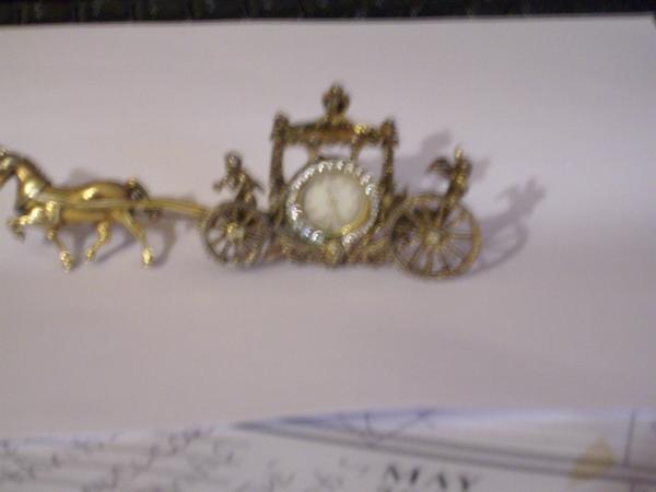 watch maker is taylor,there are 25 stones around the face of the clock and 2 for the eyes of the horse.the only markings visable is sterling on the back of the coach and horse.