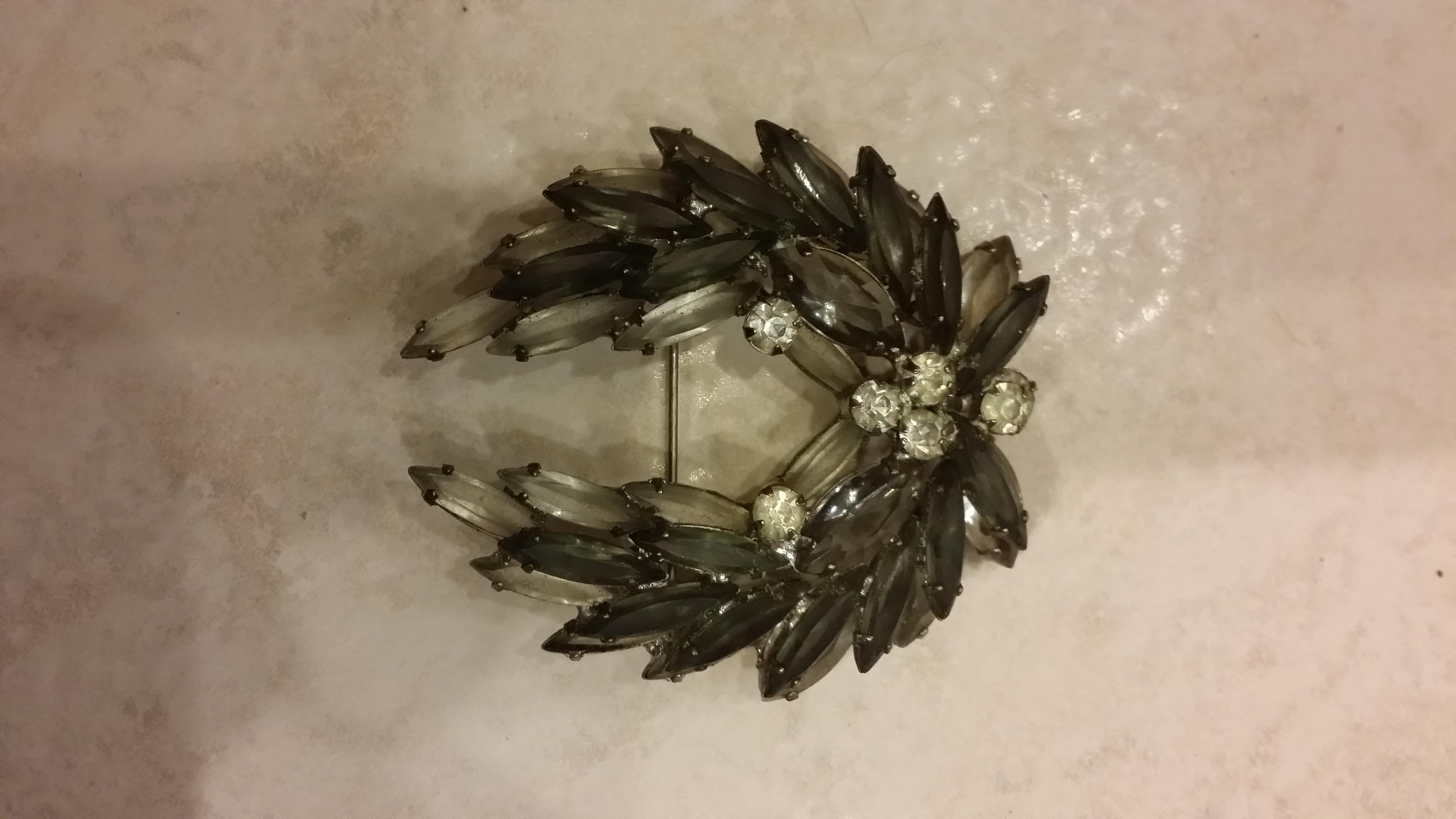 Very elegant brooch with smoke and white crystals and rhinestones. White crystals line the bottom layer with smoke crystals on top.