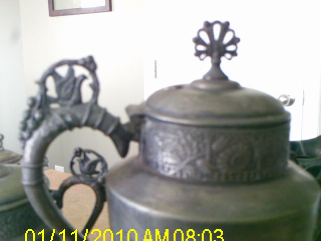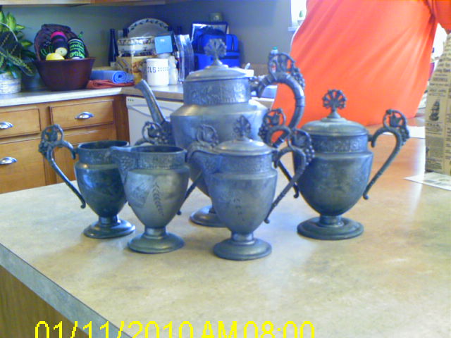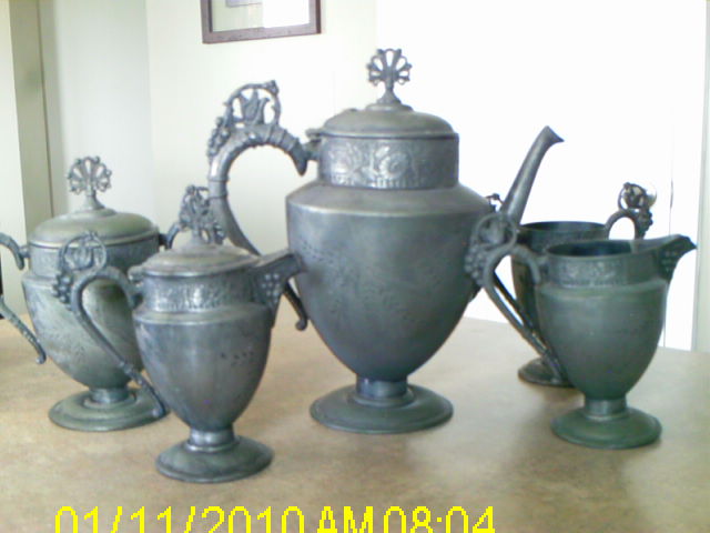 Tea/Coffee Set marked the Brooklyn Silverplate Co. 701. There are birds and grapes on the handles and wat appears to be a narrow fan on the body of the pieces with bleaves on a branch beside it. It's rather tarnished.