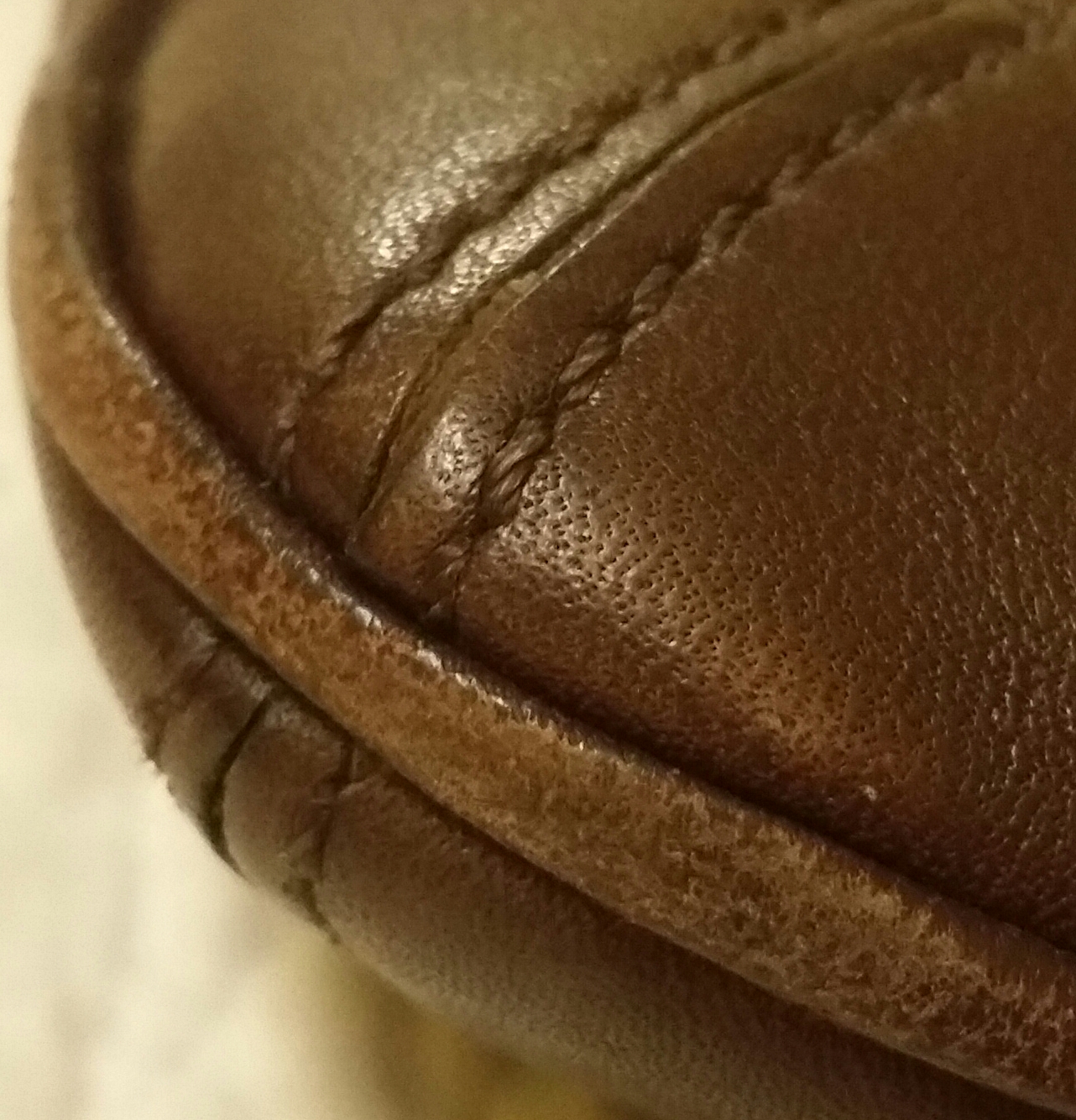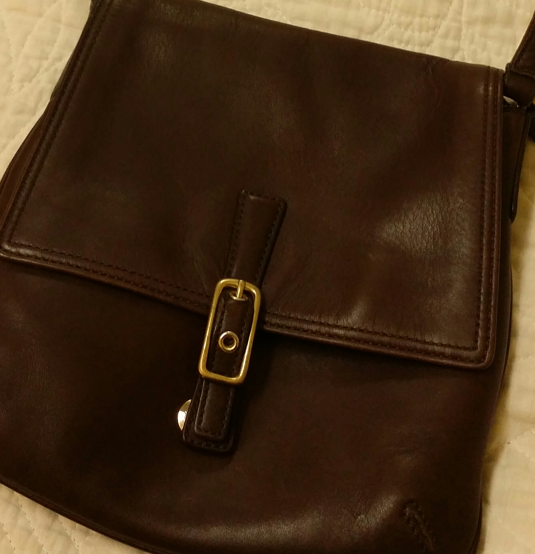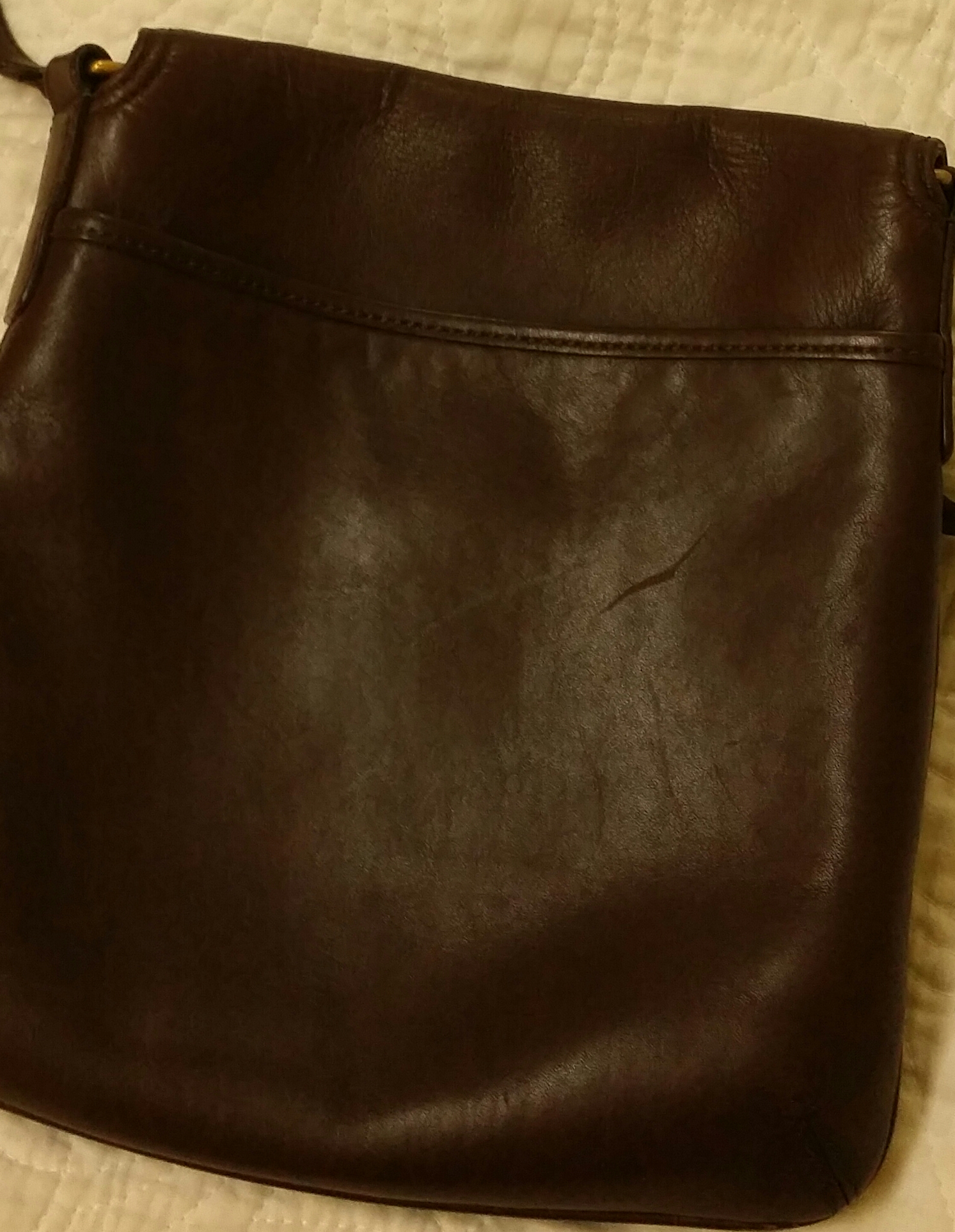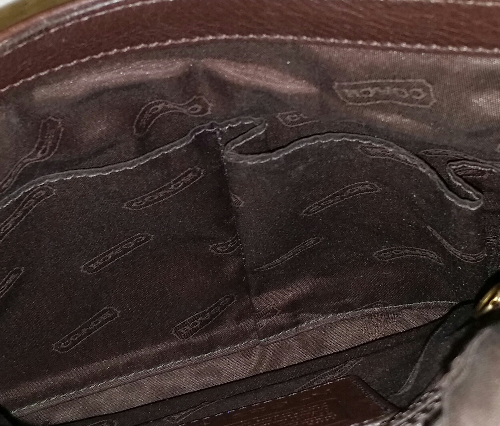 This bag is completely made of a solid brown leather. There are only 4 digits at the end of the serial number and the stiching on the purse is perfection. It has what I believe is brass hardware, but I'm not completely familiar with metal hardware. It's a crossbody style with a flap that comes over the front with a strap that has an attached belt buckle to keep the purse closed and secure and a little magnet with "coach " engraved in it. It has a little wear at the base of the bag due to normal wear, but the rest of it is beautiful. The interior is lined with what I assume is silk. The lining is brown with "coach" stitched in a very precise pattern. I haven't been able to find this purse anywhere on the Internet and I would like to know if this handbag is genuine or just a replica. Any info or resources would be greatly appreciated.