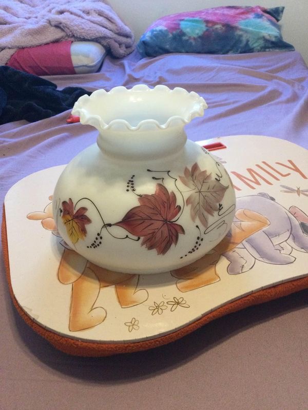 Glass shades with brown leaf vines decorating it. I have two of them