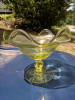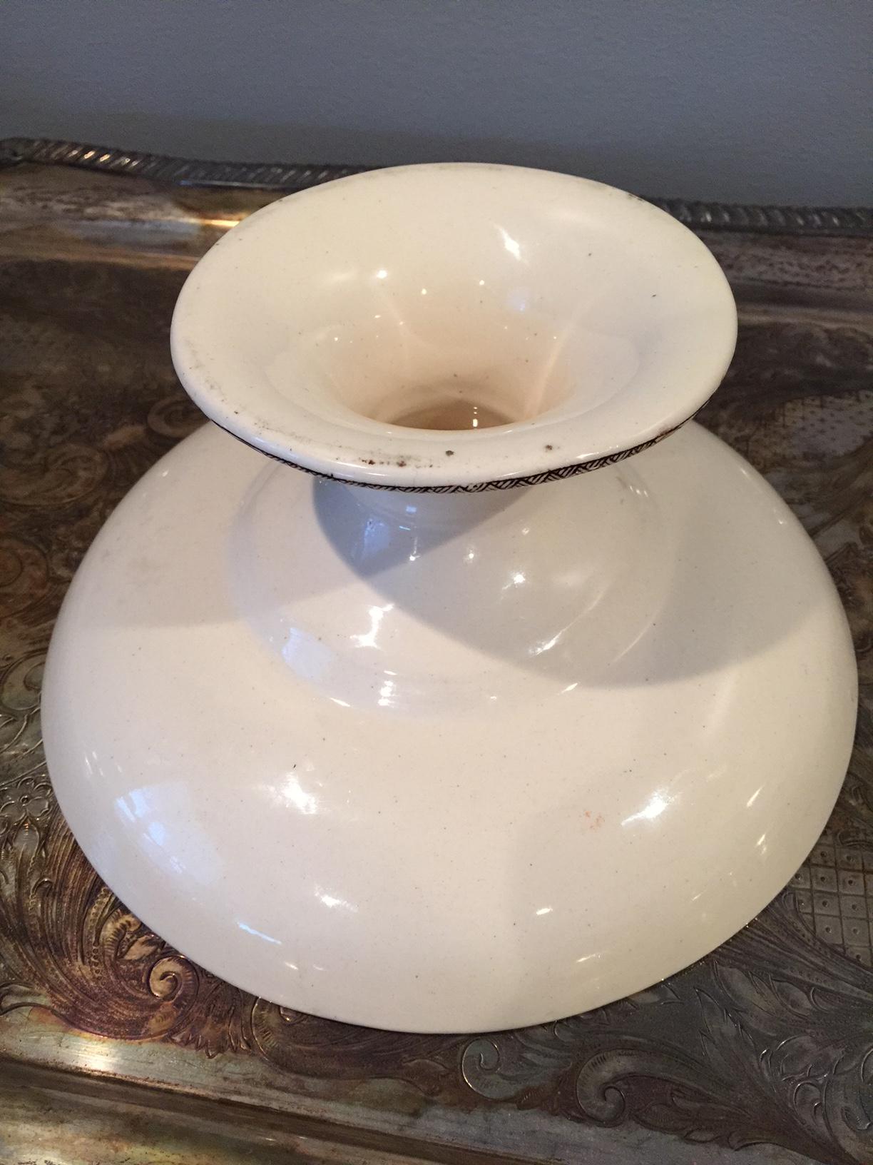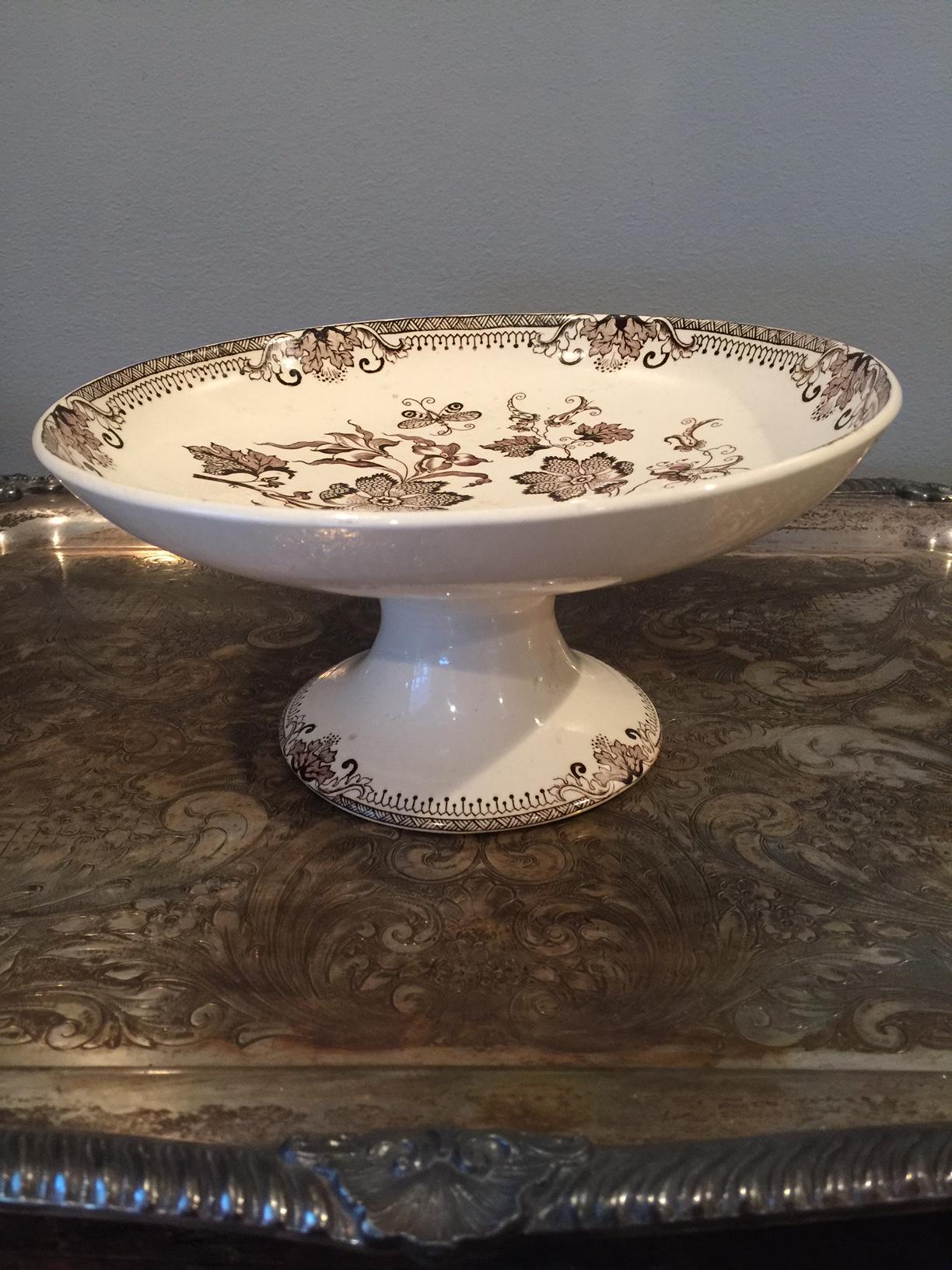 Ironstone pedestal compote with brown and white designs. There are no stamps and/or marks. 9" in diameter and 4.37" in height.