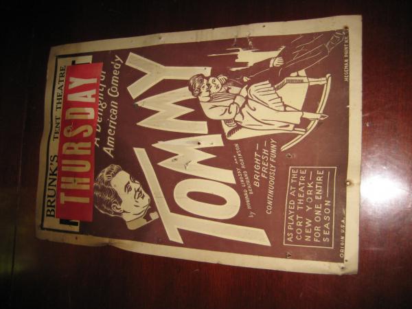 Brunk's tent theater traveled in the south central states 1910-1950. The Thursday is an overlaying sticker. I have not cleaned it. Found it remodeling my house.