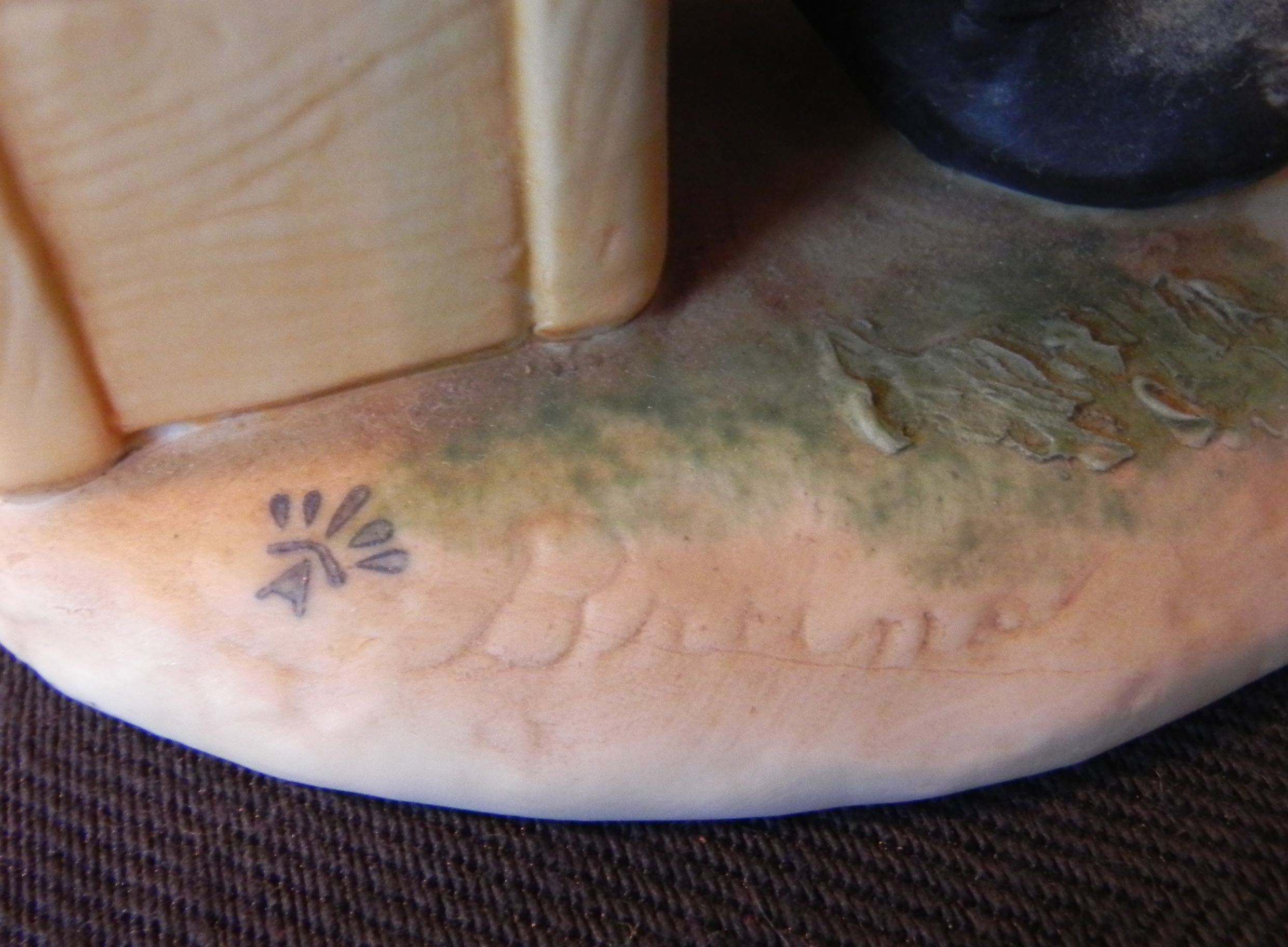 Porcelain bisqu figurine of seated fiddler. Mark: stylized crown over the letter "A" and the signature "Bruno"