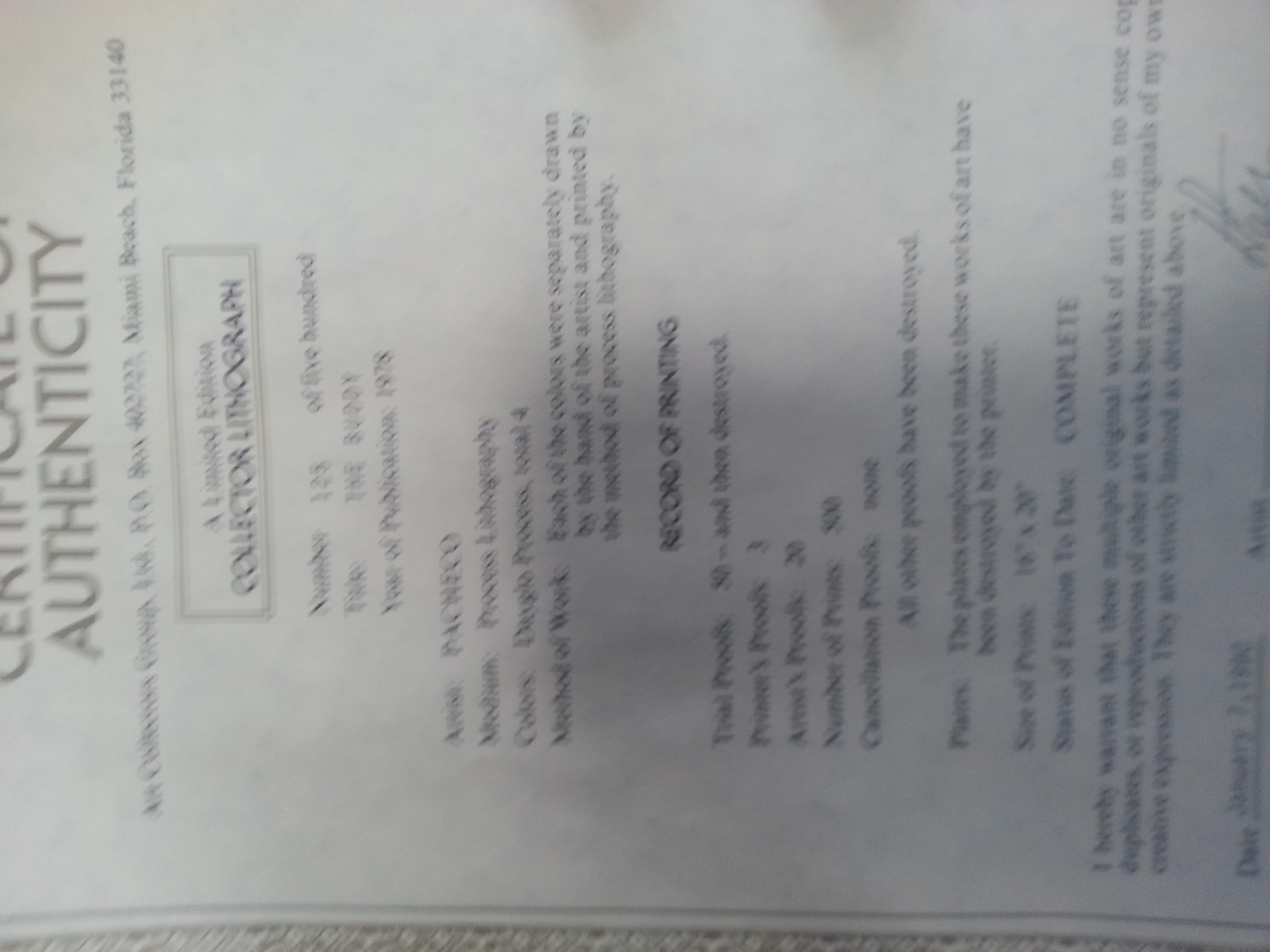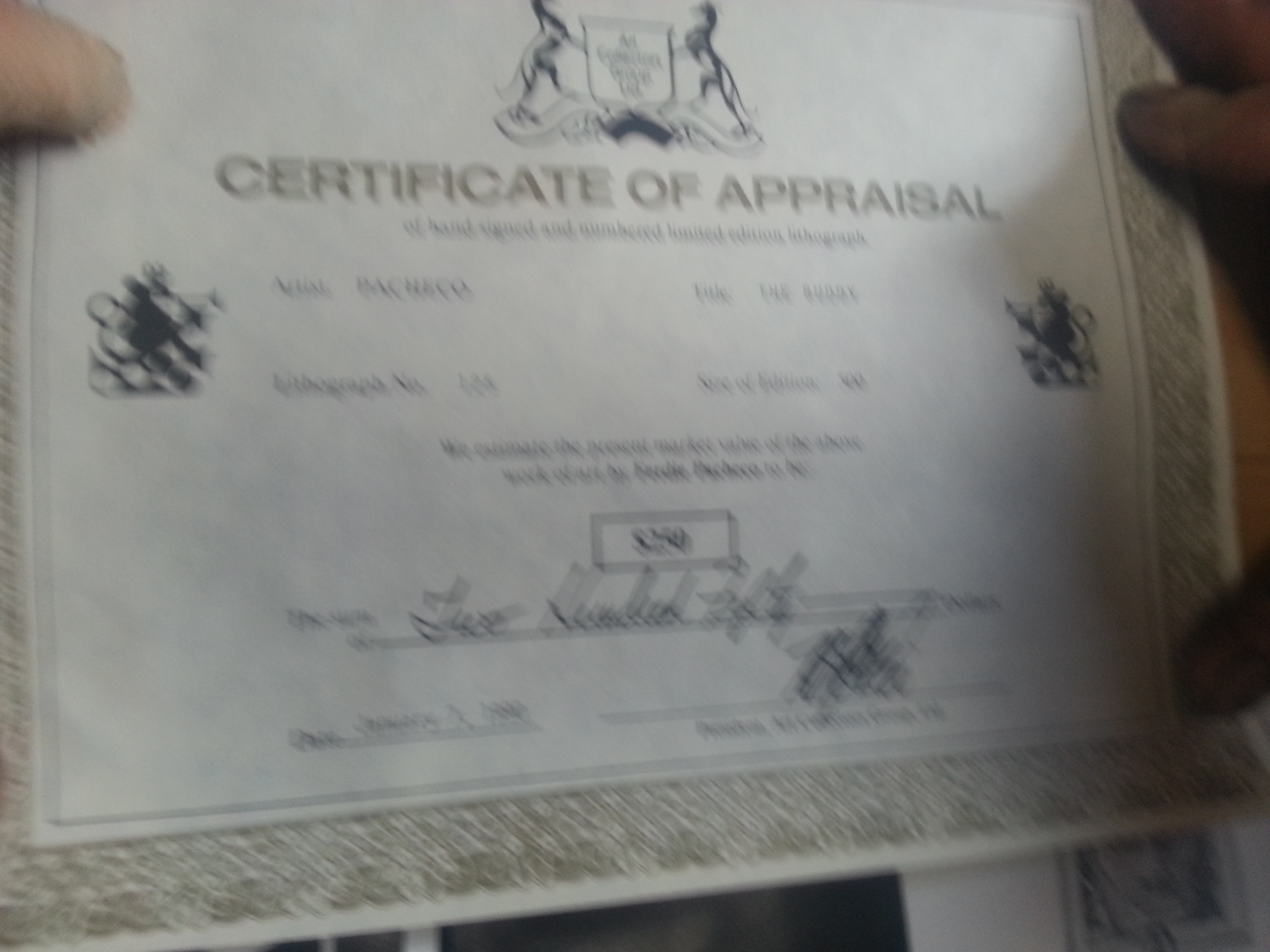 I have a drawing or painting that a friend had given me a long time ago. its by Ferdie Pacheco who was Muhammed Ali's corner Dr. . it comes with a certificate of authenticity & an appraisal from 1990 . I was inquiring about its worth today.