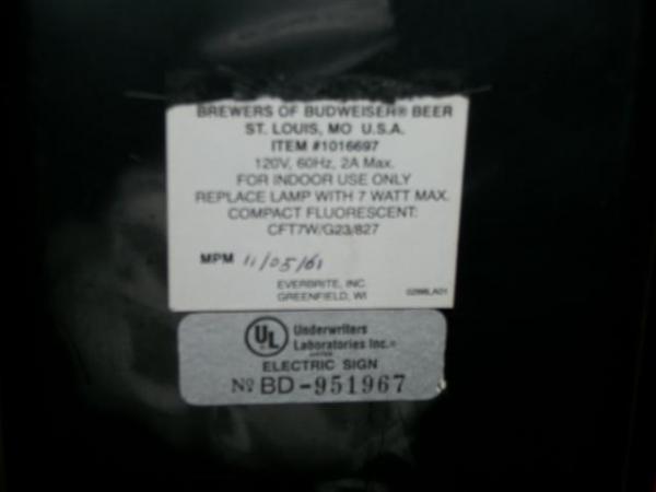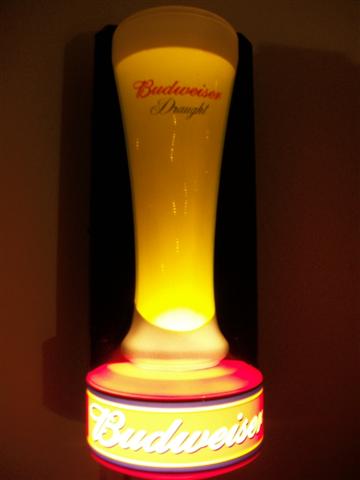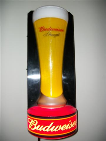 This is a Budweiser light shaped like a glass filled with beer and the lights inside chase from bottom to top simulating the bubbles. There is a sticker on the back that says Brewers of Budweiser Beer, St. Louis, MO, USA/ Item # 1016697/ MPM 11/05/61, Everbrite, Inc., Greenfield, WI