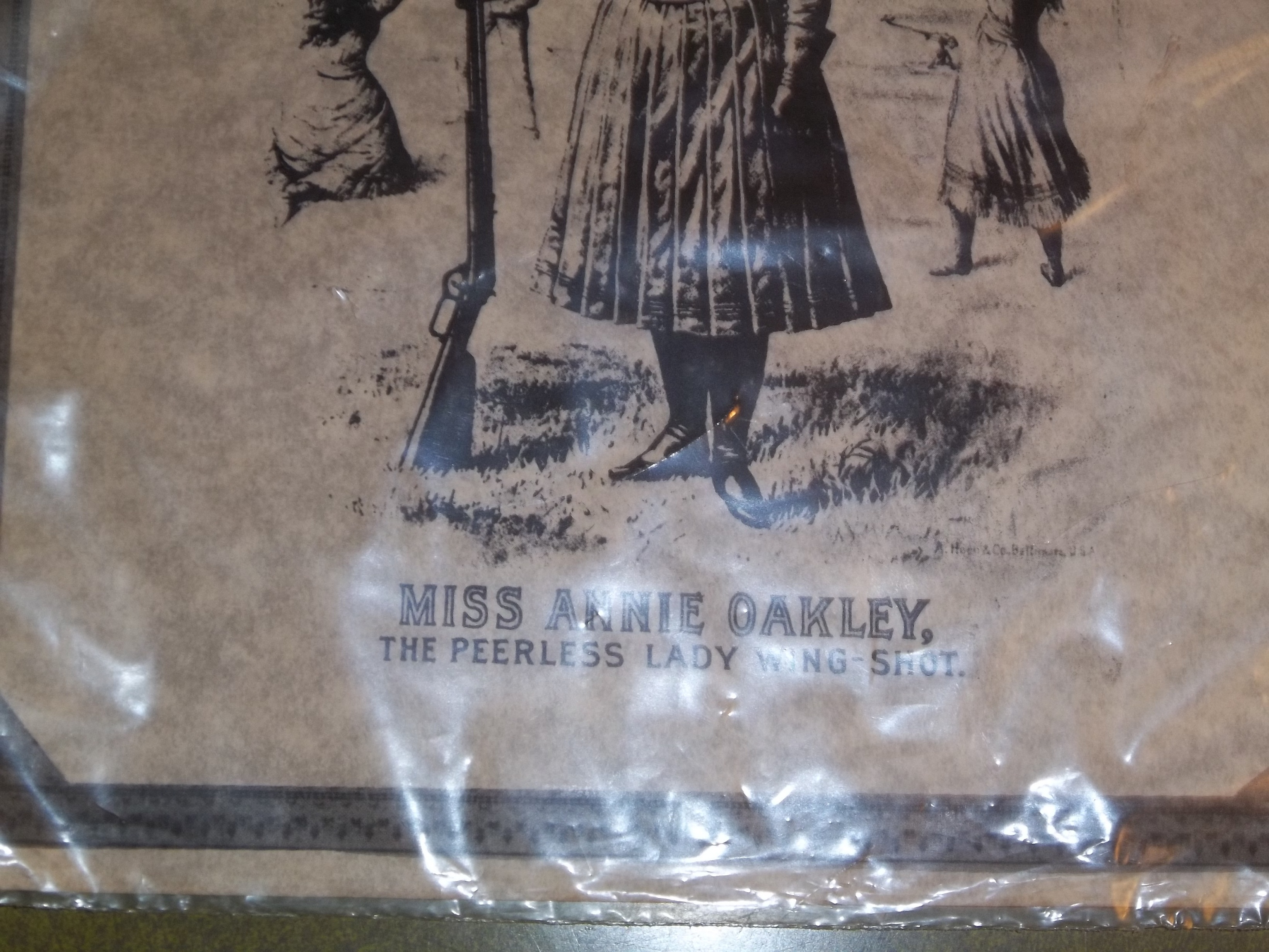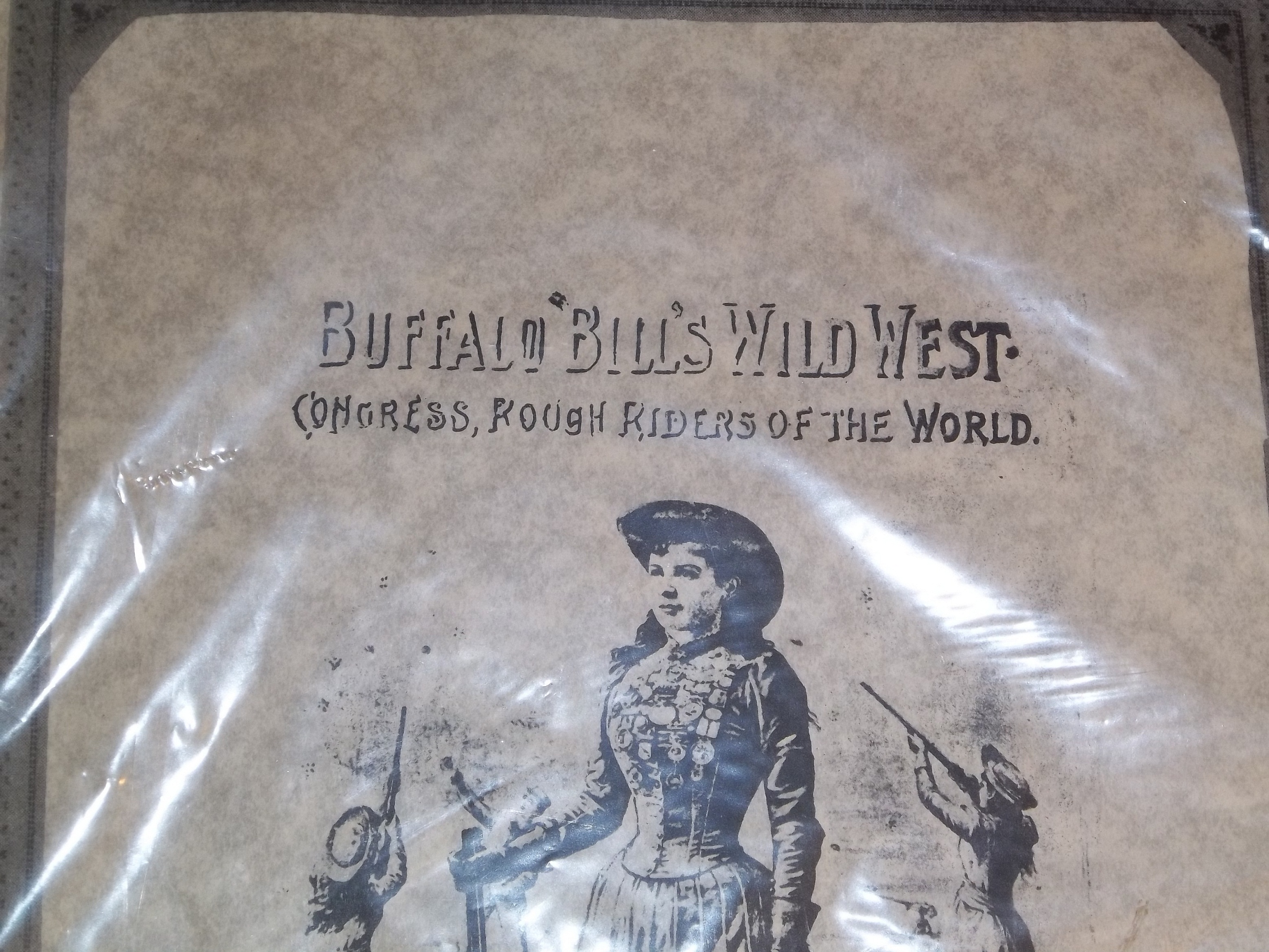 print of Buffalo Bills Wild West featuring image of Annie Oakley.  Top of print reads: Buffalo Bill's Wild West, Congress, Rough Riders of the World.  Bottom of print reads: Miss Annie Oakley, The Peerless Lady Wing-Shot.  Image is of Annie Oakley posed with rifle/shotgun with 2 background images of her taking a shot. Print is black ink, may be a 'stamp' print. Entire image has border with minimal detail.  print is in plastic sleeve.