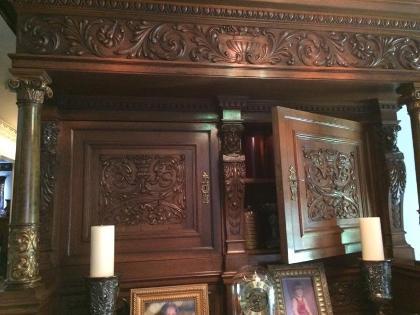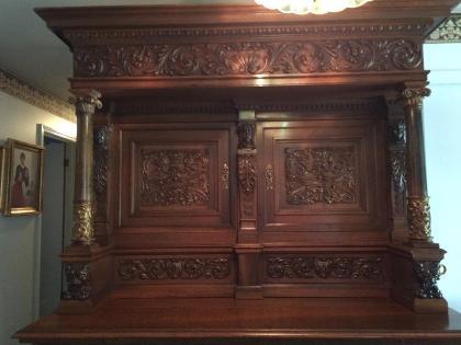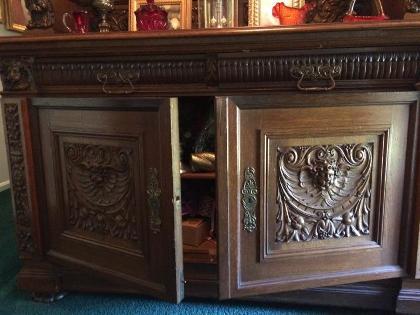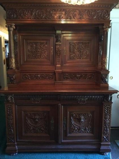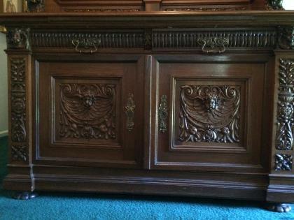 Red German Oak. good condition, only 1 small crack. Two units: bottom is 35" tall X 63" wide X 31" deep. Top is 35" tall X 63" wide X 23" deep. Bottom unit has two long silverware drawers and a 3' breadboard. Purchased in 1962.