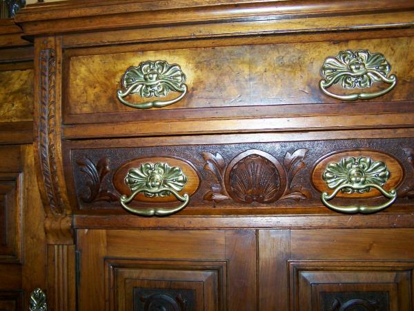 Possibly walnut. No veneer except on the 3 drawer fronts and it looks like burl. Original brass hardwear. 100% wood. Top is 1/2 inch thick solid plank. Has cellaret drawer in sideboard. Had a hutch at one point. Hand carved doors and drawer front, middle 2 stick out then curve back in.... No idea of the date or origin. Help please, whats the wood and value? Thank you