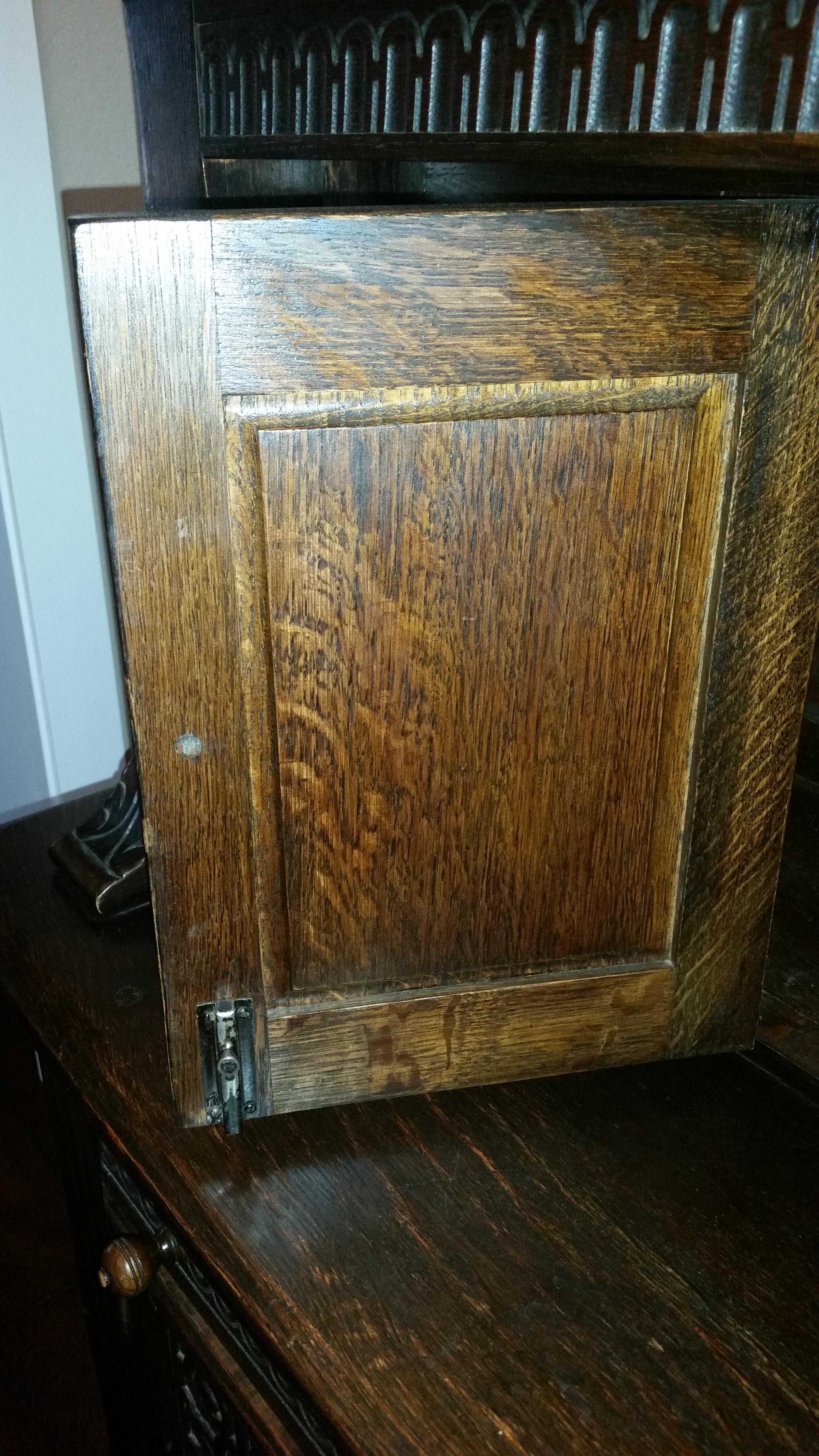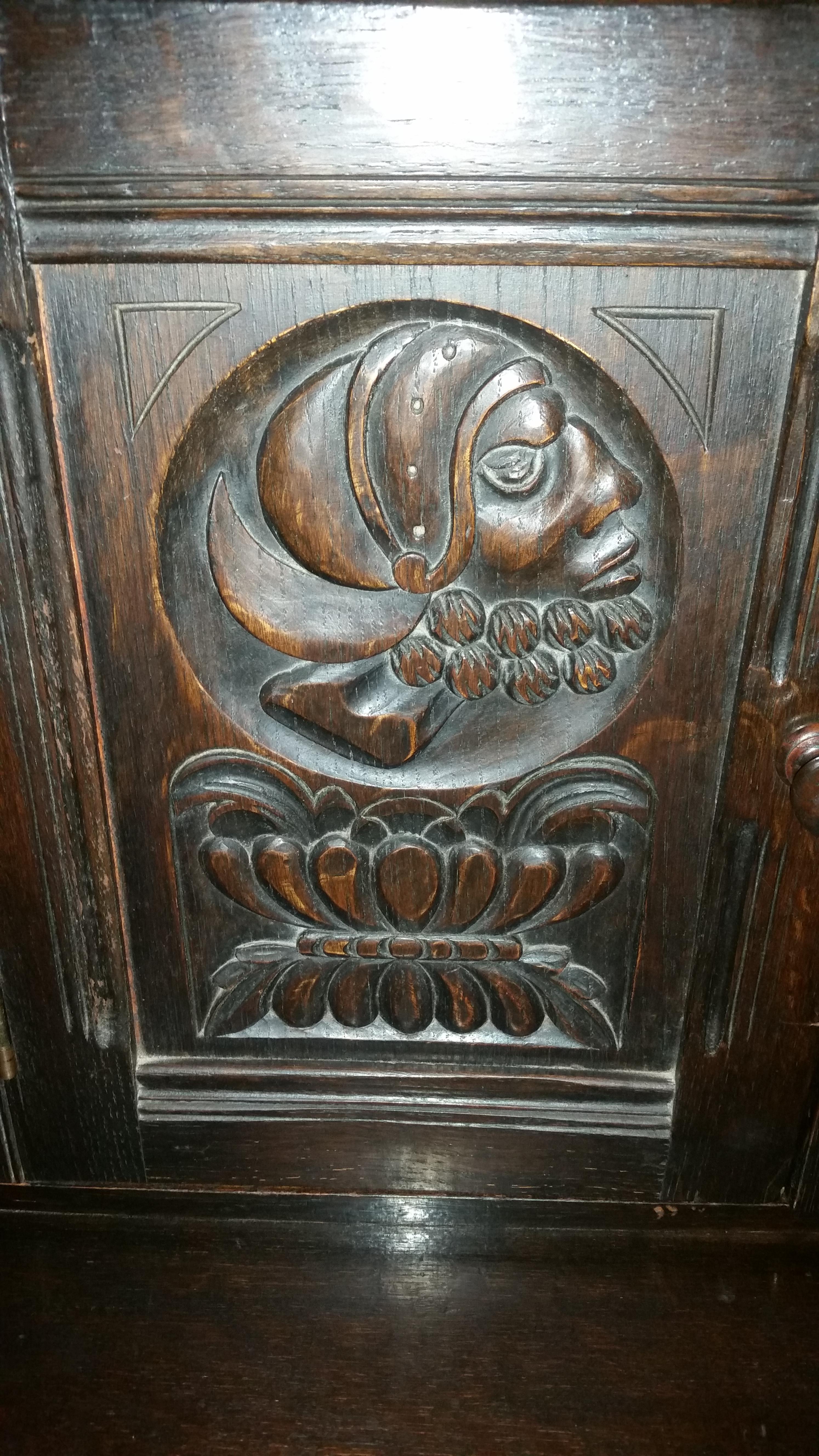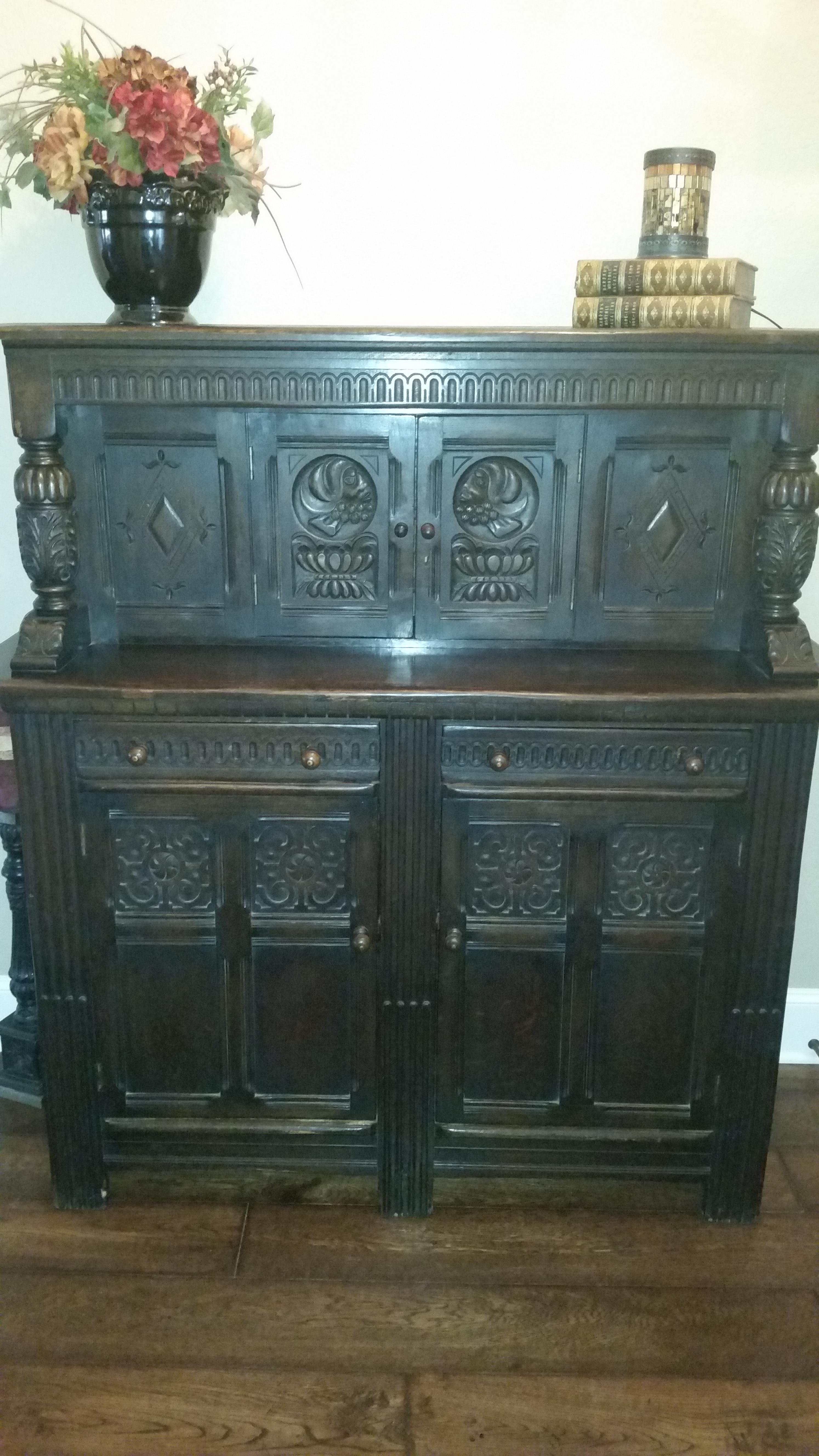 Recently purchased this item from a flea market. Measure 57" tall x 54" wide x 21" deep. Nice heavy solid piece. Two upper cabinet with lock (no key) two middle drawers and two lower cabinets. No identifying markings.