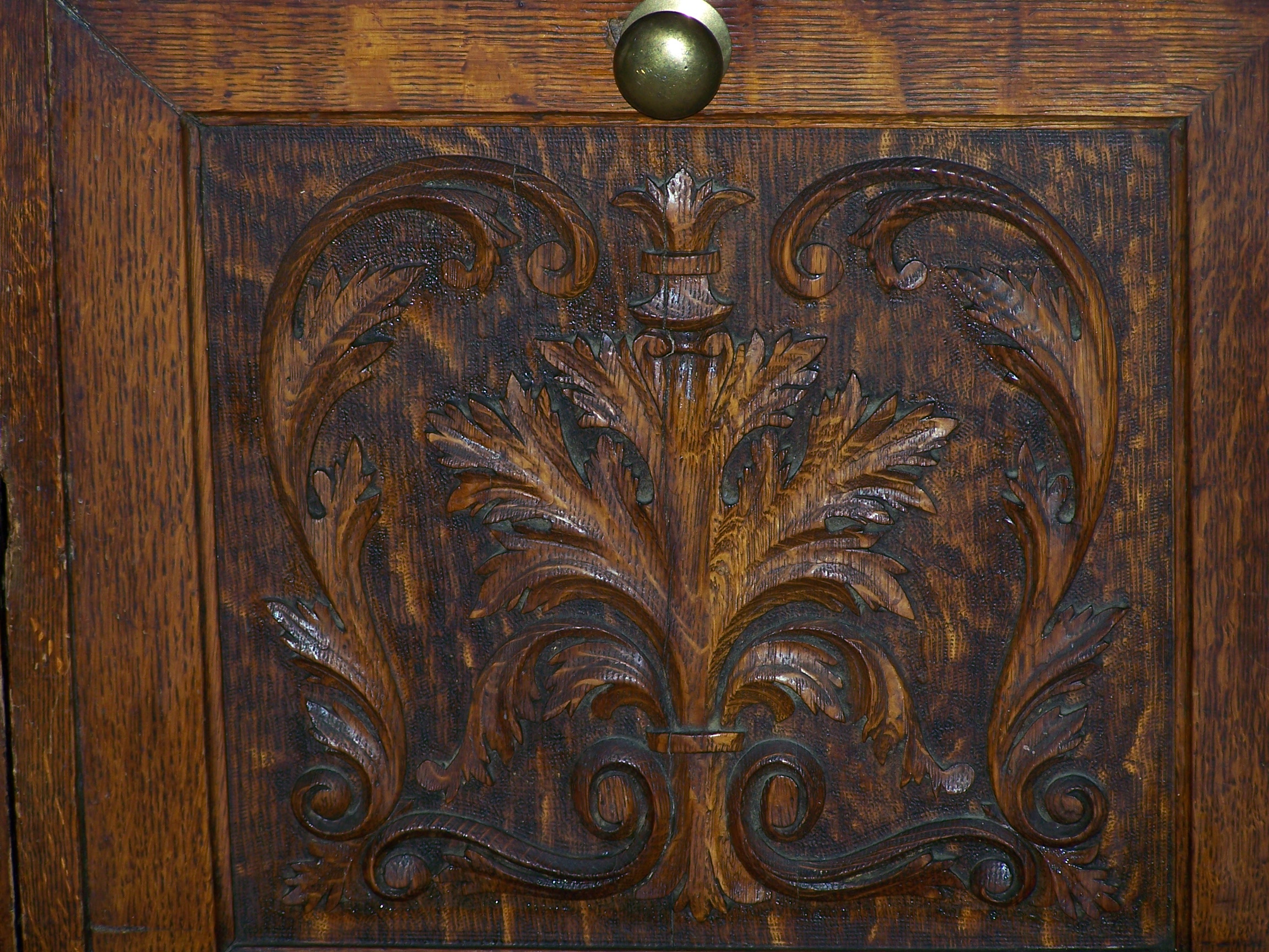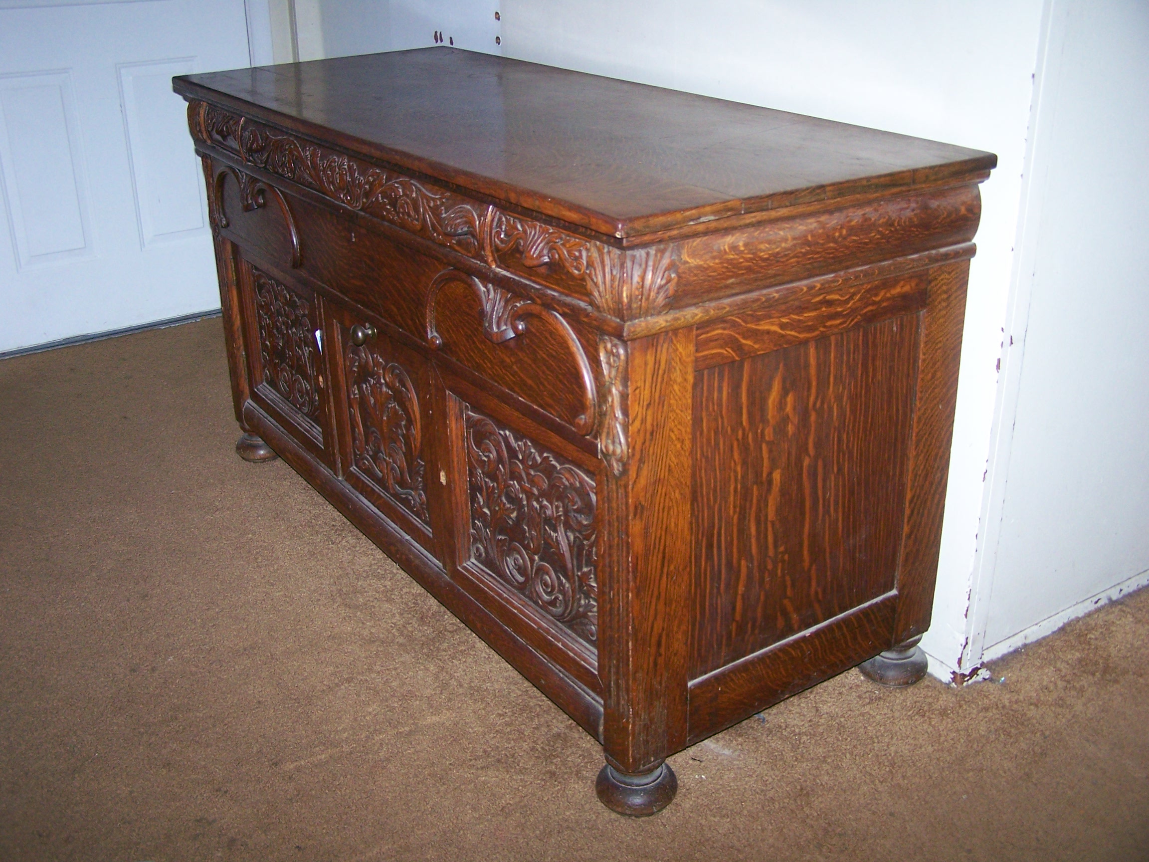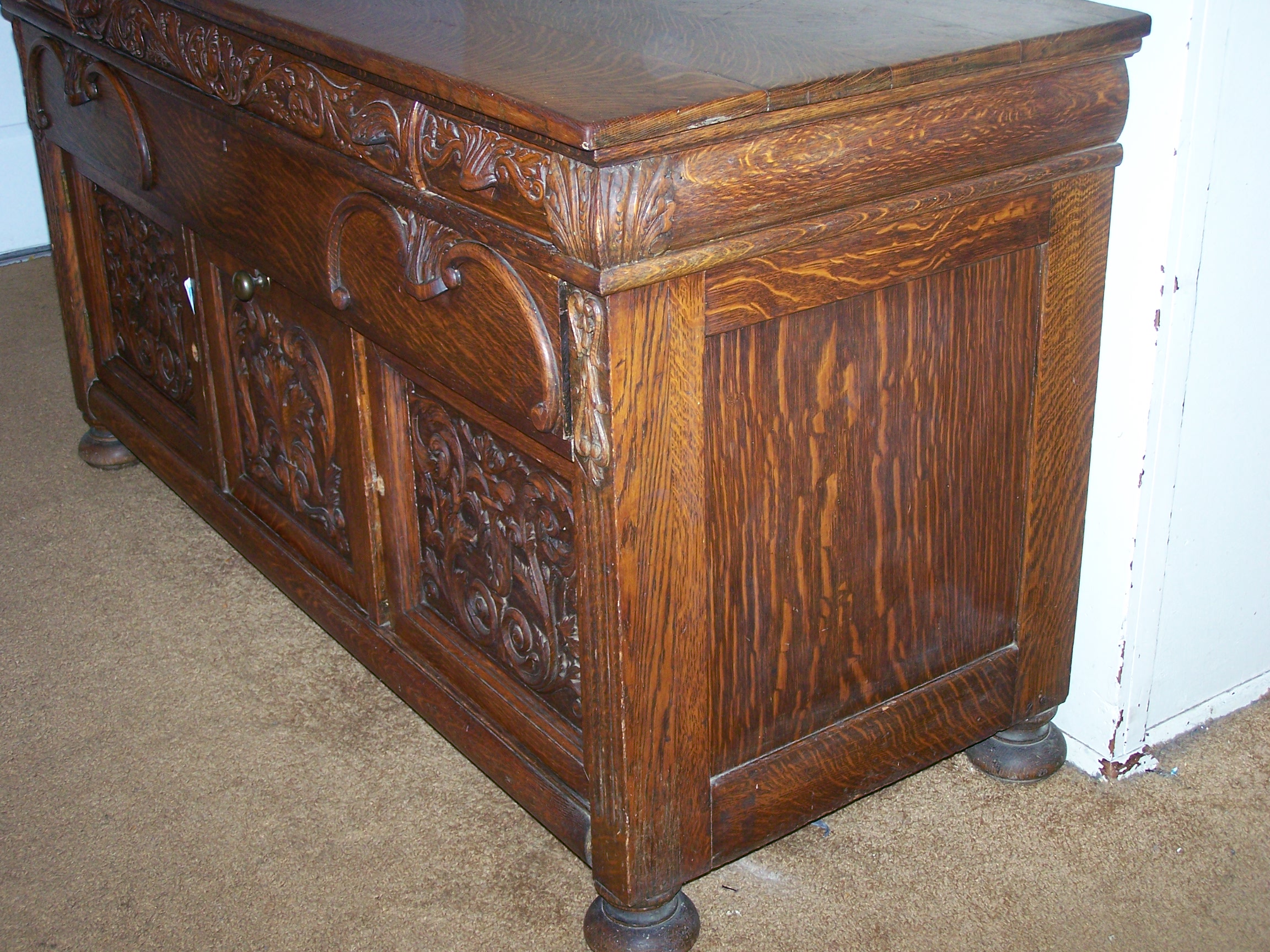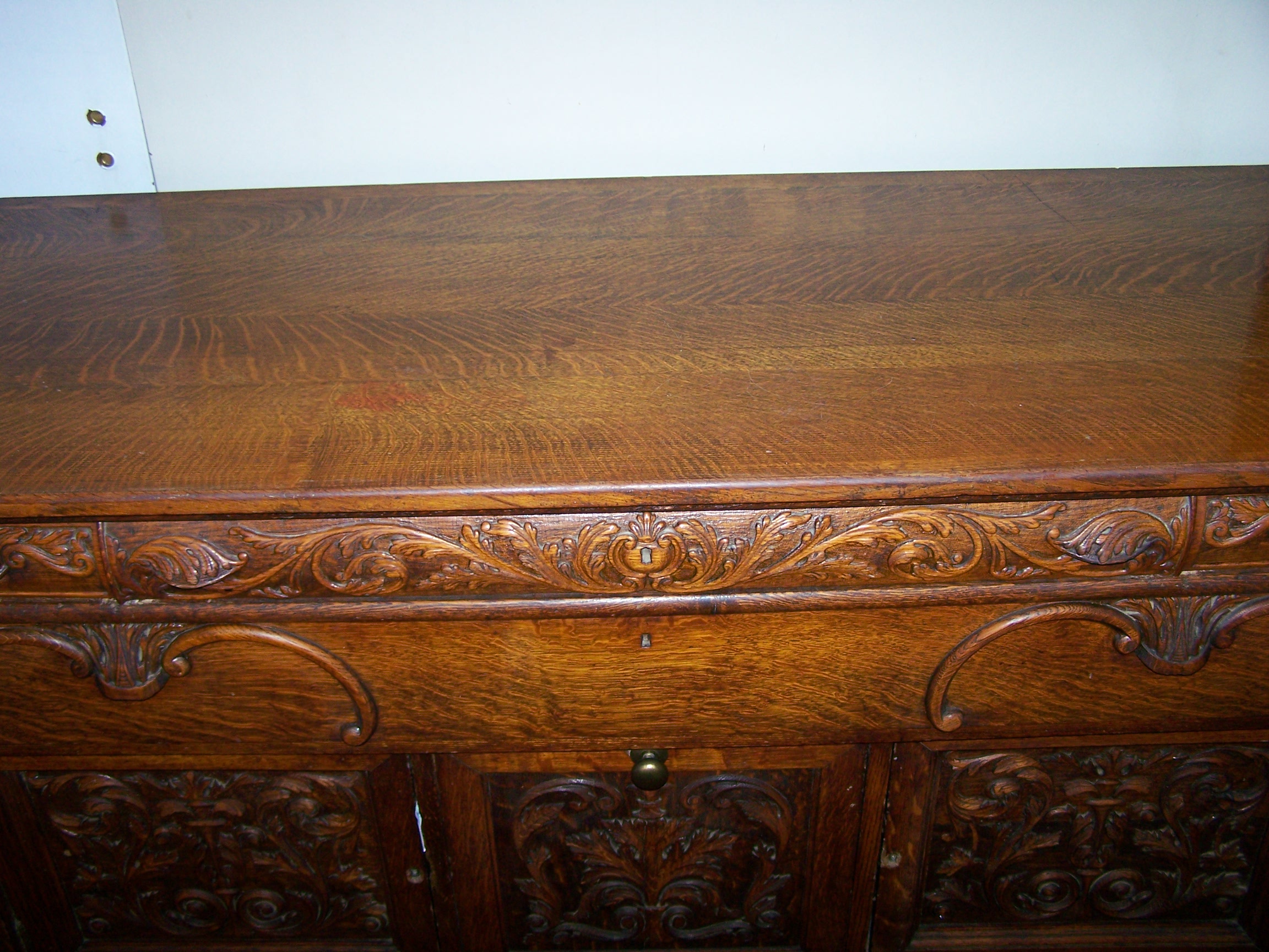 Large buffet, I believe is oak. One large drawer, one smaller drawer, and two small side drawers. Each side has a cabinet style door and one drop door in the middle. Inside the drop door is three hidden drawers. It is carved with great detail on the doors and drawer fronts. No name/names any where on this piece inside or out. I am estimating that it is from the 1900-1930 era. I have searched extensively for a similar piece to compare the value, but I have never found anything similar.