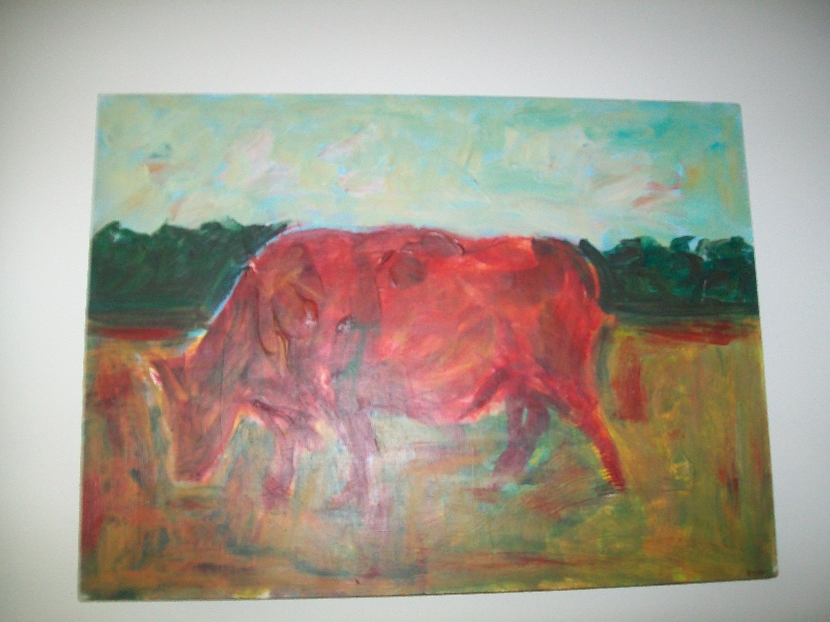 Artist is Elemore Morgan Jr. It is a painting of a red bull in a field.I bought it at a yard sale so i dont know anything else about it. I also have another by the same artist. It is a scenic painting
