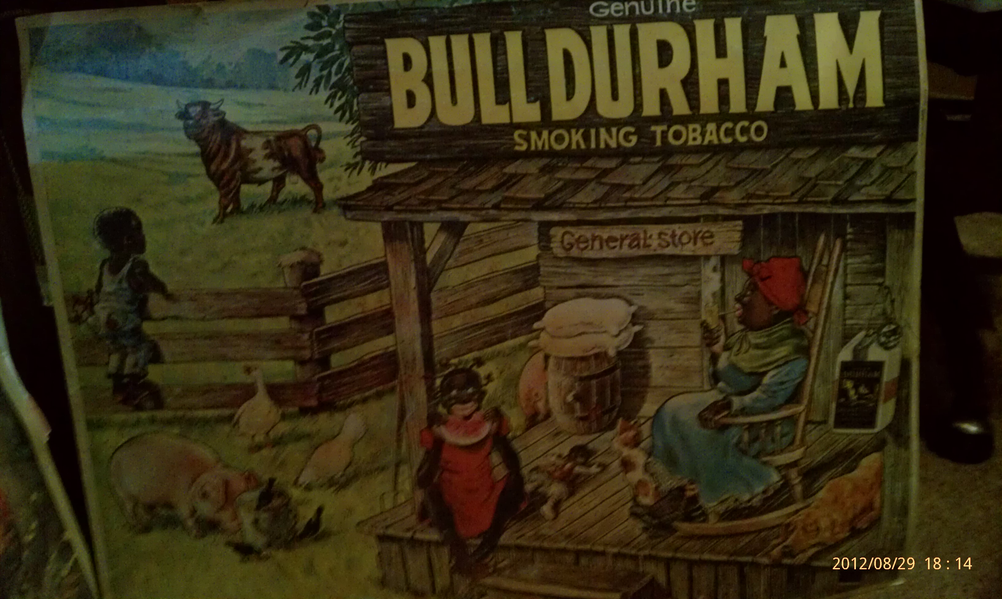Depicts: An older lady in a rocking chair with a pipe and a little girl on the porch with a slice of watermelon. A small boy on the fence facing the bull in the pasture, chickens and a pig eating in the yard with a bucket of seeds (assuming) that birds are eating out of.