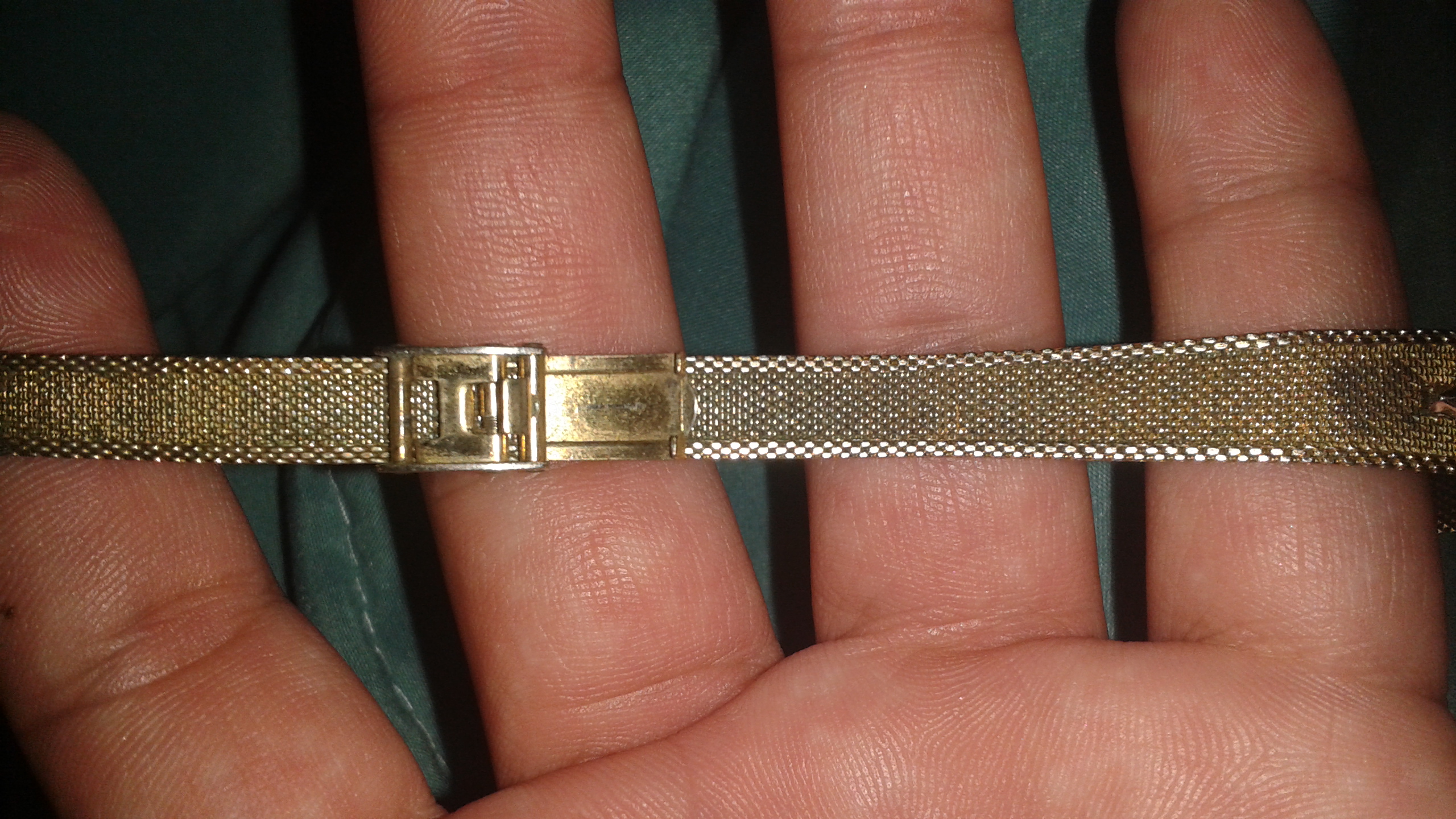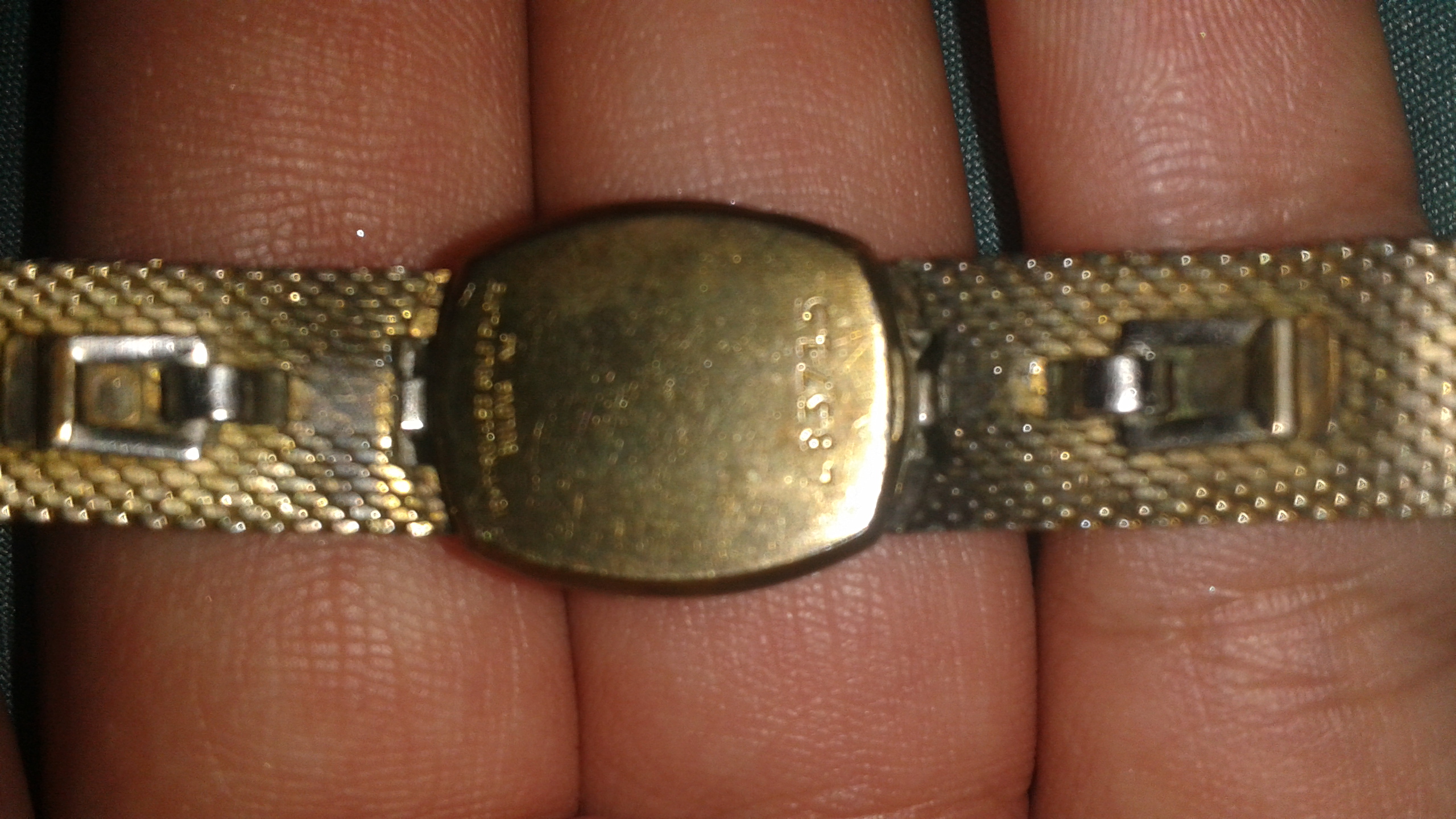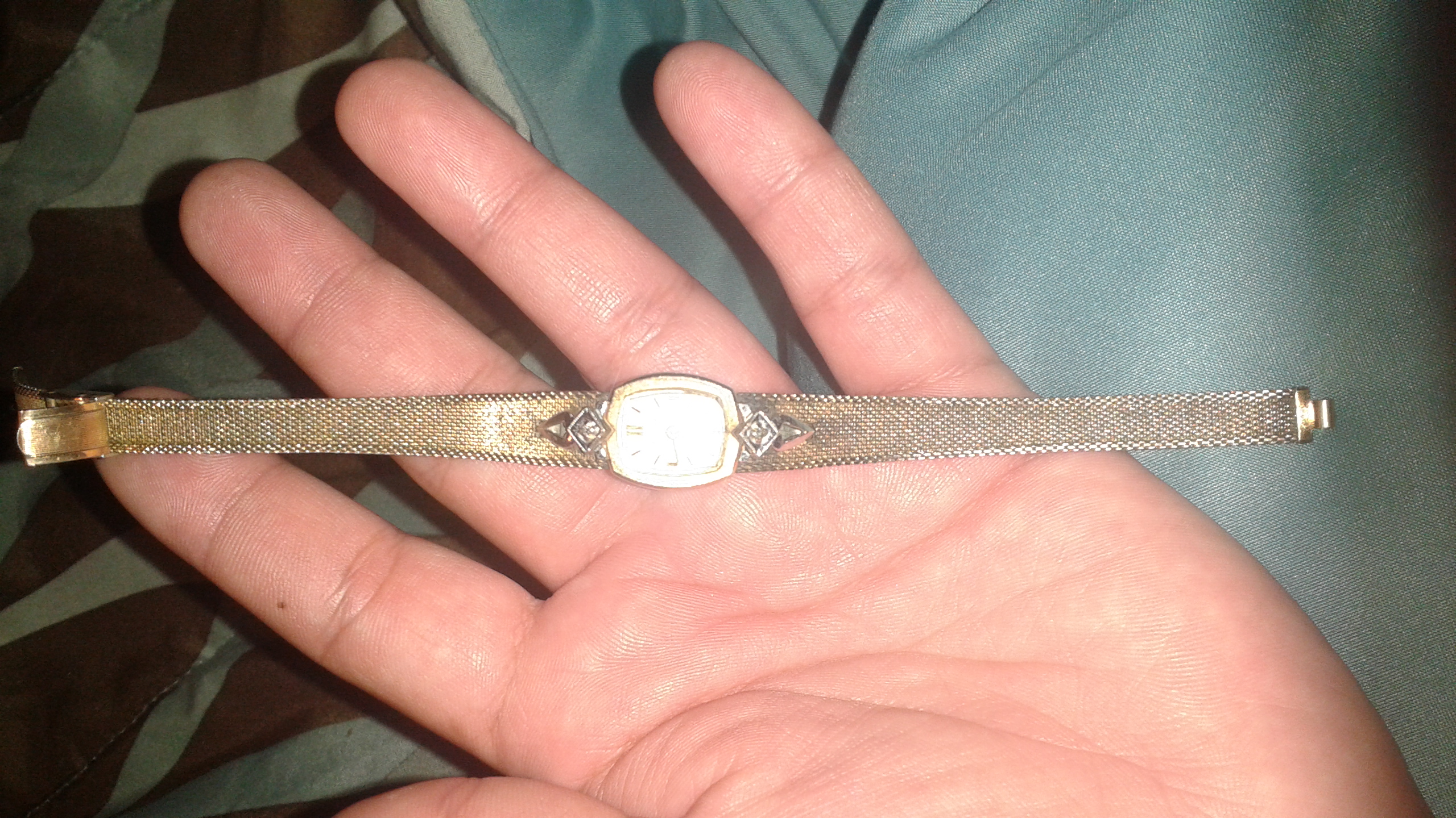 10k rolled solid plate it has a number on back L83715 it has silver on the ends of the face of watch with a diamond in the middle it was my grandmothers