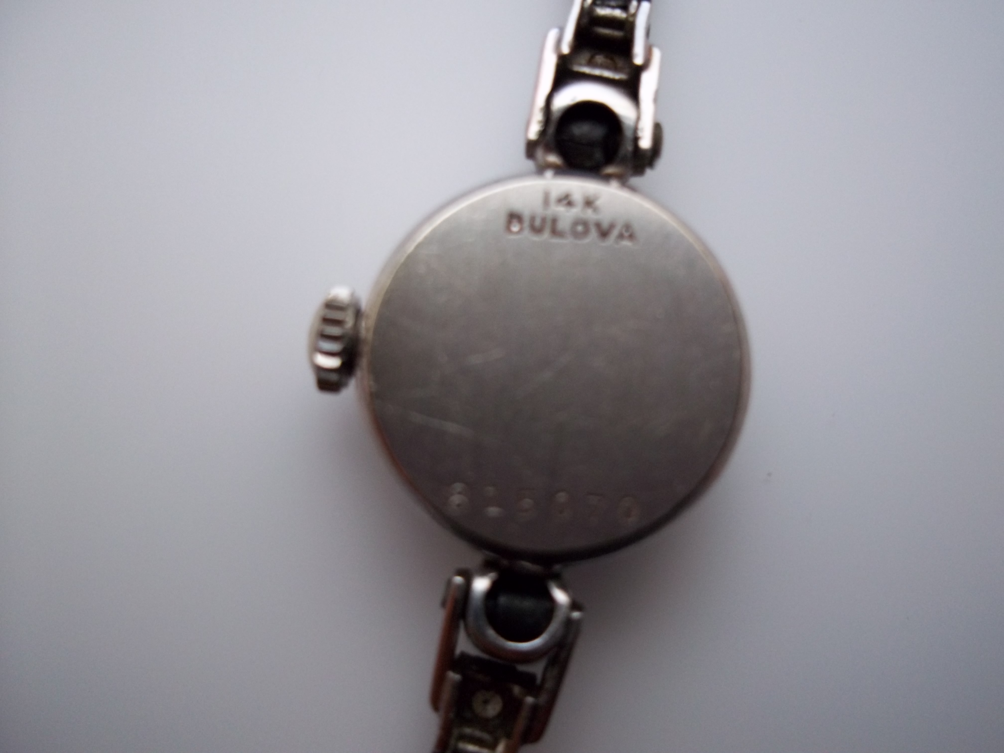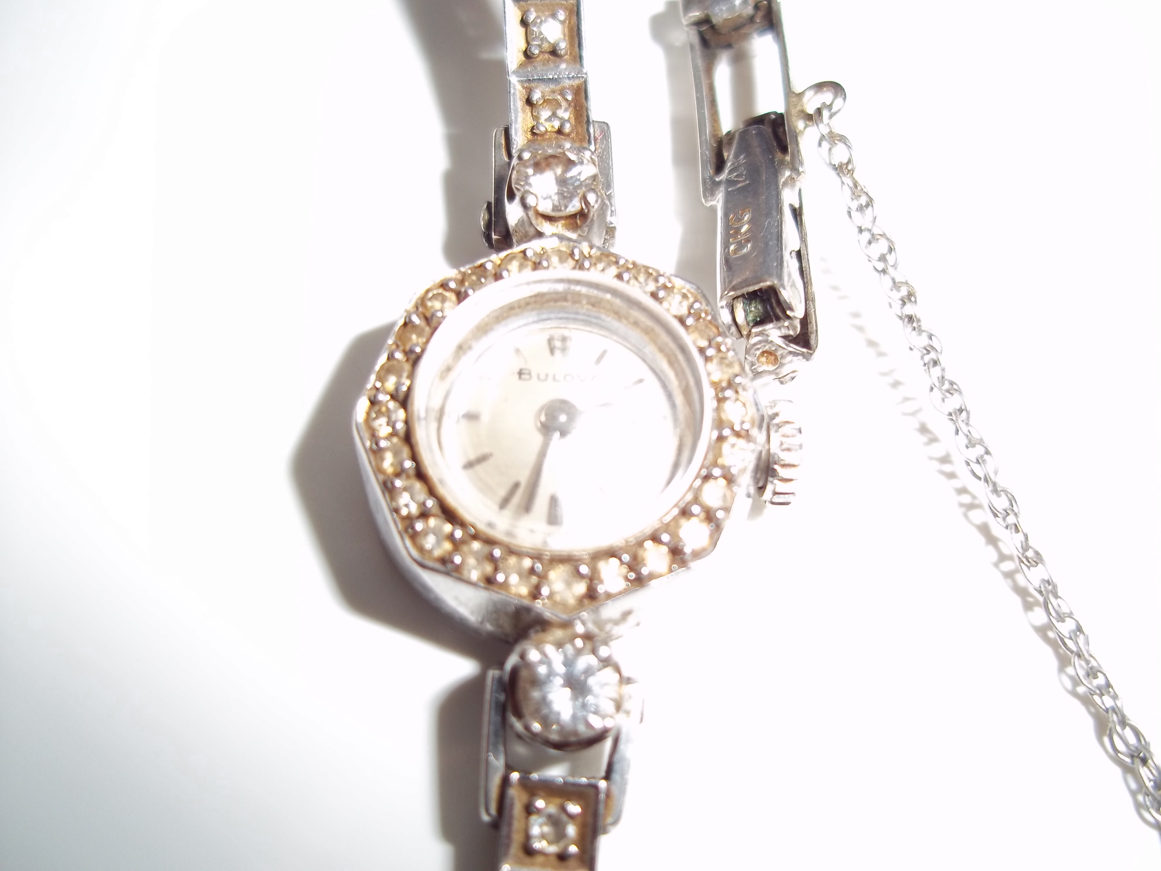 Swarovski crystal around the band 14k white gold Bulova antique watch Pre 1950's with two Diamond rewindable well taken care off.