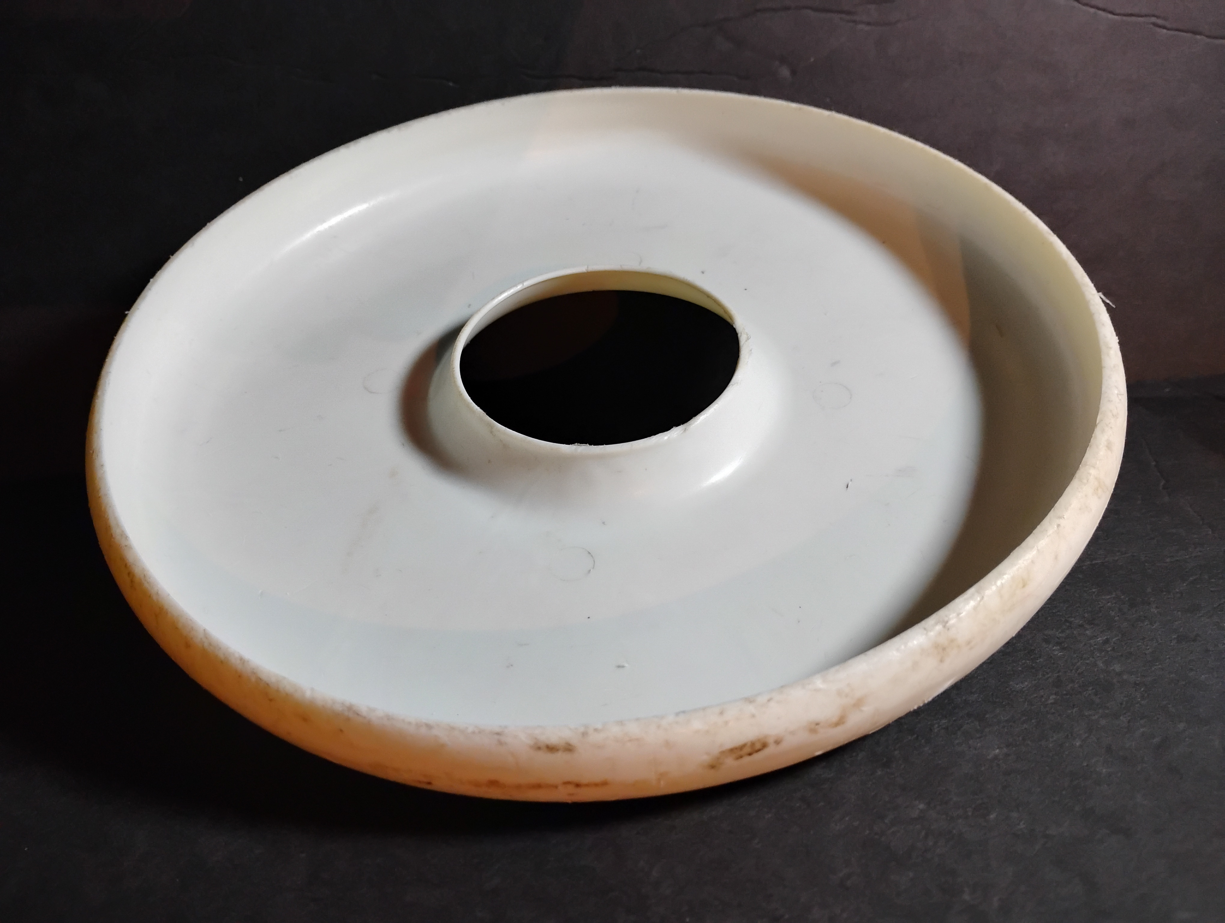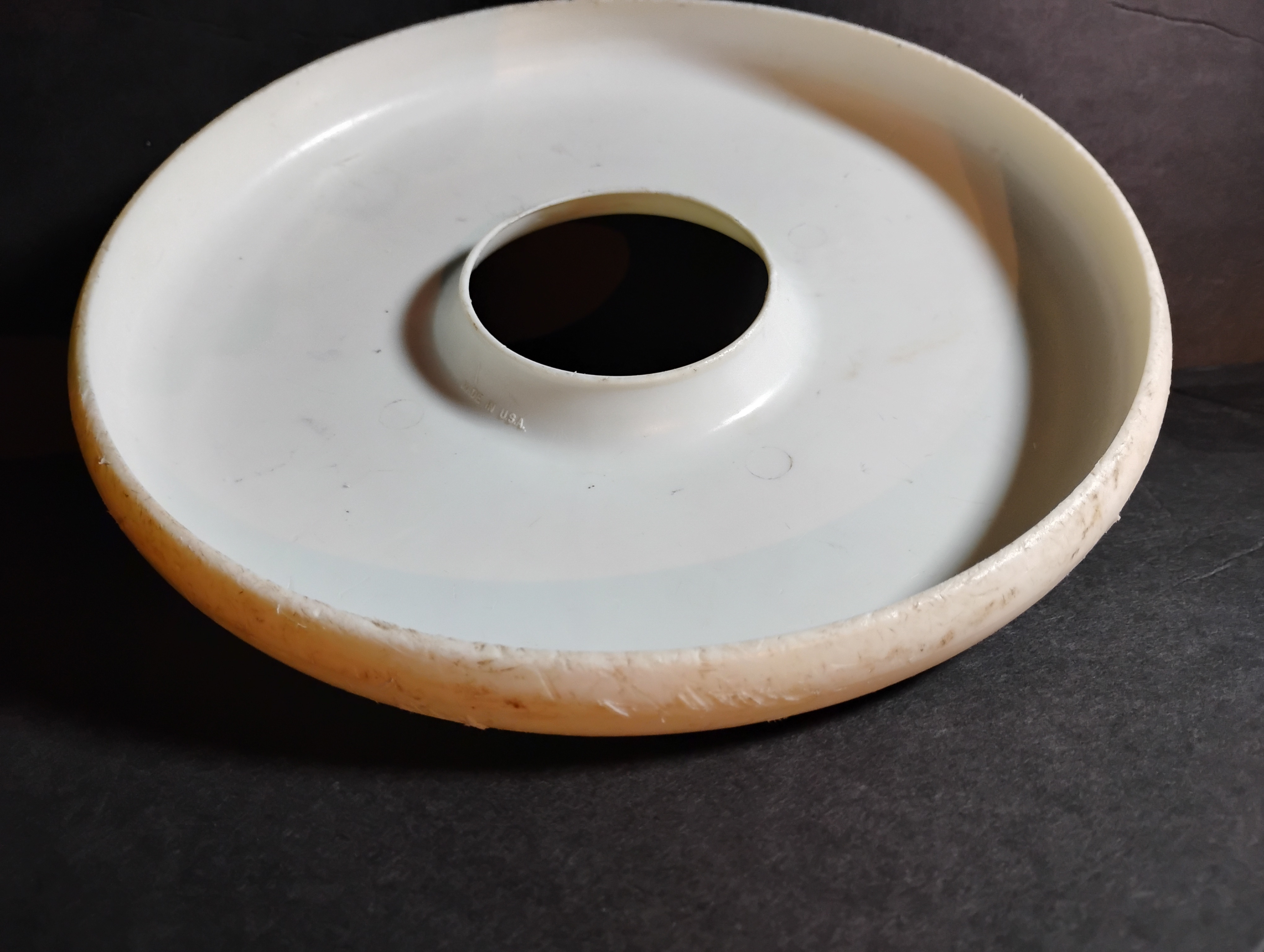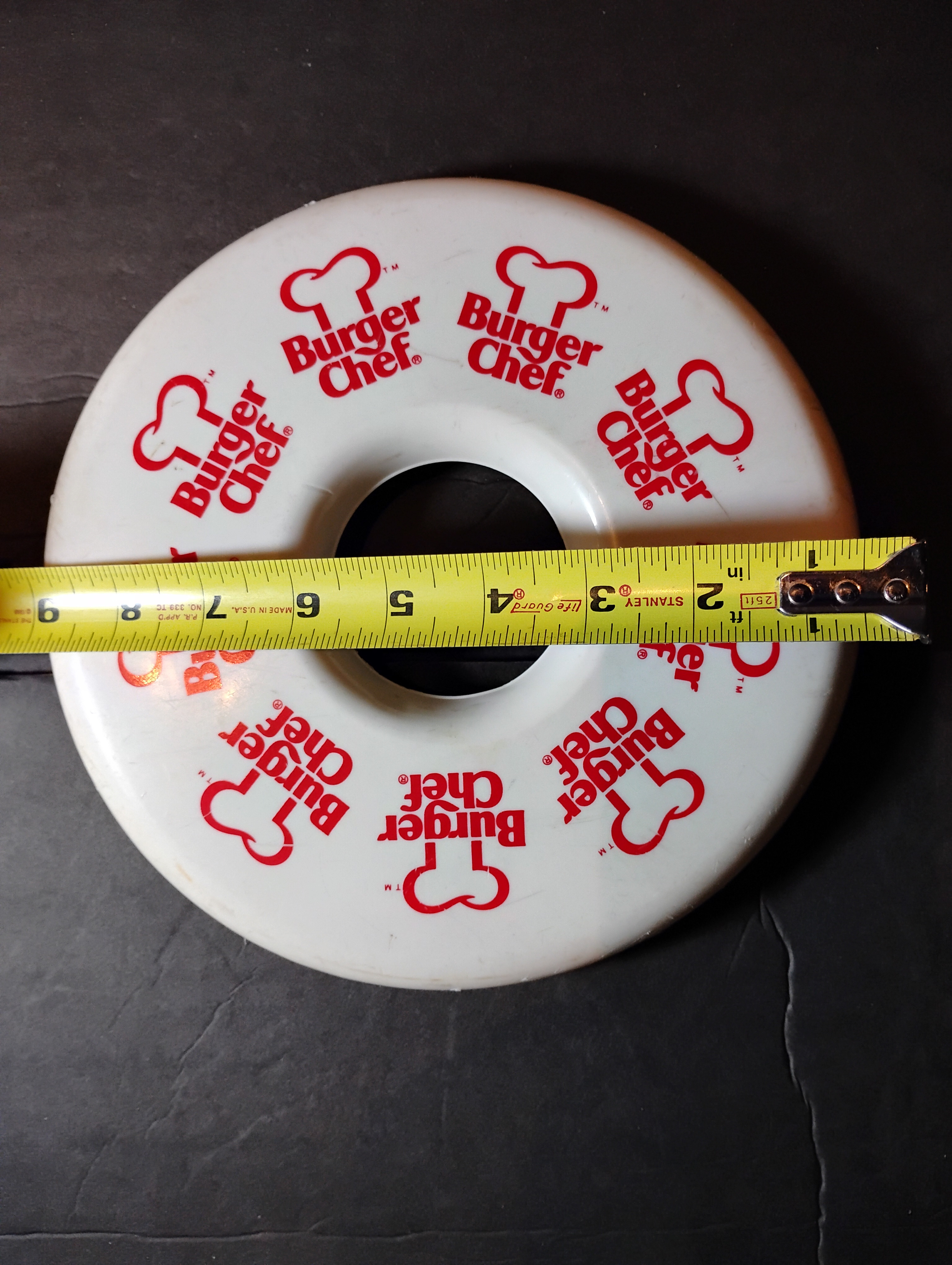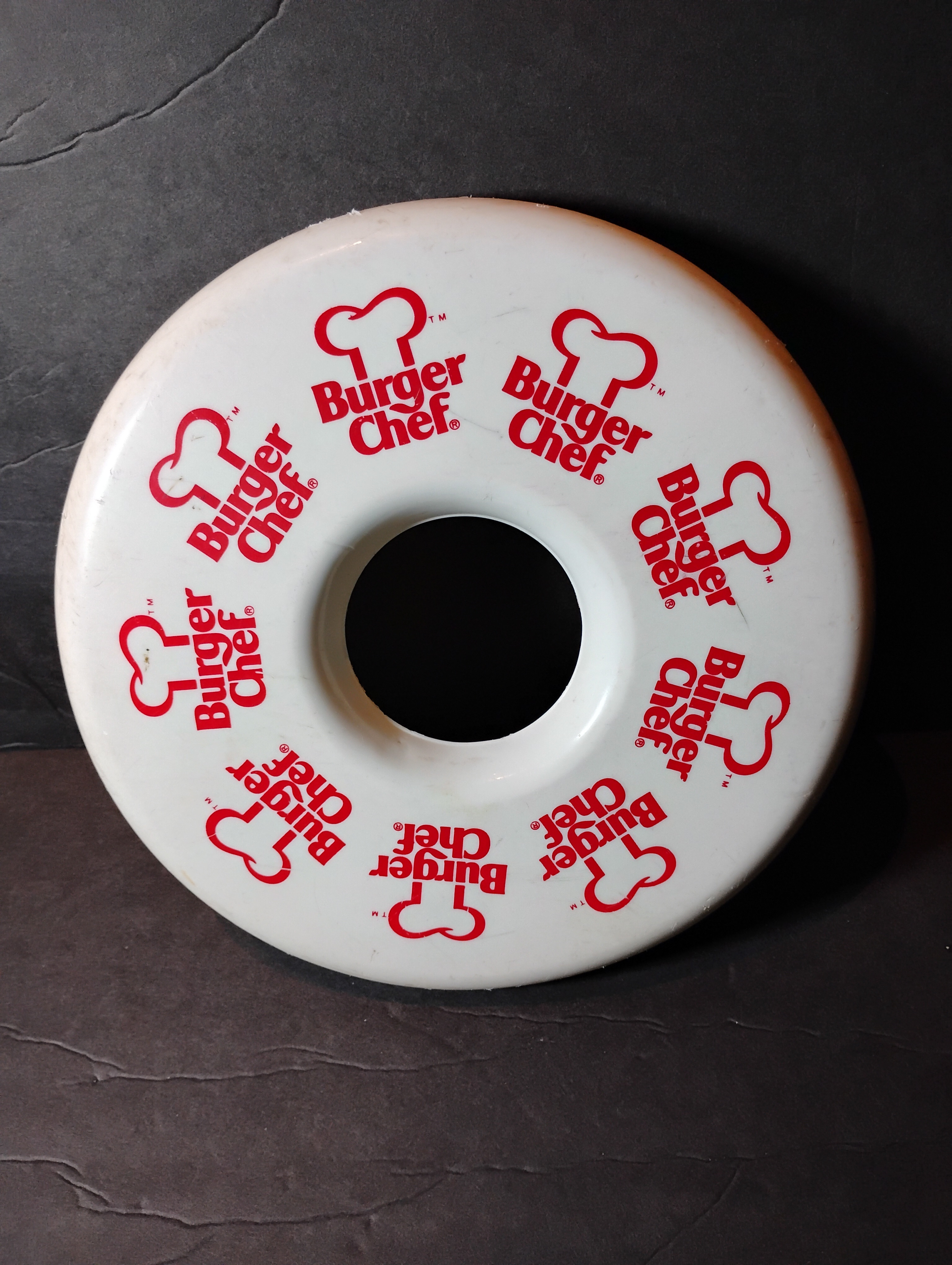 This is a promotional flying disc distributed by the now-defunct fast-food chain Burger Chef, which operated widely in the U.S. during the 1960s to early 1980s. This specific design is a rare “doughnut-style” ring disc — hollow in the center — made of plastic and measuring approximately 9 inches in diameter