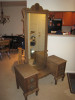 Vanity Dressing Table has seen a little more useage, it has a bit more superficial marks with a couple faint water marks, a few scrtches and one spot with deeper scratches in the size of a half dollar. That said... These don't penetrate through the veneer and are mostly un-noticed. With a new finish, it would be mint. I believe the veneer is 100% intact except a small knick or two where it meets the wall. B+ Condition.