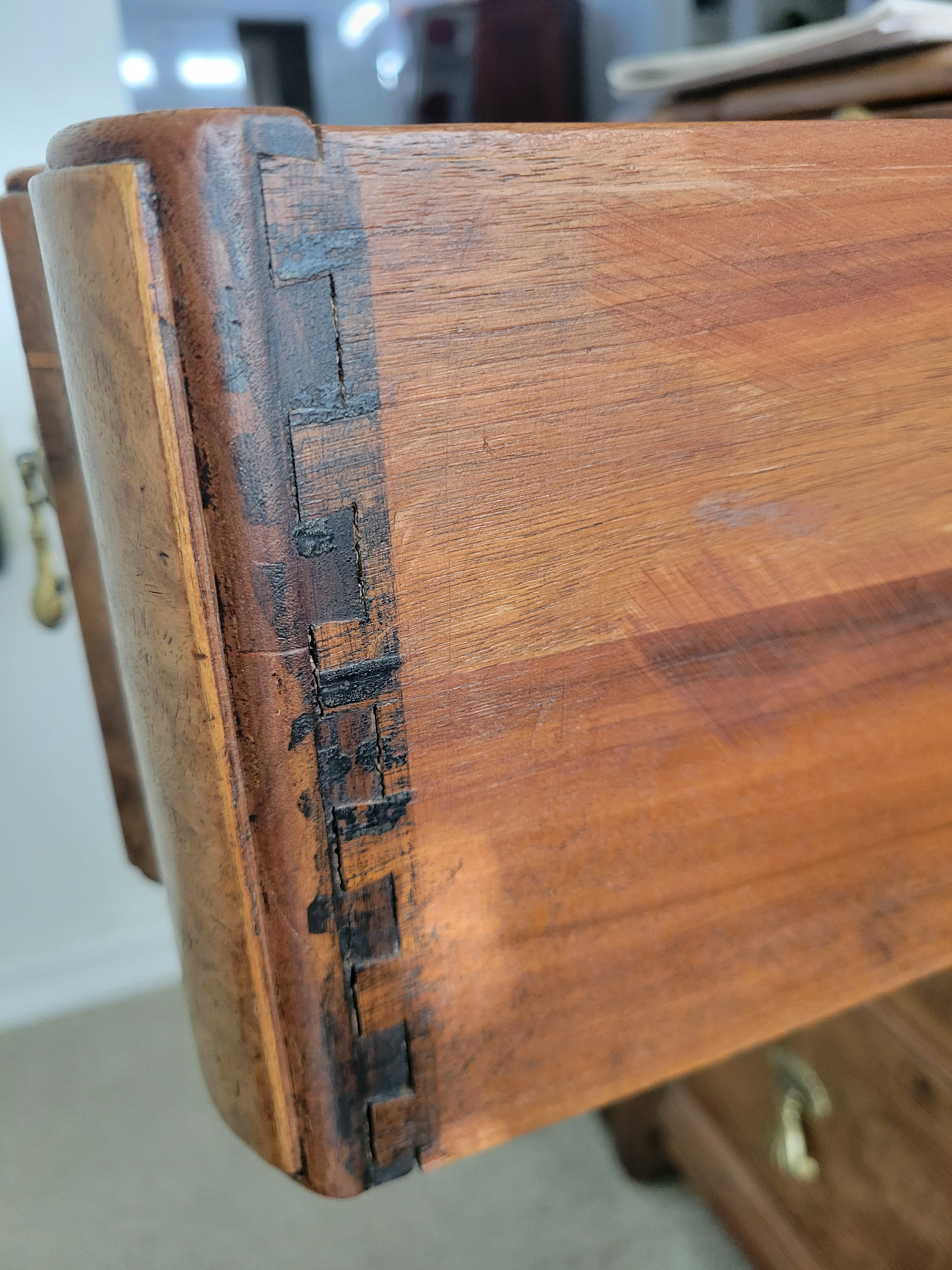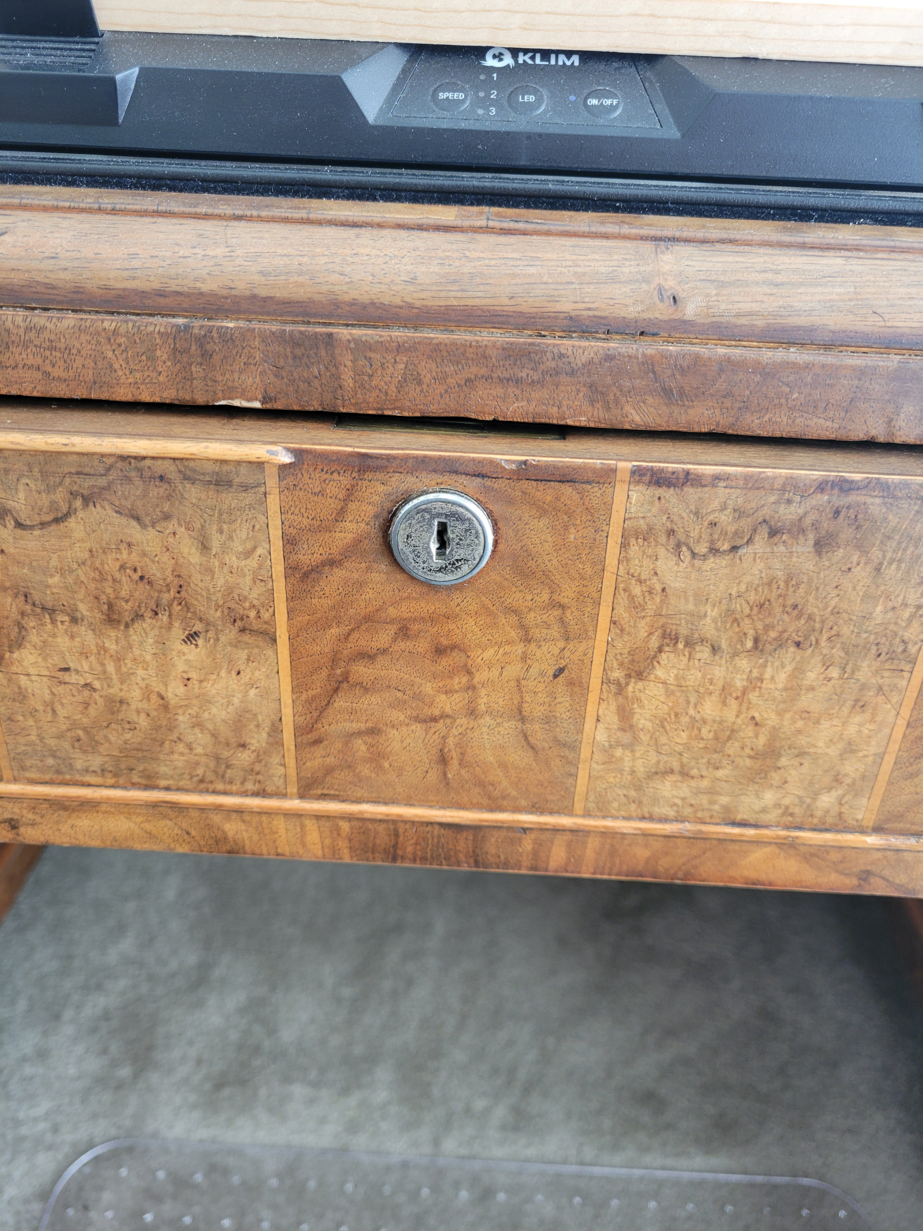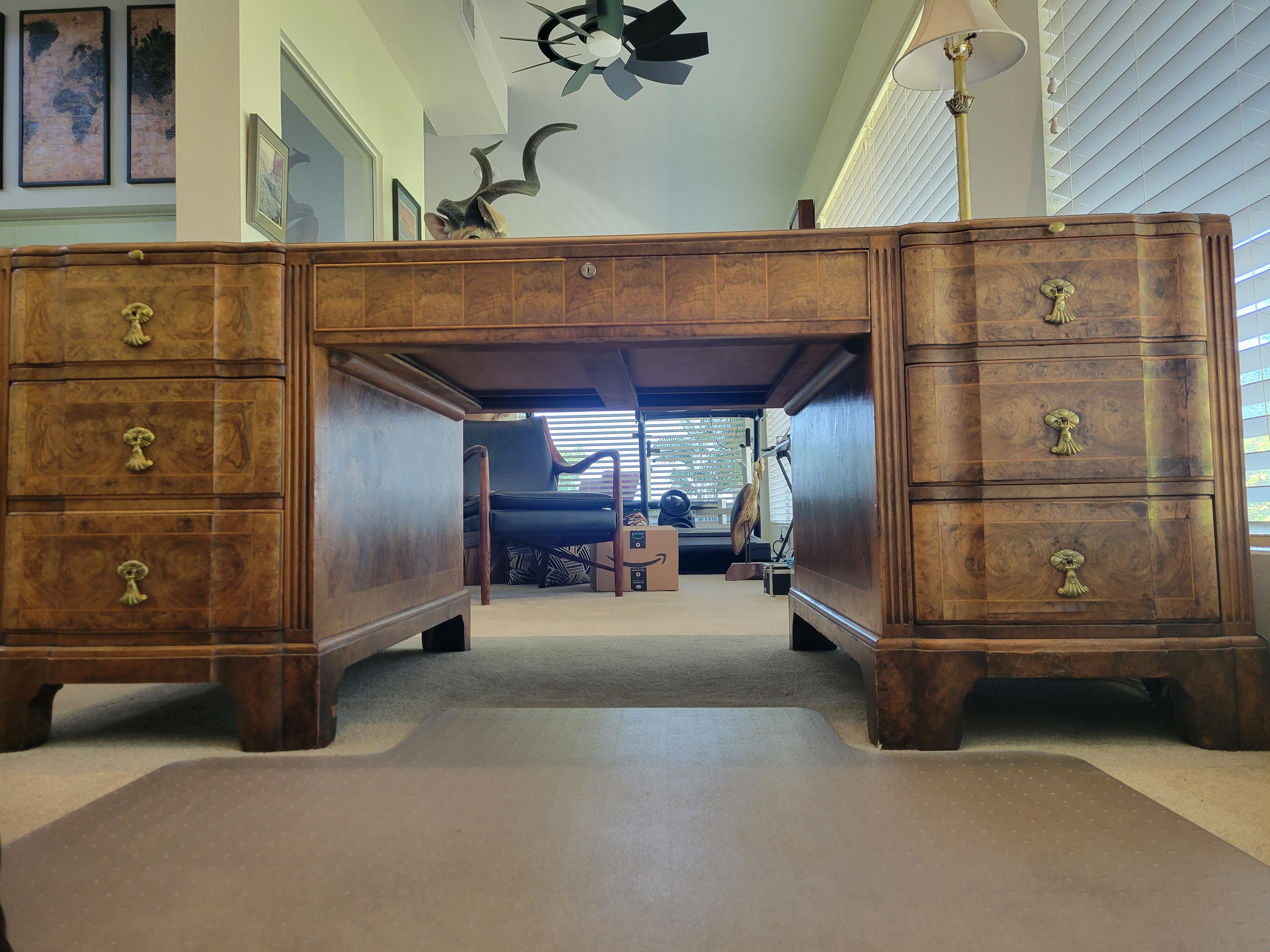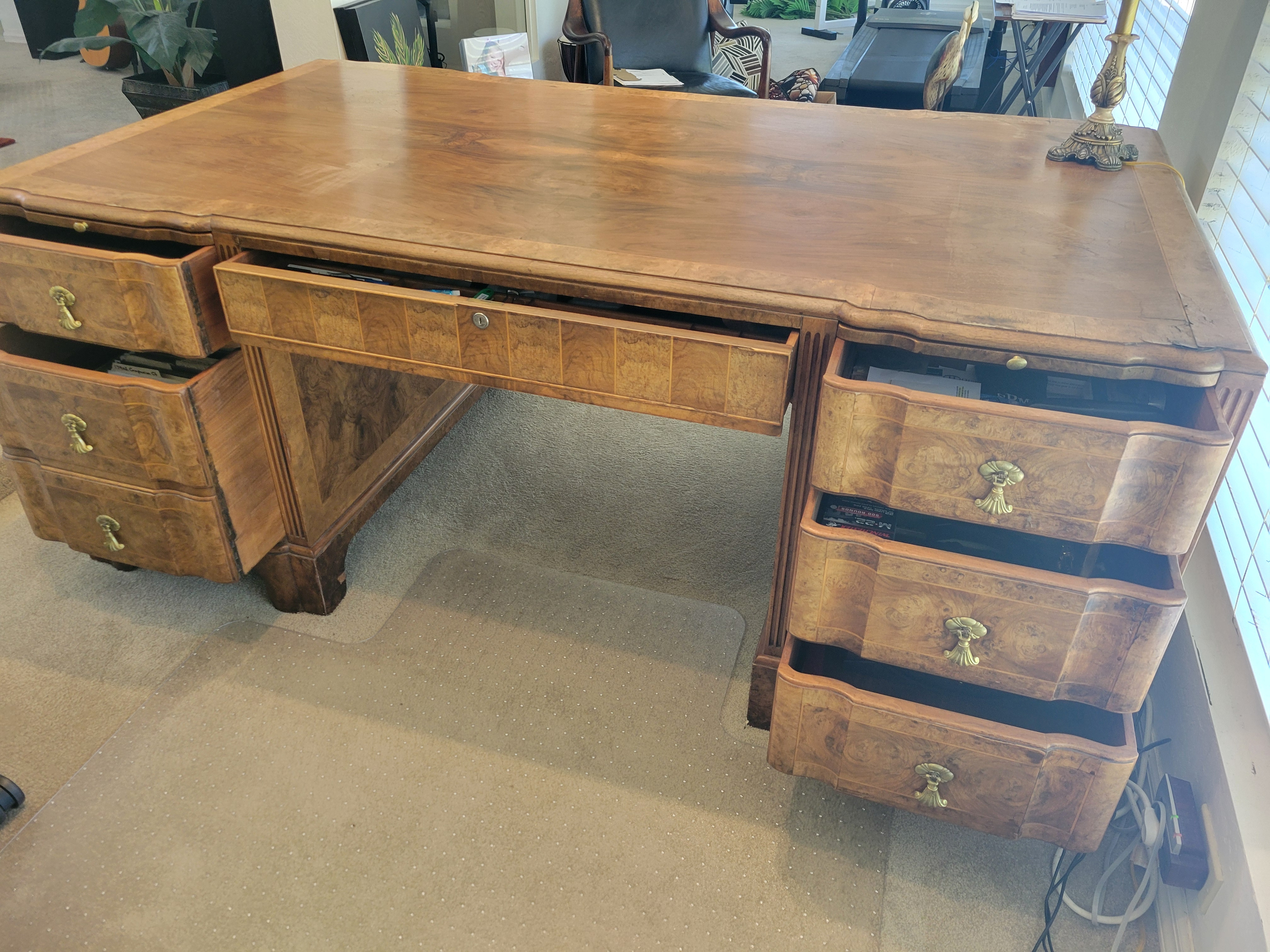 Because of the desk’s superior craftsmanship, age, and material, professional restoration is worthwhile—especially if it holds sentimental or functional value. A conservator familiar with veneer repair and antique walnut finishes is ideal.
