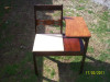 Beautiful antique piece. Wood is still good and has beautifully sculpted wrought iron legs. Chair still moves up and down great!