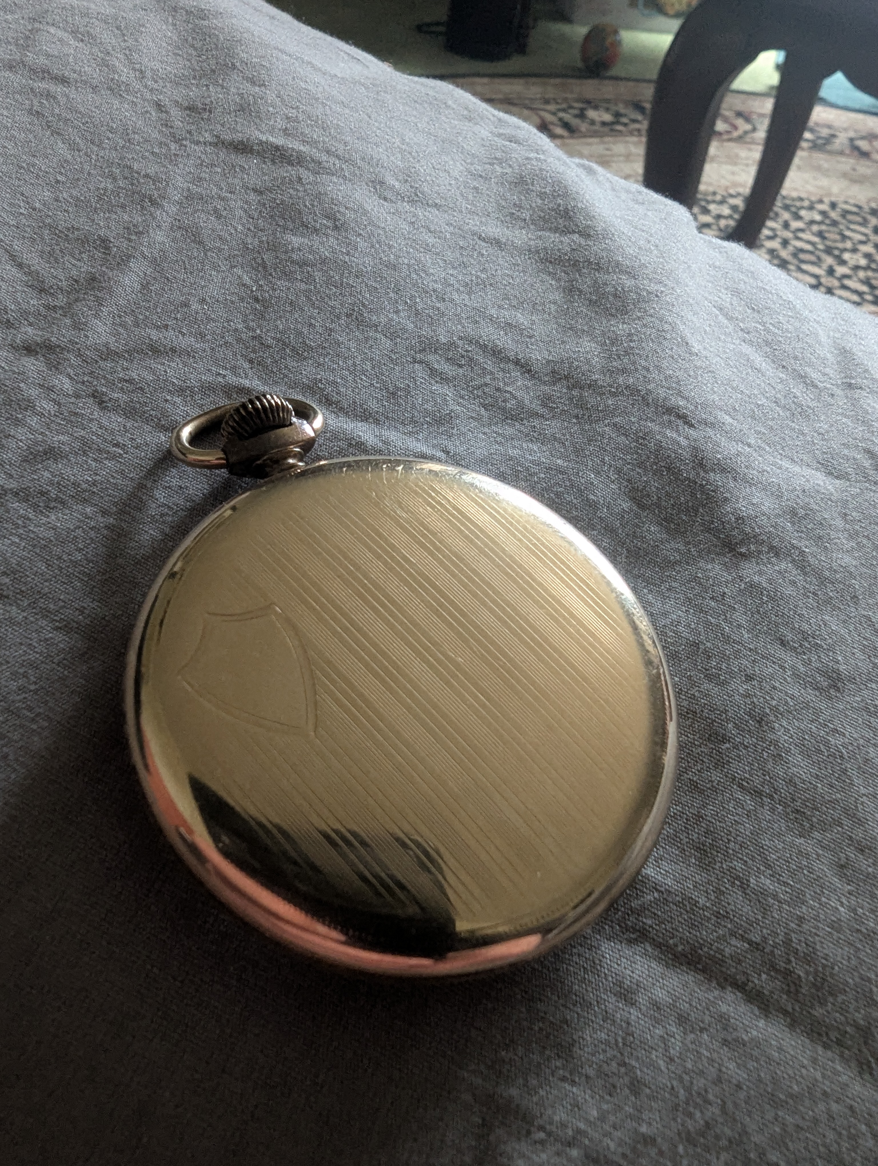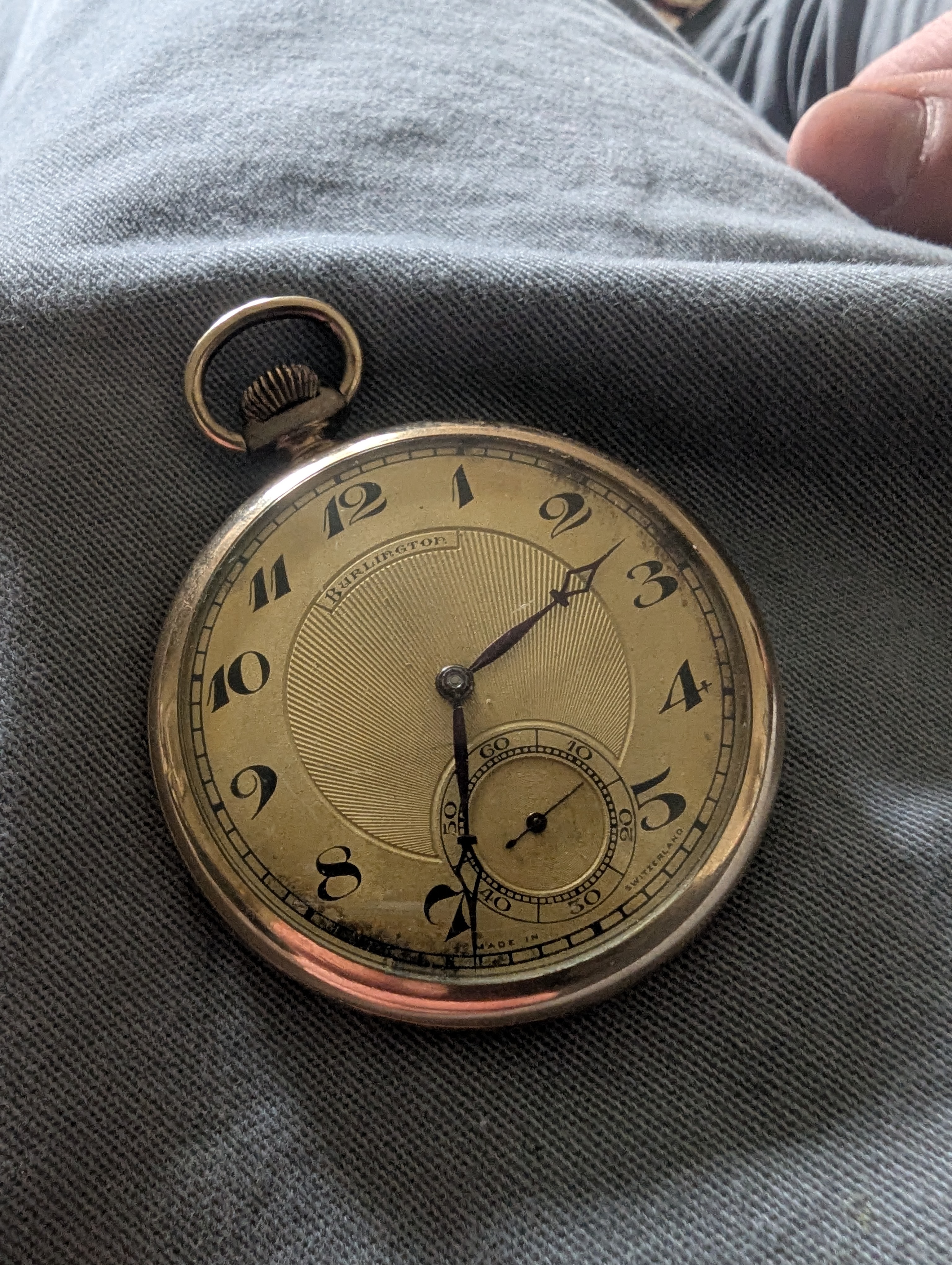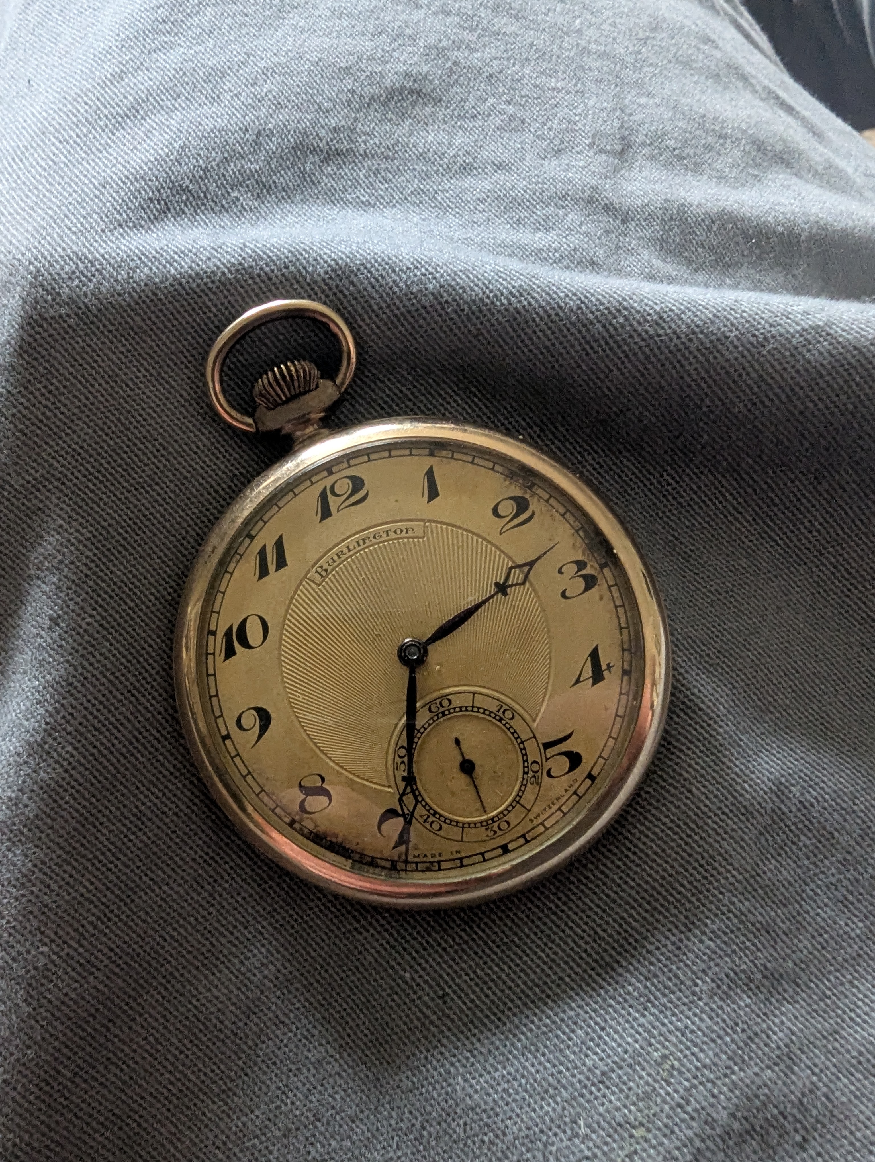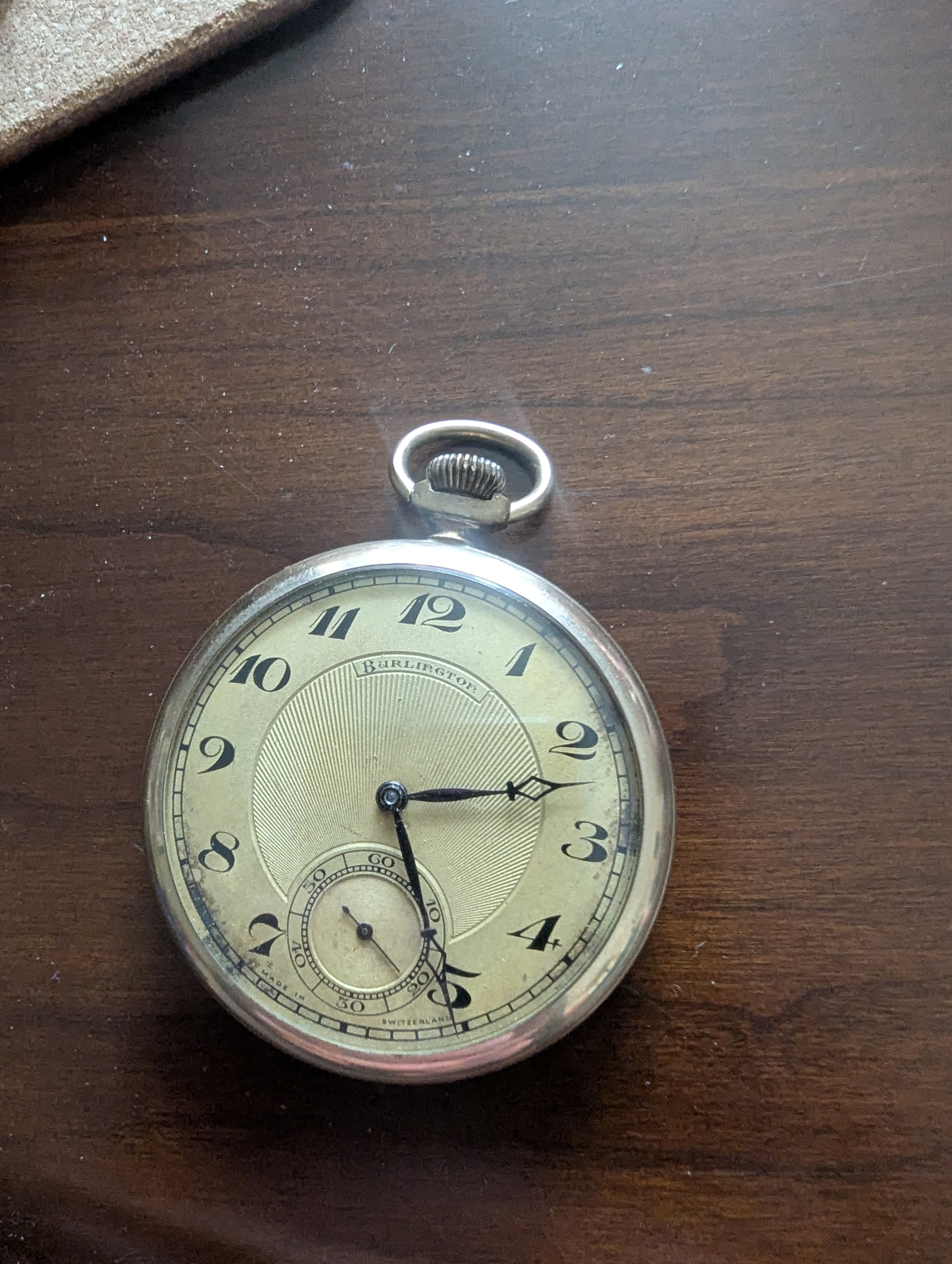 Burlington Open-Face Pocket Watch. Made by Burlington. Dating to Circa 1910-1920. Materials: Silver-toned case, gilt dial. Estimated value: $150 – $250. Condition: Very Good. The market for vintage pocket watches is currently moderate, with rising interest among collectors.