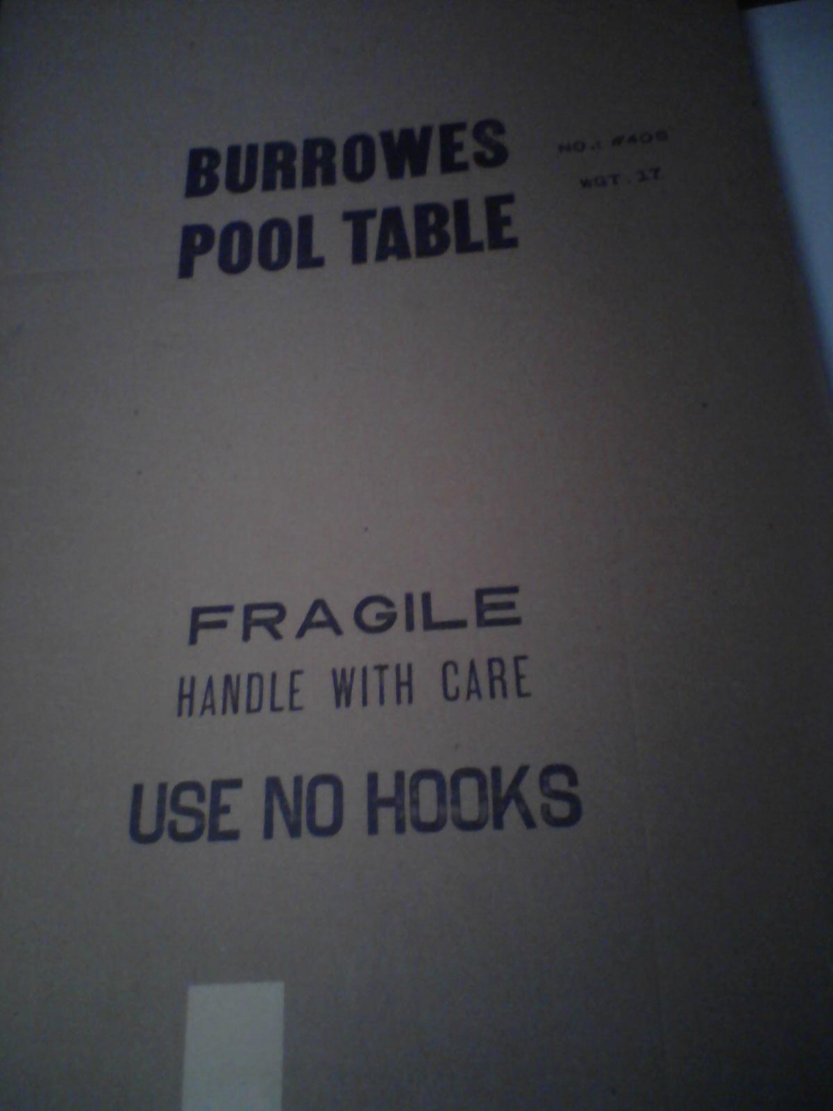 Burrowes corporation folding pool table. About 3 1/2 feet by 2 feet. Model number 405. Good condition. Have original box and instructions. Looks old.
