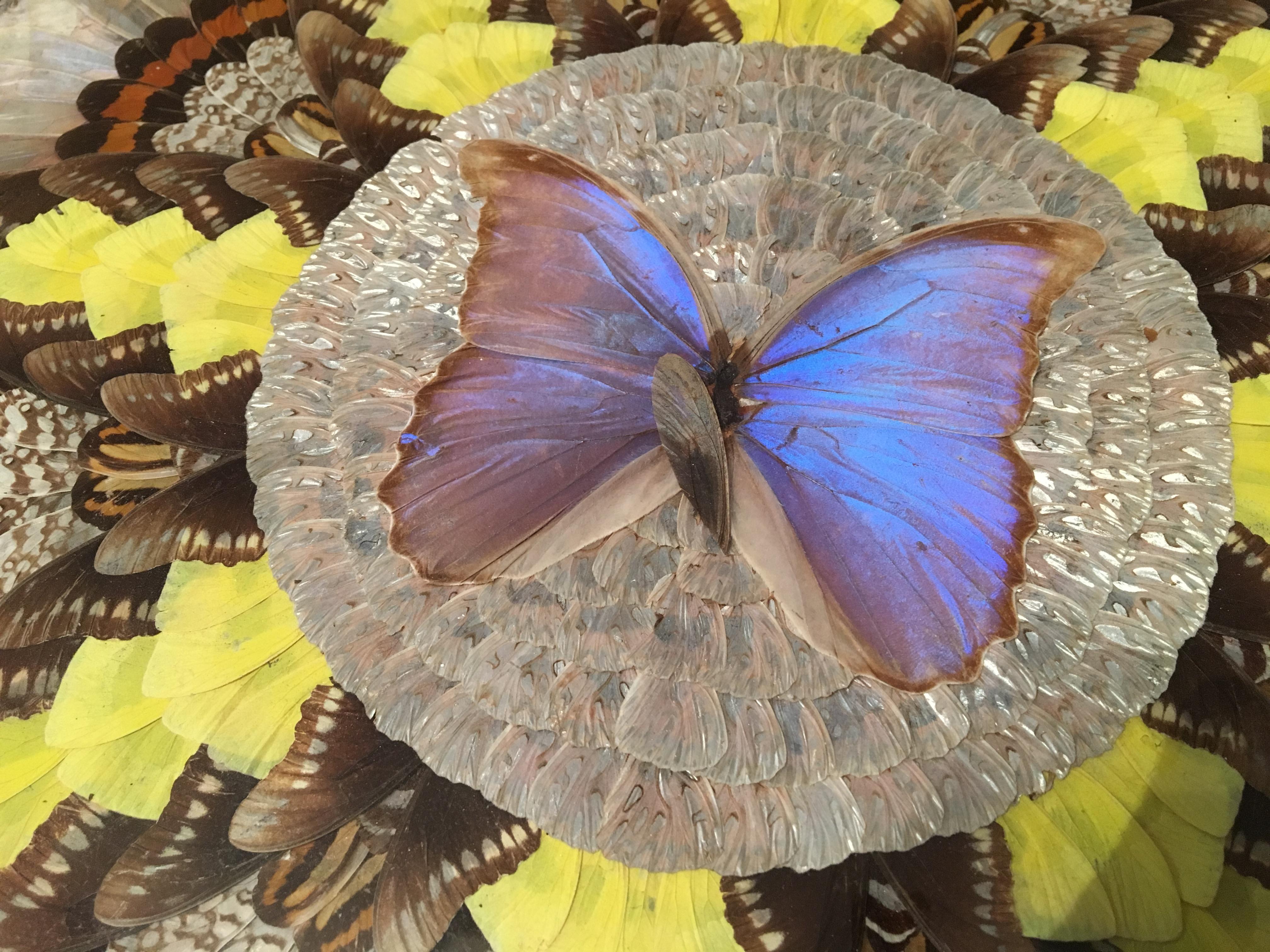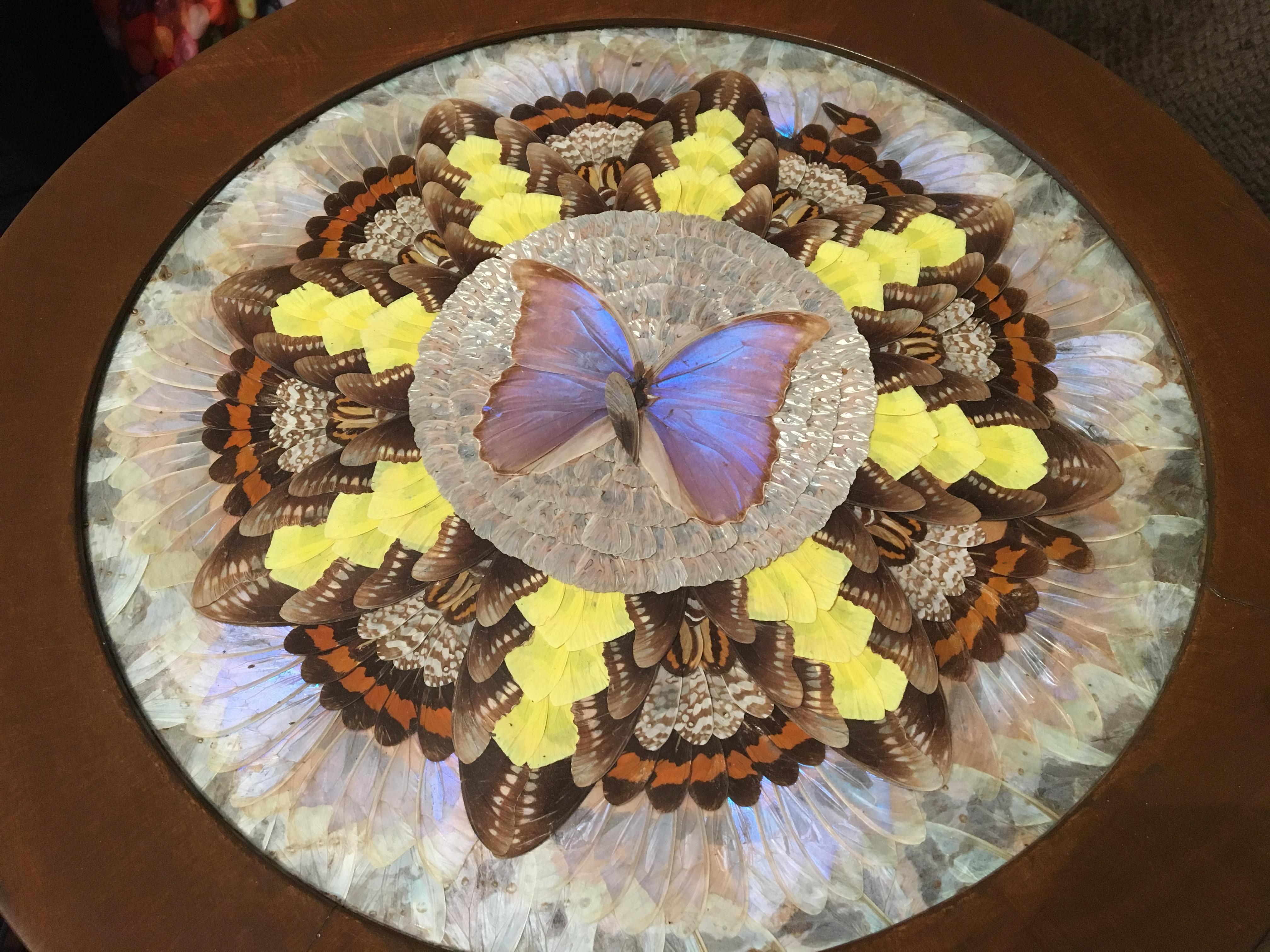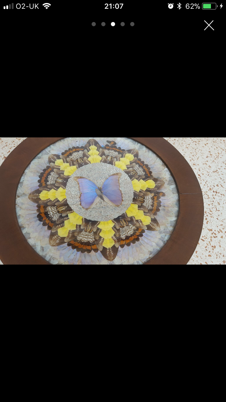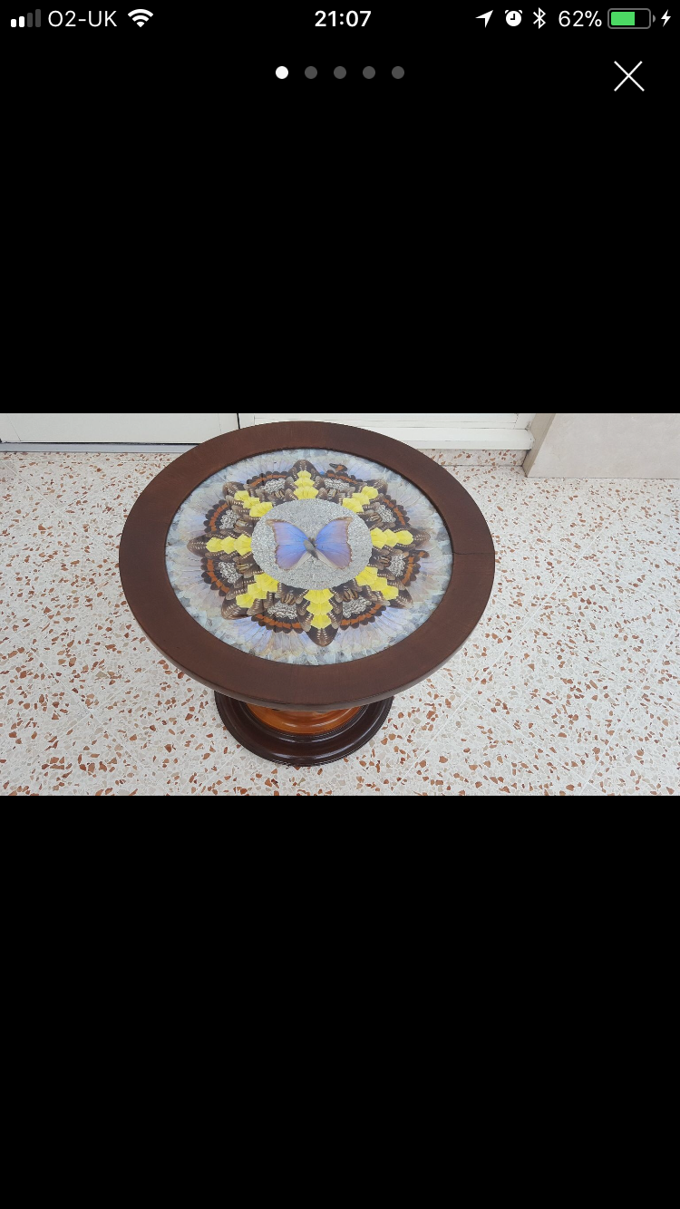 I believe this is a Brazilian butterfly taxidermy table. I don’t know much else about this item and no idea if it’s worth so would appreciate any input anyone can give. As you can see there is also 2 wings out of place. Thanx