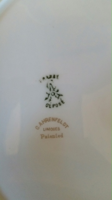 I inherited this set from my grandmother. There are two stamps on the bottom of each plate: (1) France-CA-Depose and (2) C Ahrenfeldt - Limoges - Patented. They have been rarely used and are in excellent condition. There are wide gold bands on the perimeter rims, along with hand painted flowers. In the center are more hand-painted flowers. I have included two photos but can take more if desired.