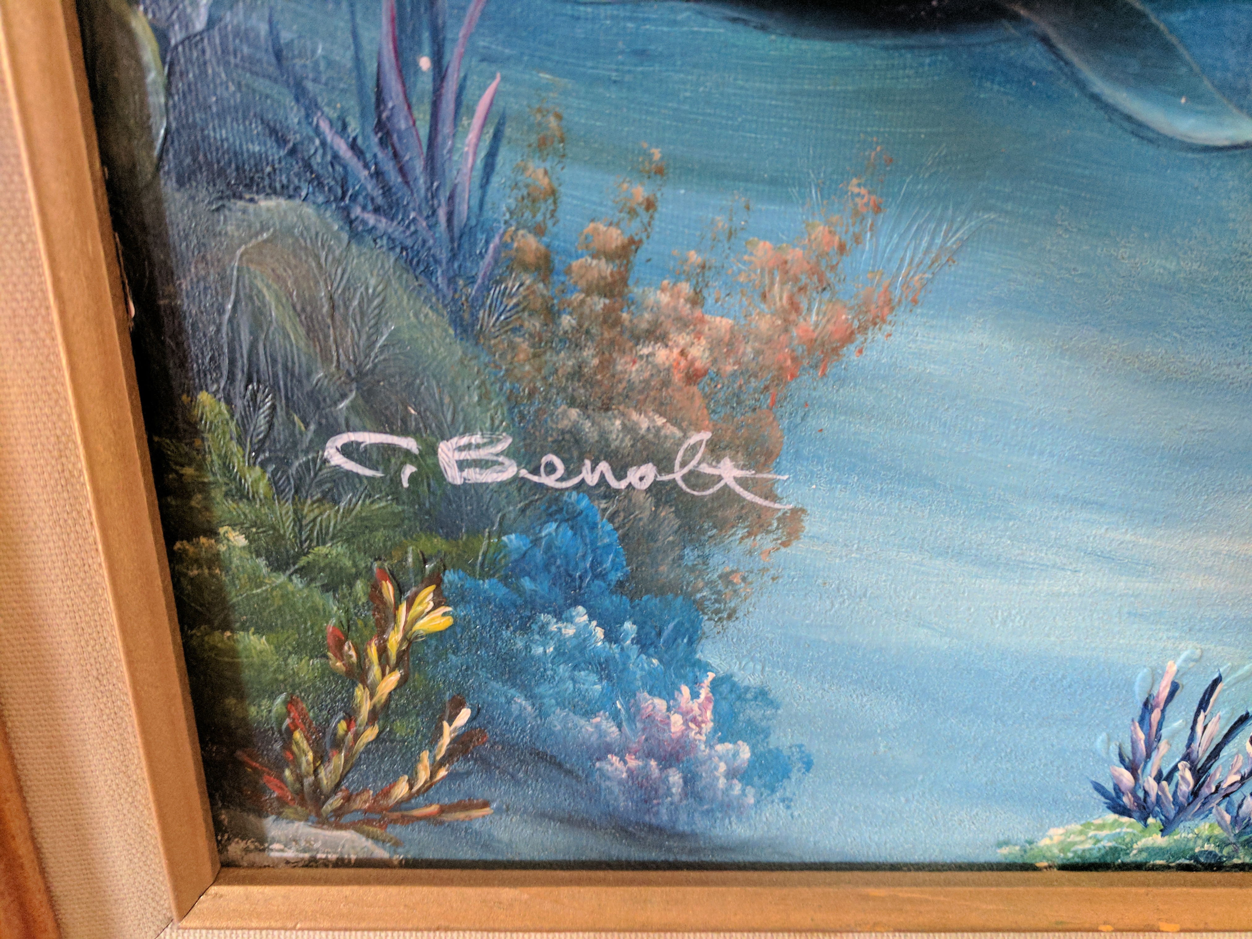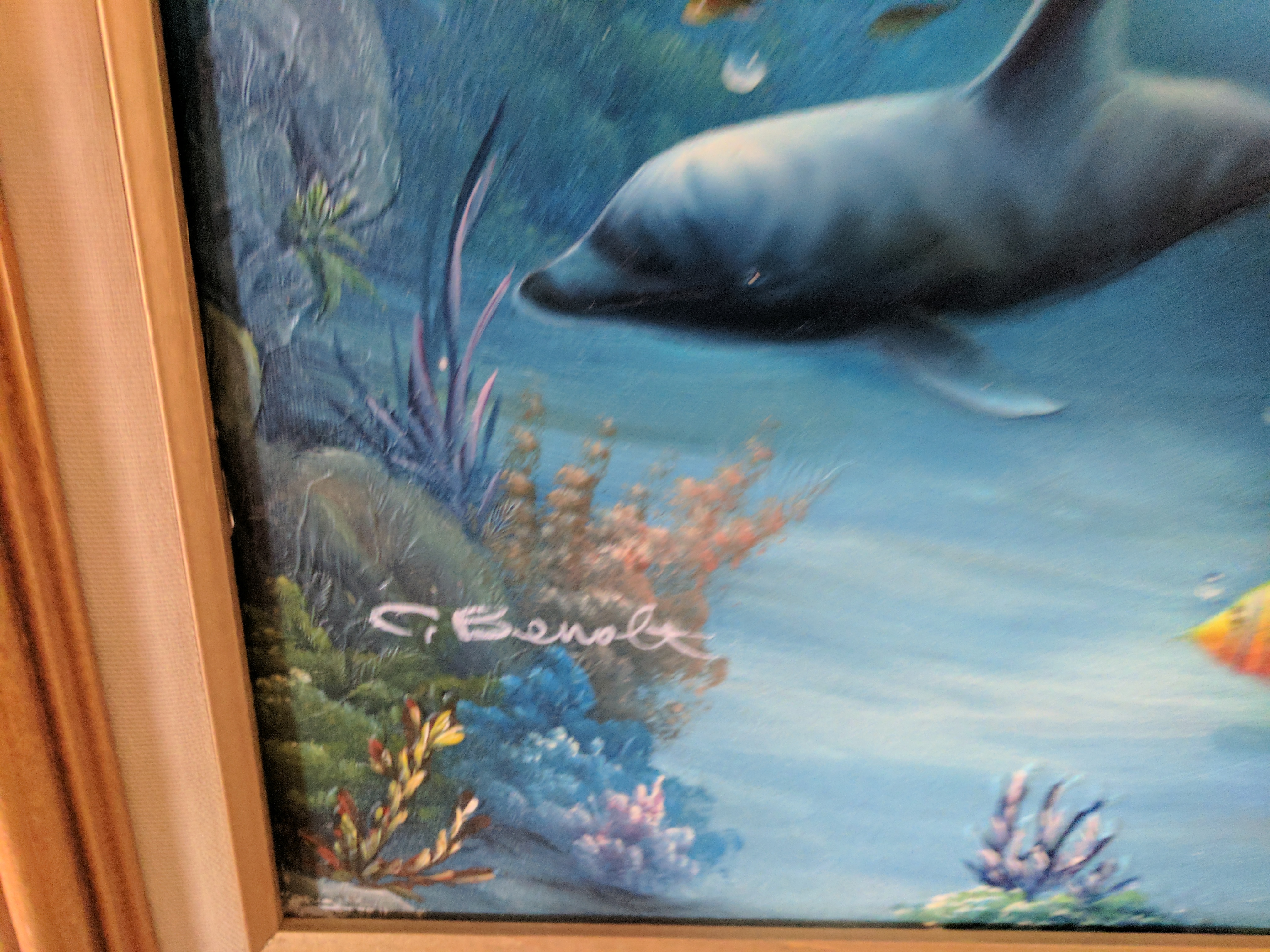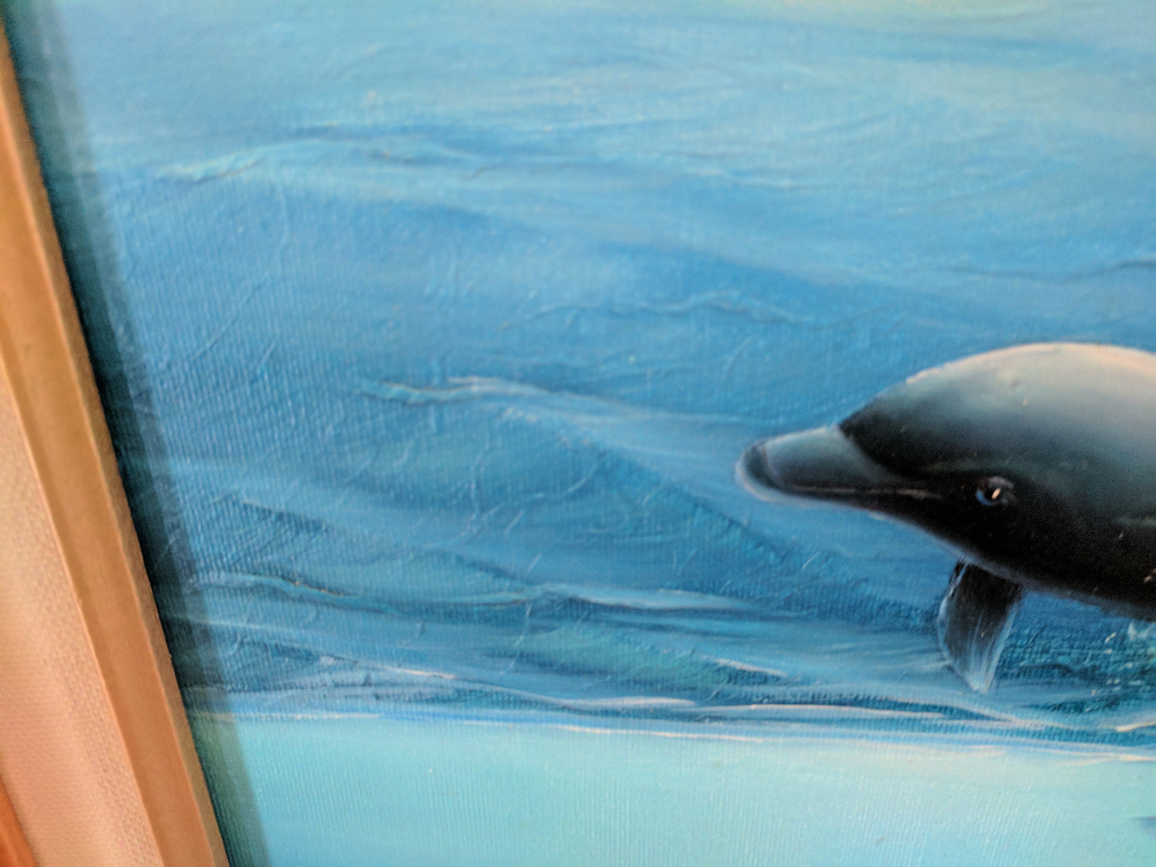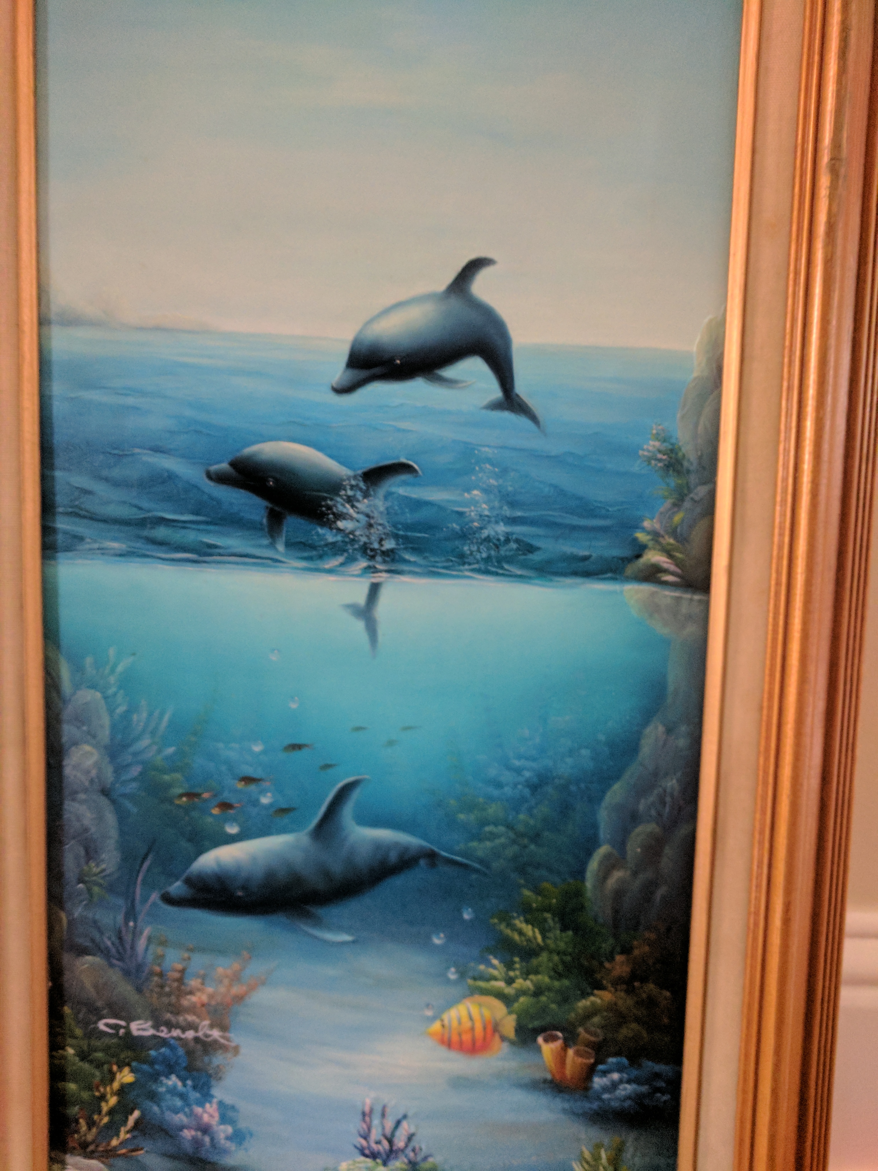 3-D painting effect by C. Benolt.  Signature in lower left corner.  Size 12 inches wide X 24 inches tall.  Vibrant colors. Three dolphins, two above water, one below. In great shape. Do not know the age.