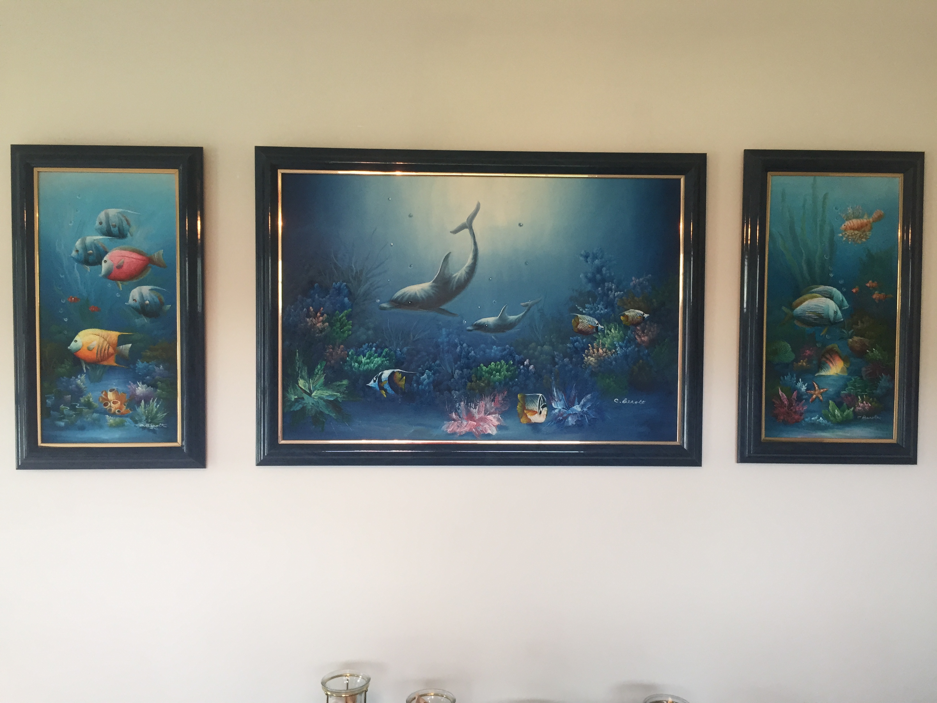 One 24 x 36 C. Benolt raised oil painting with 2 dolphins and topical fish.