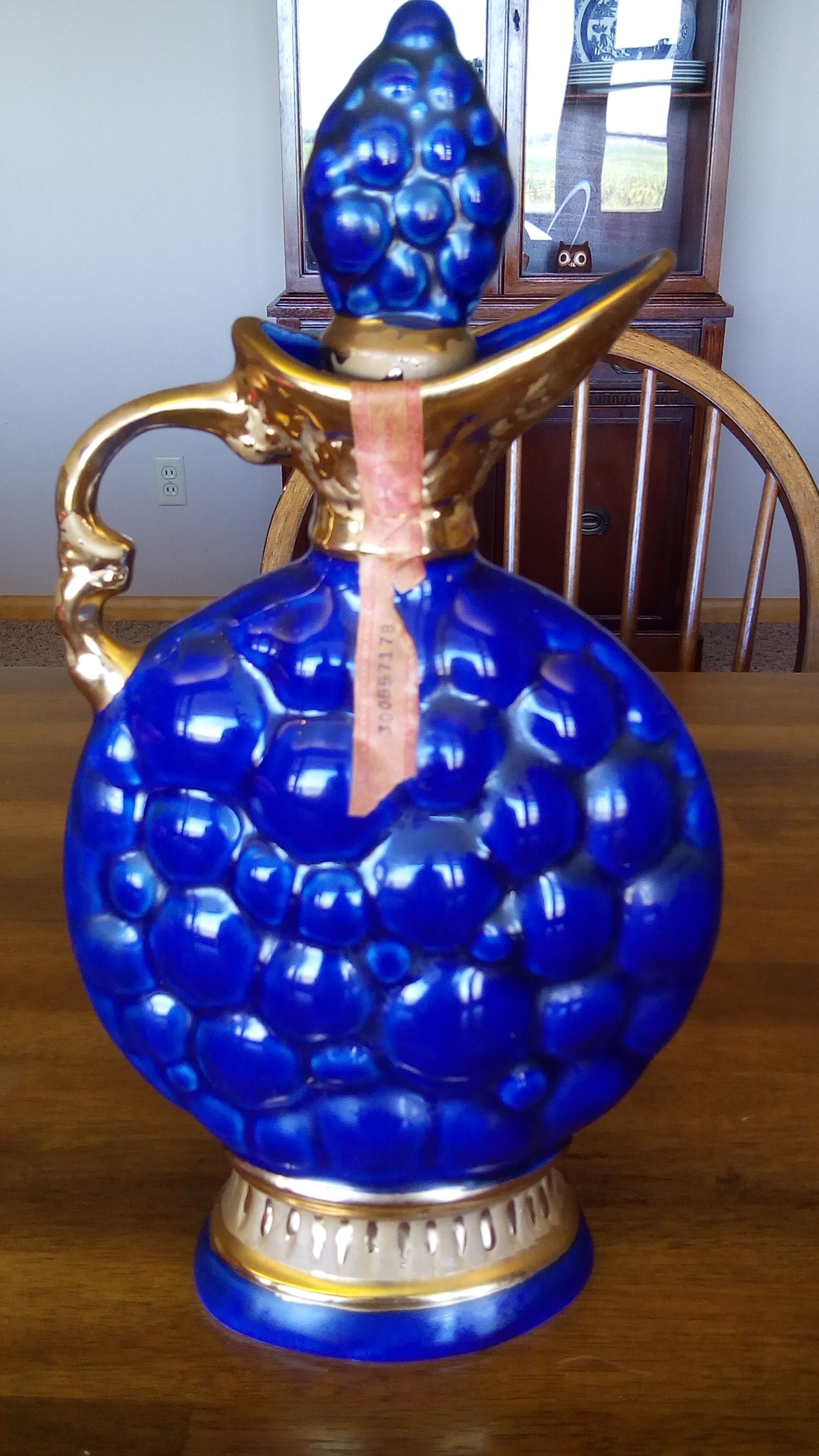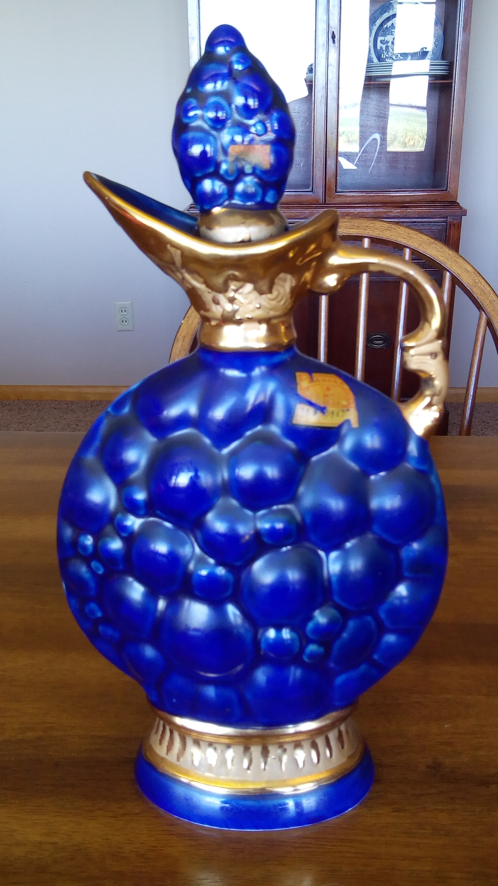Dark blue with gold handle, neck, and base ring.