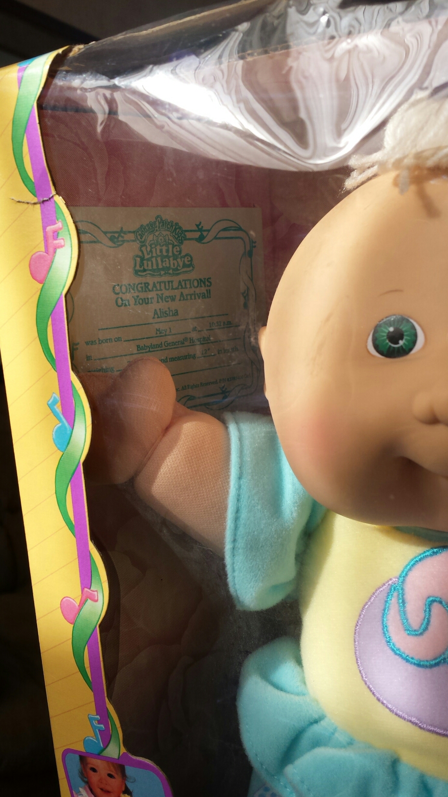 I have a Little Lullabye Cabbage Patch Kids doll. Her name is Alisha, blonde hair and green eyes. She has a music box, and sings. It's in its original box which is in very good condition. Never been removed from the box, though the top of the box has been opened. The box says copyright 1991.